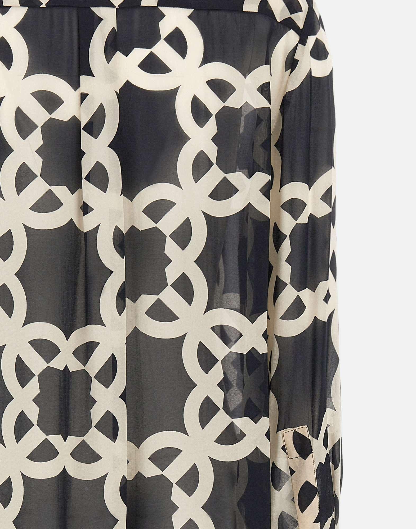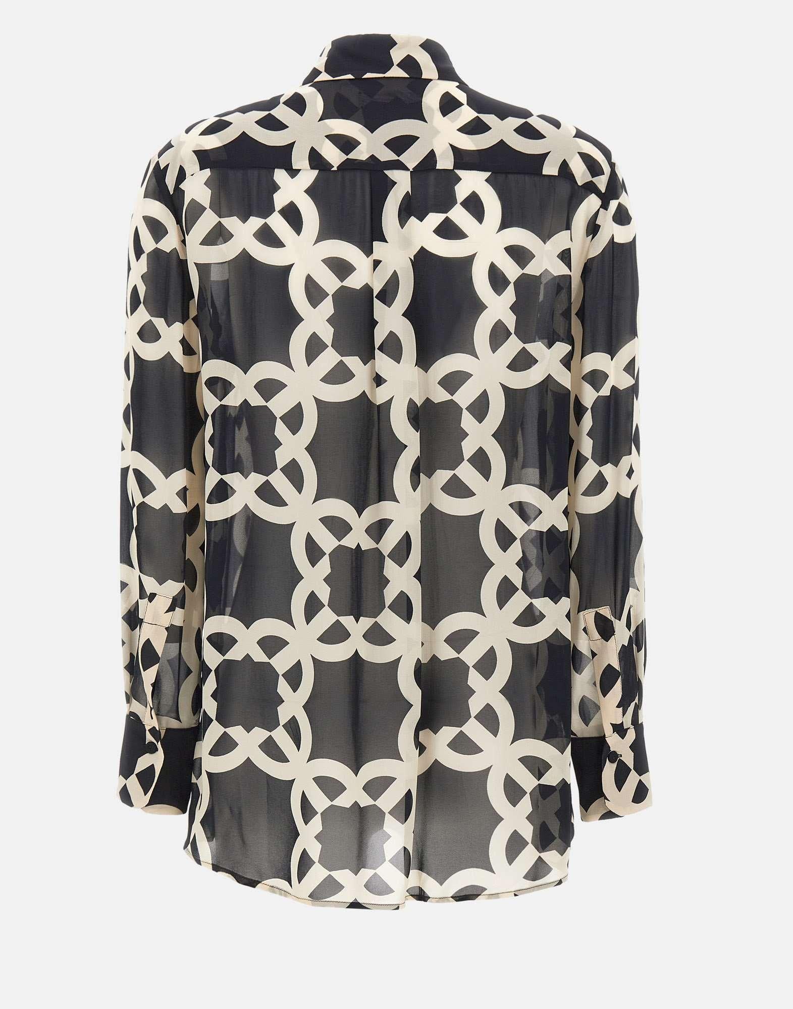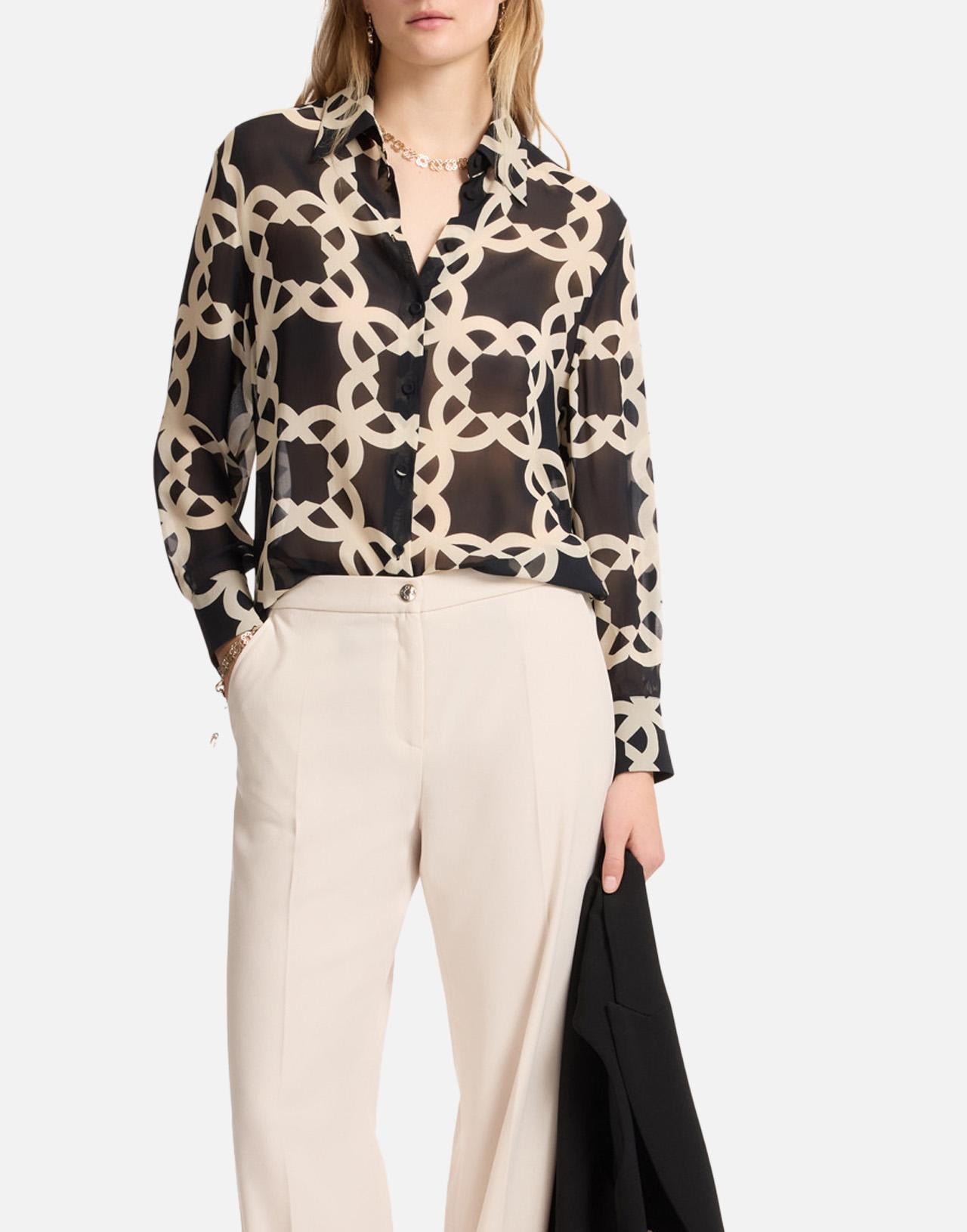 Camicia Elena Mirò in morbida viscosa, caratterizzata da una raffinata fantasia geometrica nei toni del beige e del nero. Presenta colletto classico, maniche lunghe con polsini e bottoni in tinta, chiusura frontale con bottoni rivestiti tono su tono. Vestibilità regular, perfetta per look eleganti e contemporanei.