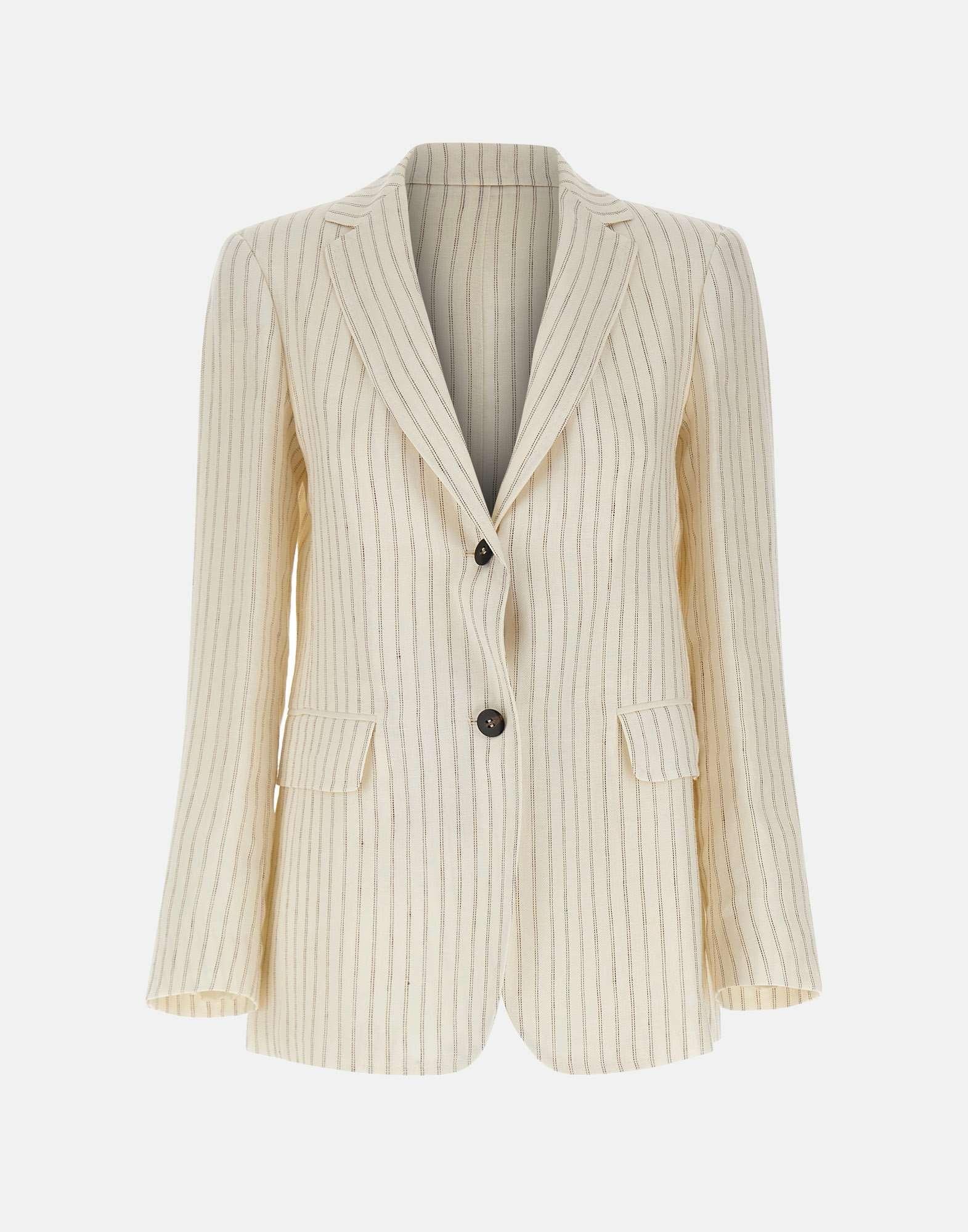 Blazer donna Max Mara Studio realizzato in lino color panna con motivo gessao marrone, modello monopetto dalla linea dritta leggermente sfiancata e vestibilità regular fit. Il design presenta collo a rever, maniche lunghe a giro con bottoni sul fondo e chiusura frontale con due bottoni a contrasto che definiscono l'eleganza sartoriale del capo. Completano il blazer le tasche a filetto orizzontale con patta applicata sul davanti e lo spacco centrale sul retro, mentre la costruzione semifoderata assicura comfort e una caduta naturale. Made in Italy.