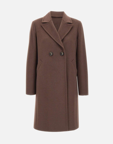 Cappotto donna Kaos, color testa di moro, modello a doppiopetto con due bottoni e design essenziale. Presenta scollo con rever, tasche laterali con filettone e un taglio dritto che assicura una vestibilità regolare e confortevole. Un capo versatile e raffinato, perfetto per completare look quotidiani ed eleganti. Made in Italy.