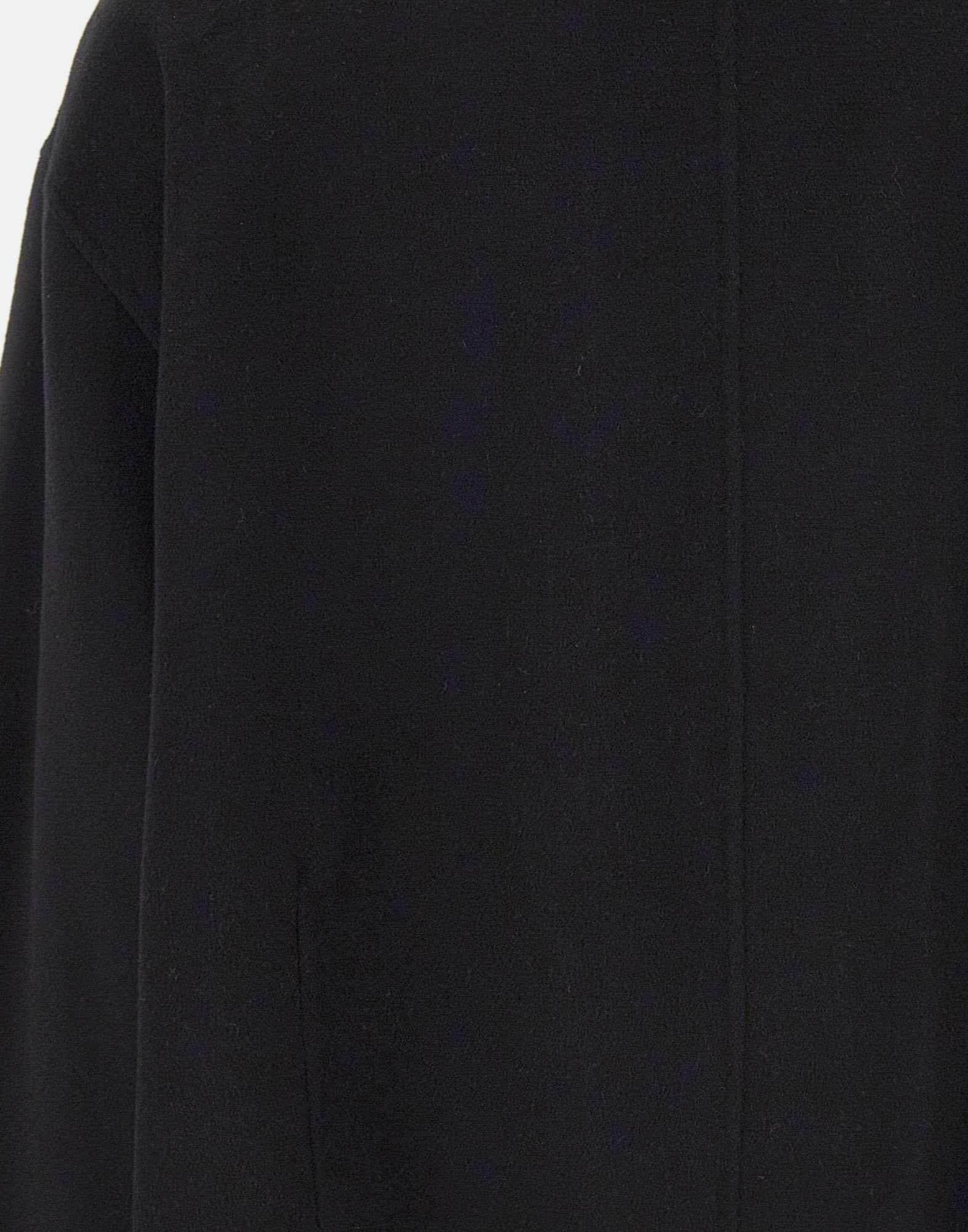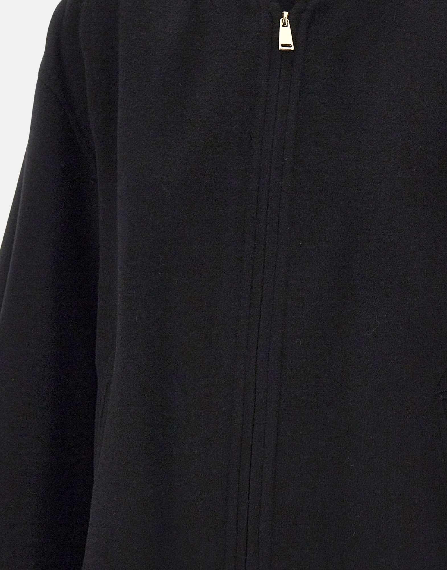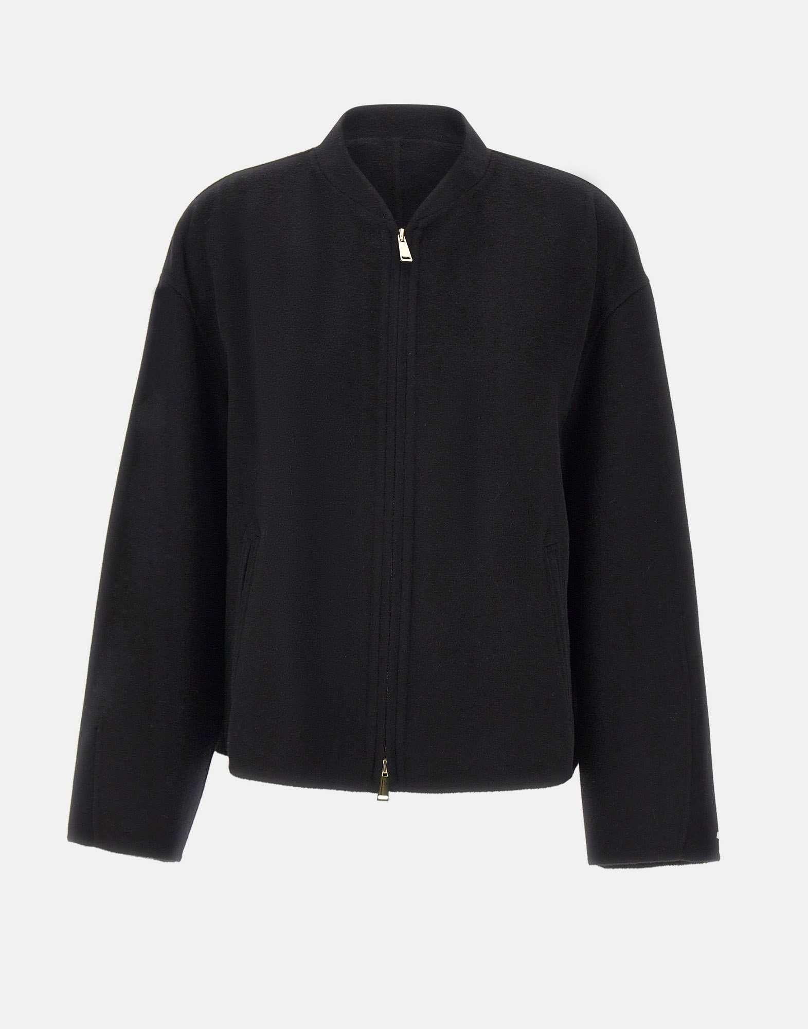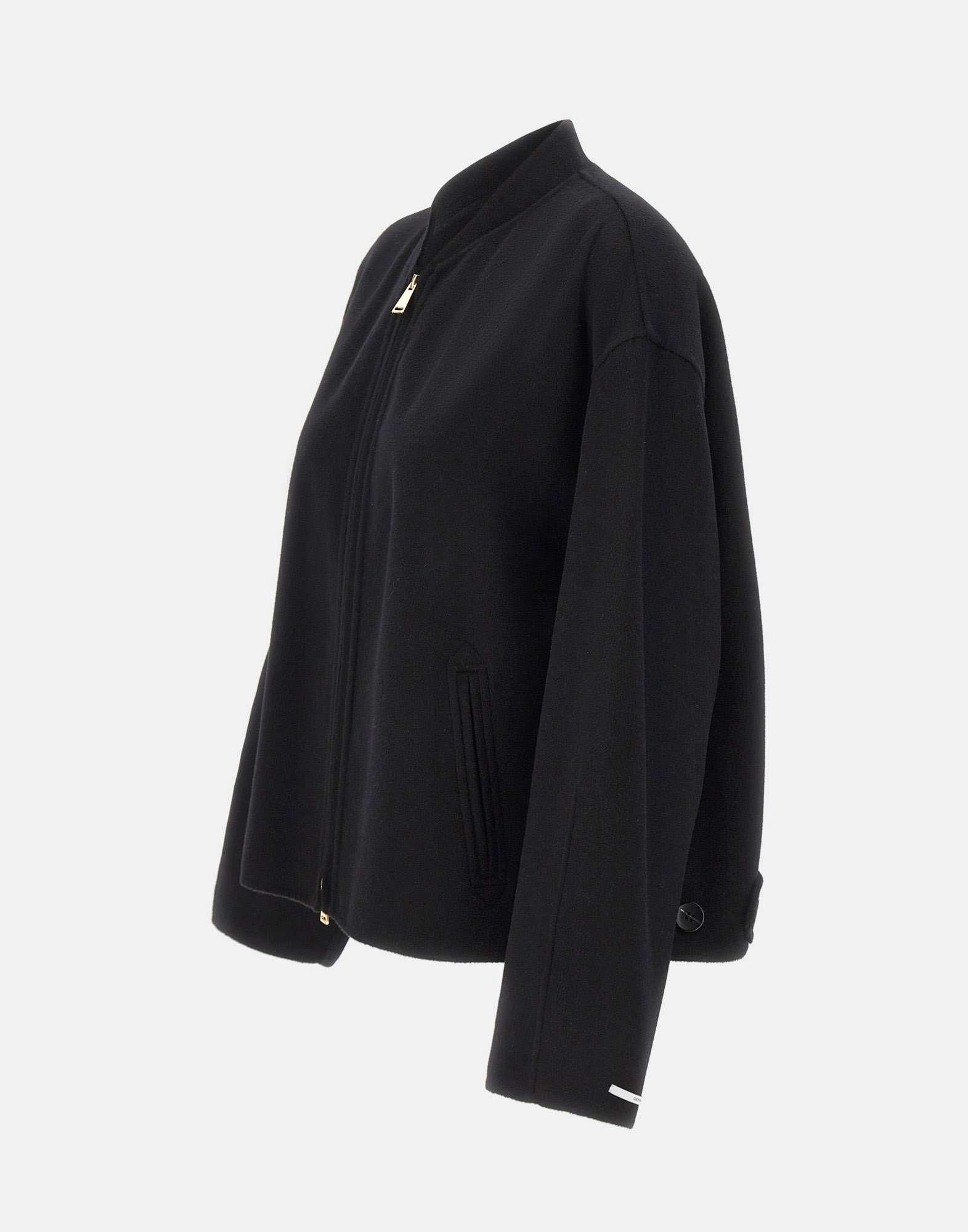 Giacca bomber donna Marella "Giga" realizzata in 100% lana vergine color nero. Il modello presenta collo a fascetta, chiusura frontale con full zip a doppio cursore e tasche laterali a filetto. La spalla scesa e gli alamari sul fondo aggiungono un dettaglio ricercato che valorizza la silhouette. Un bomber in pura lana che interpreta il trend di stagione con eleganza e versatilità, ideale sia per look business sia per momenti casual.