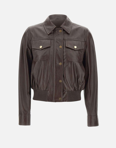 Giacca donna Max Mara Studio "Biada" realizzata in morbida nappa color testa di moro, trattata con finitura effetto vissuto per un look sofisticato e contemporaneo. Modello bomber con bordo elastico, linea dritta e vestibilità regolare, ideale per completare il guardaroba con un capo in pelle versatile. Presenta colletto a camicia, polsini con bottone e chiusura frontale con zip e bottoni a pressione logati dorati. Sul petto, taschini con patta e bottone che aggiungono un dettaglio funzionale. Foderata per un comfort ottimale.