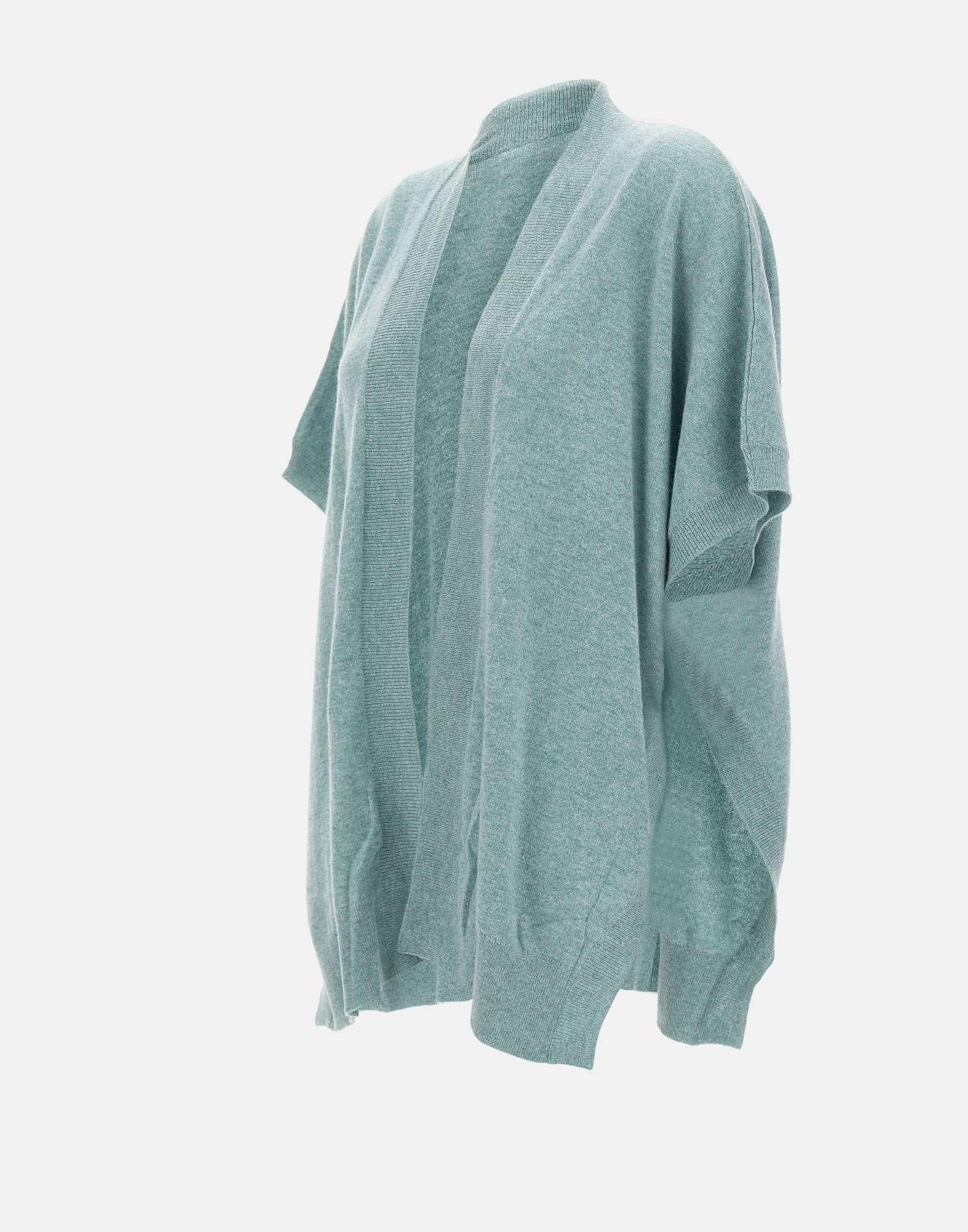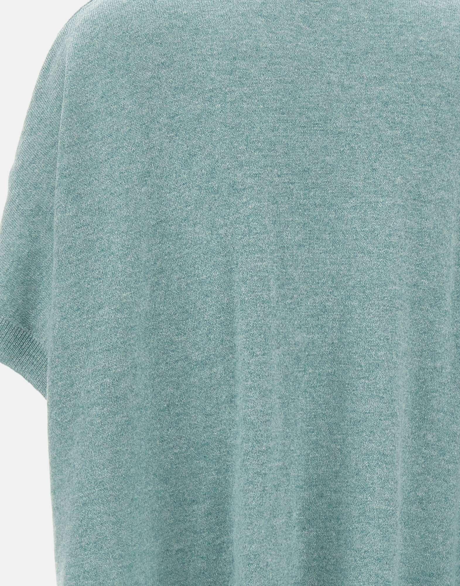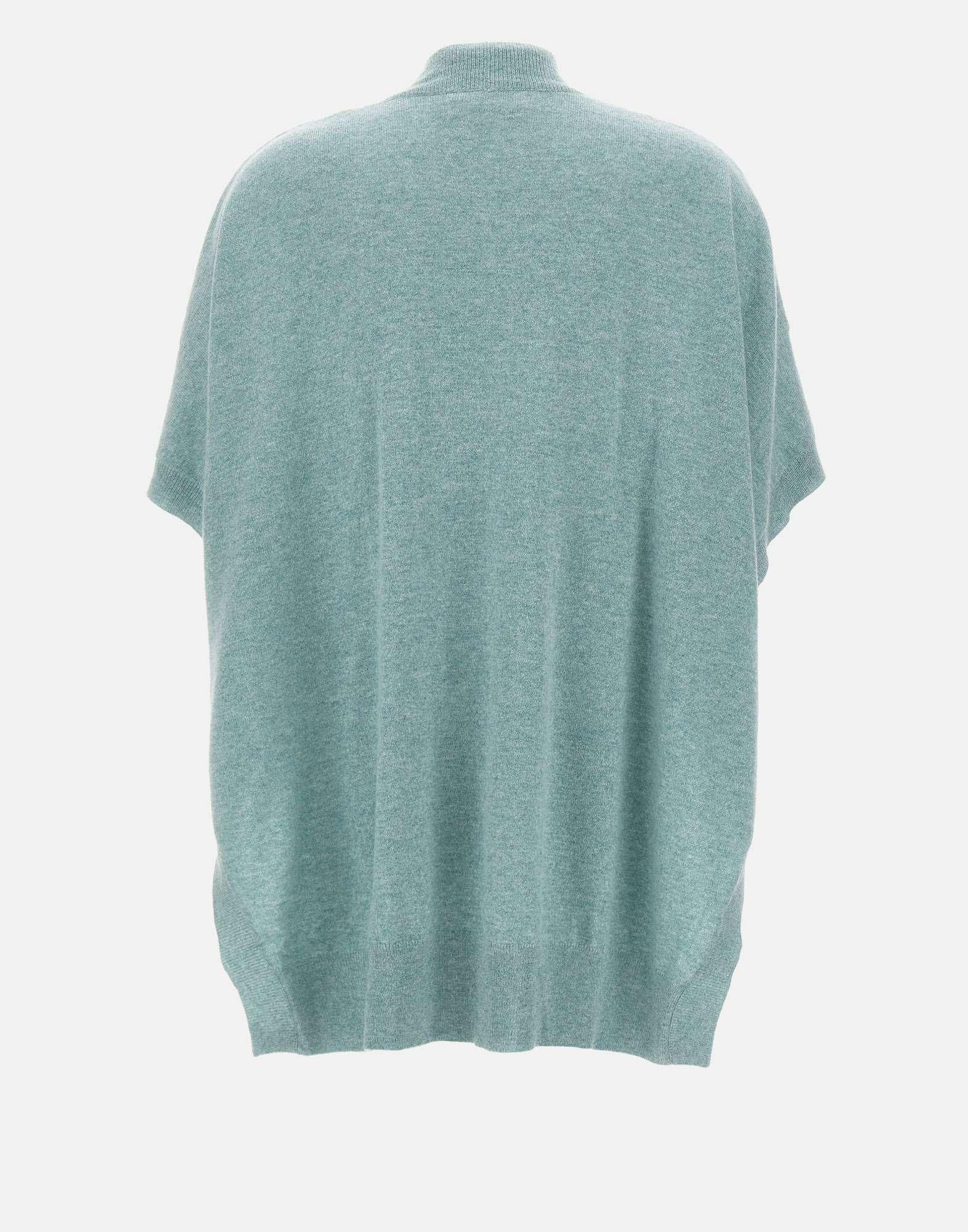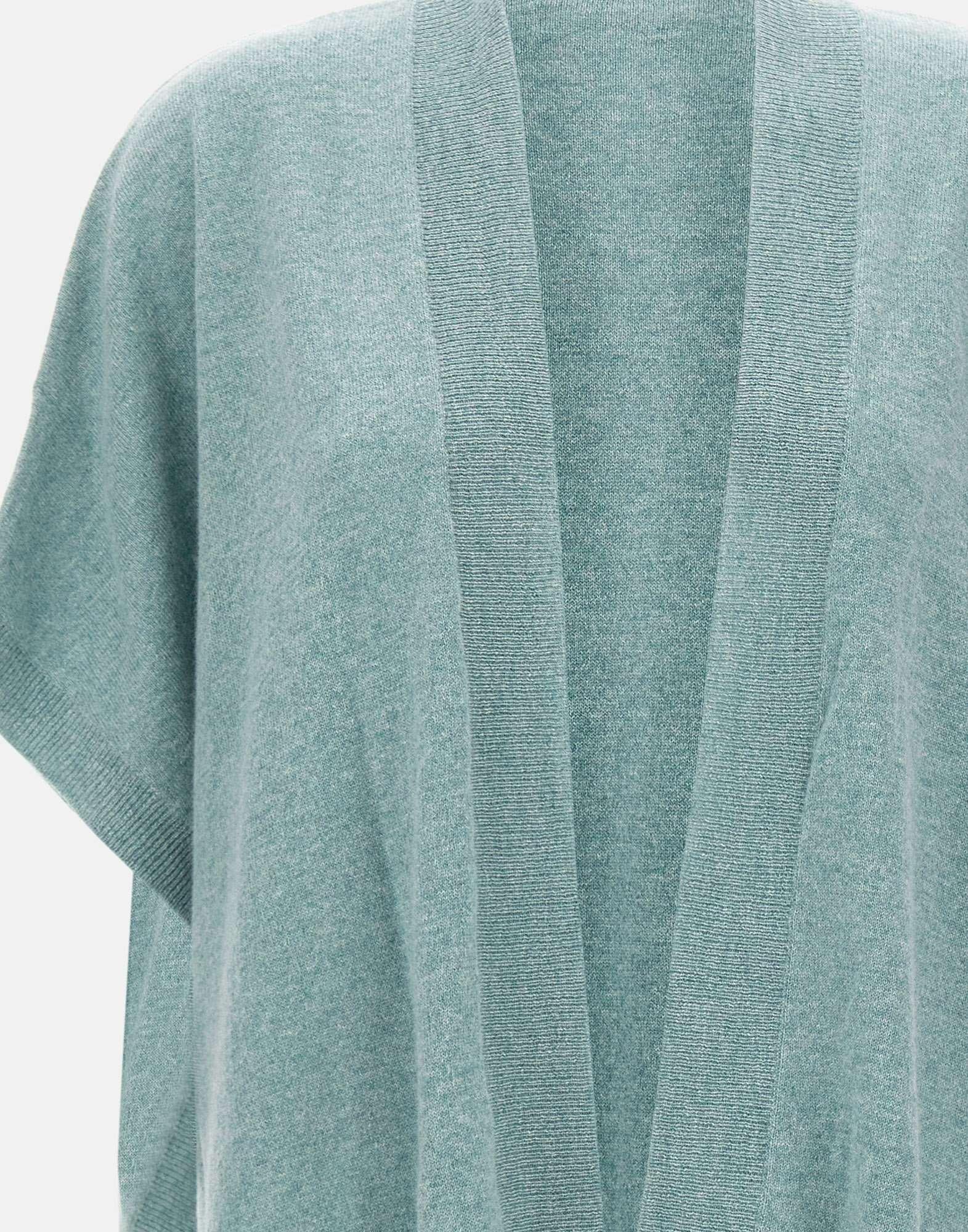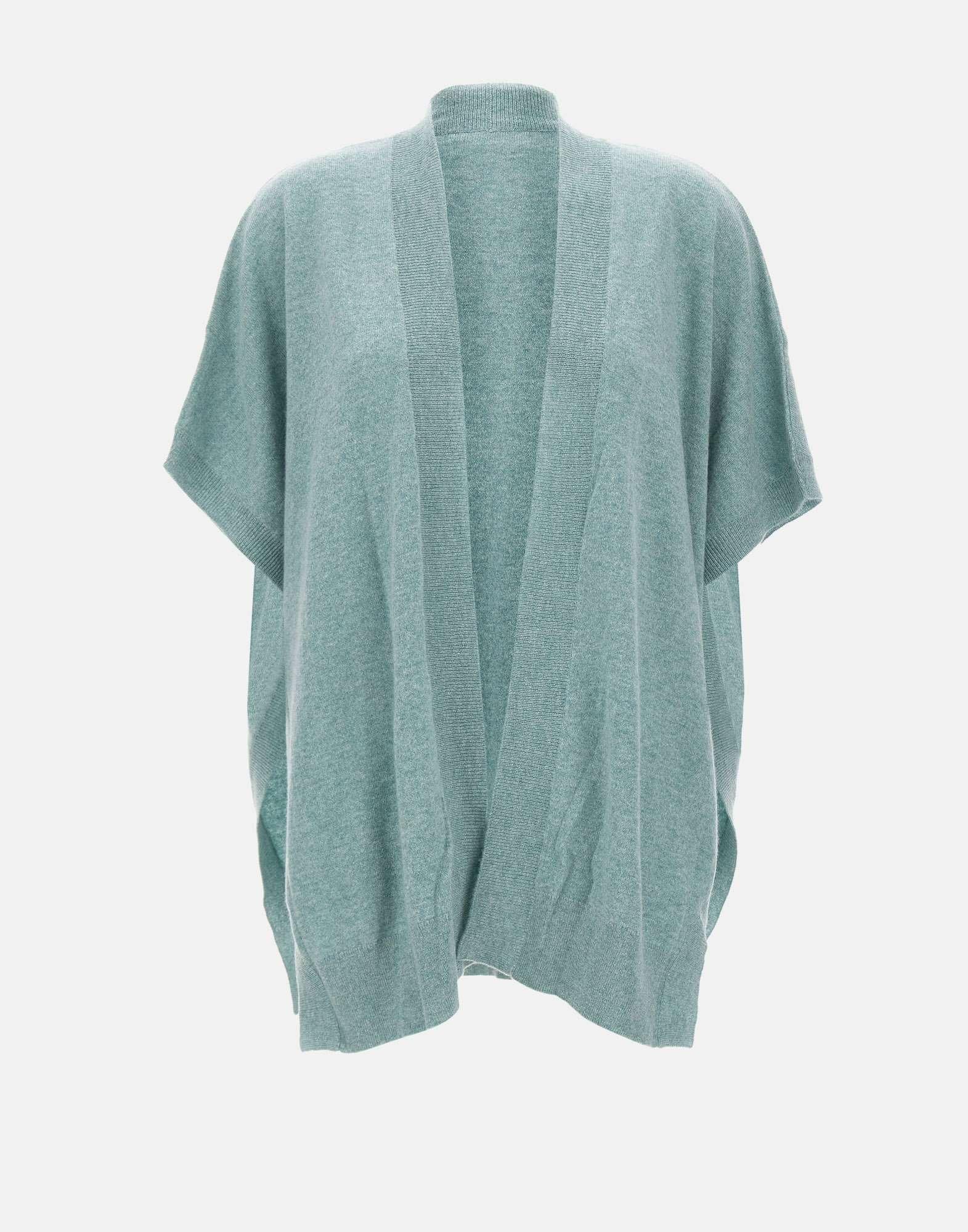 Mantella donna Notshy Cashmere "Hallie" in puro cashmere 100% color verde acquamarina, dal design elegante e avvolgente. Caratterizzata da scollo con revers e orli a costine, può essere chiusa sotto le braccia grazie a pratici bottoncini, creando una silhouette morbida e strutturata. La vestibilità regolare la rende perfetta per completare con raffinatezza sia look casual che più sofisticati.