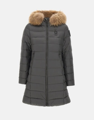 Piumino donna Blauer "Kristin" in tessuto grigio lucido, caratterizzato da trapuntatura orizzontale e taglio lungo che valorizza il punto vita. Il modello presenta cappuccio fisso con bordo in vera pelliccia removibile e interno a contrasto colore. La chiusura con zip nascosta assicura protezione dal freddo, mentre le tasche laterali con zip aggiungono praticità. Il design è completato dal patch logo glitterato sul braccio sinistro e dal passante logato sul petto, dettagli iconici della maison.