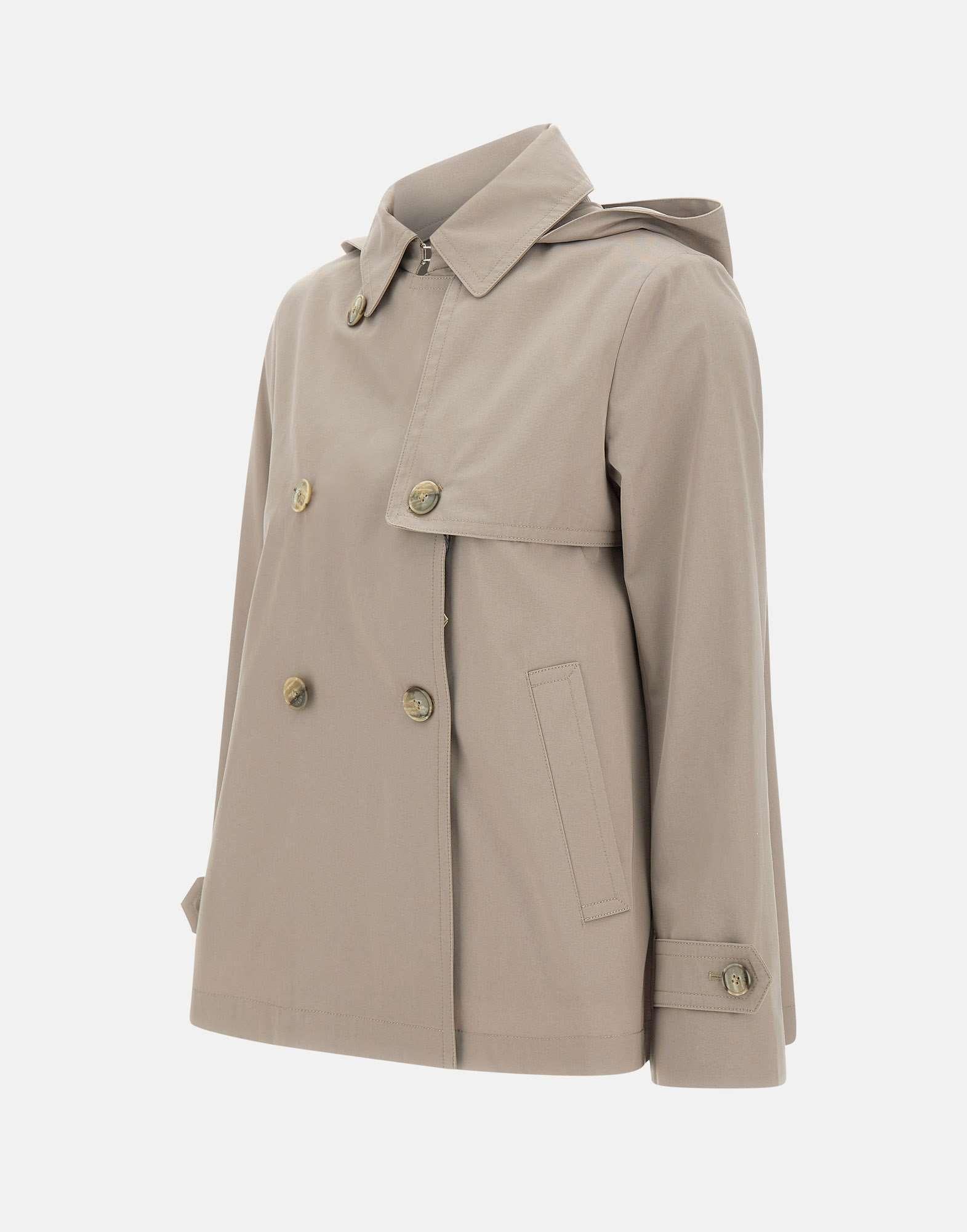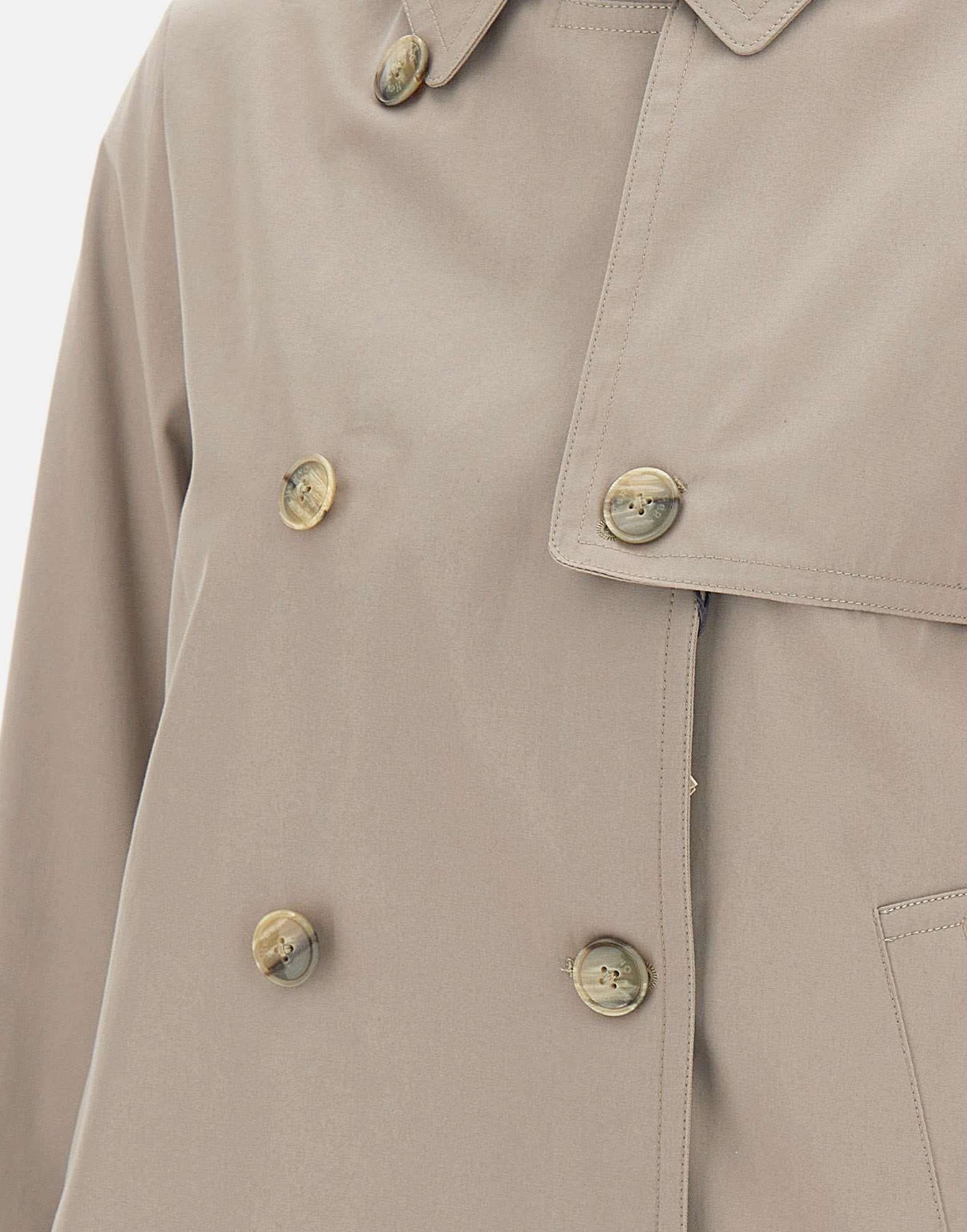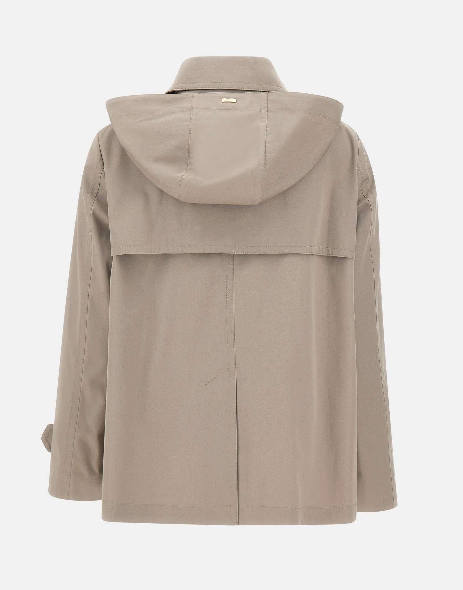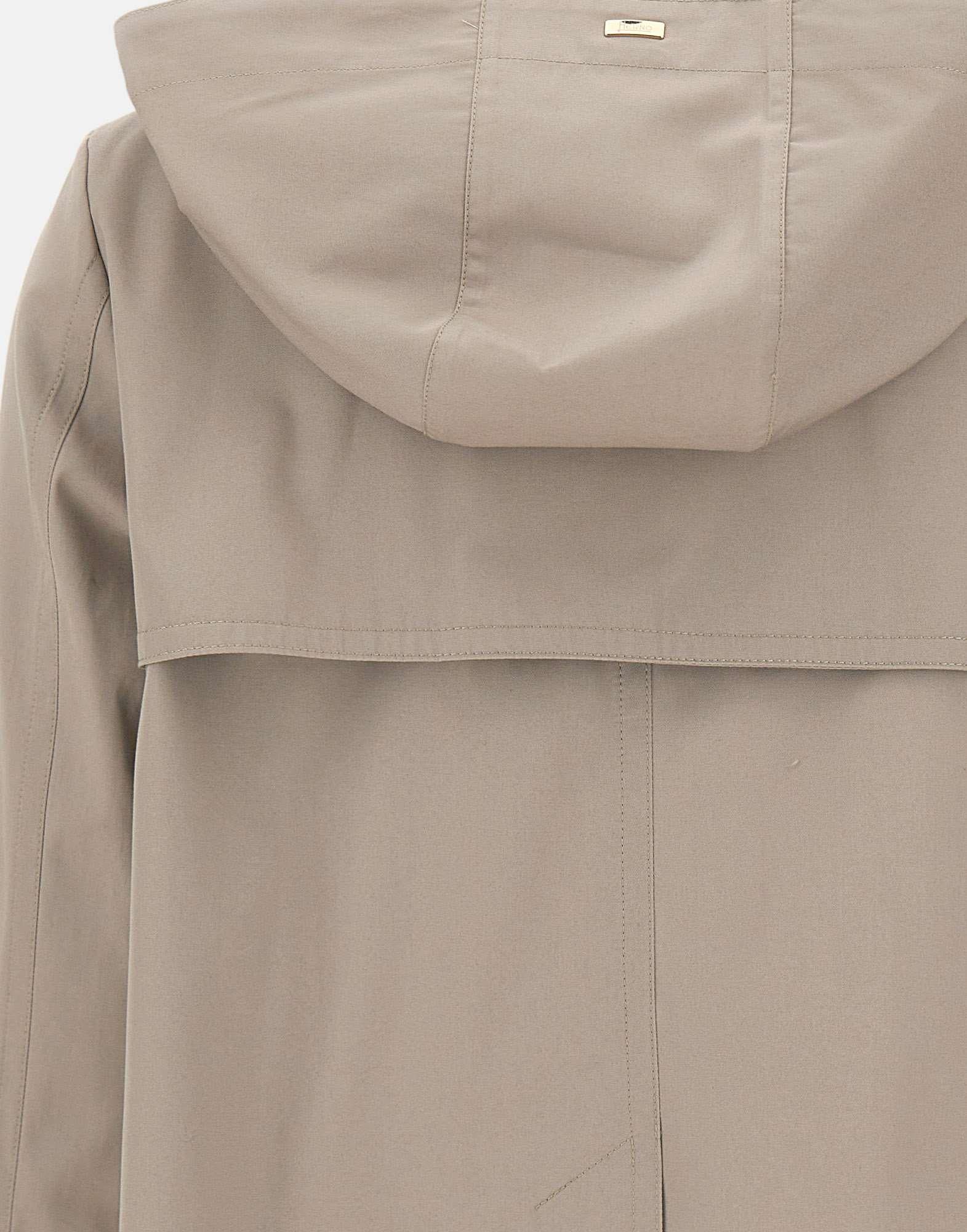 Trench donna Herno realizzato in cotone color tortora, un capospalla versatile e raffinato pensato per le mezze stagioni. Il design doppiopetto con bottoni logati definisce una linea classica e contemporanea, completata dal collo a camicia con gancio di chiusura. Il cappuccio removibile con zip aggiunge funzionalità e permette di adattare il look, rifinito da patch logo metallico. Presenta tasche laterali a filetto, spacco centrale sul retro e polsini con fascia e bottone per un dettaglio sartoriale. Vestibilità regolare, ideale come trench in cotone per un guardaroba luxury boutique italiana.