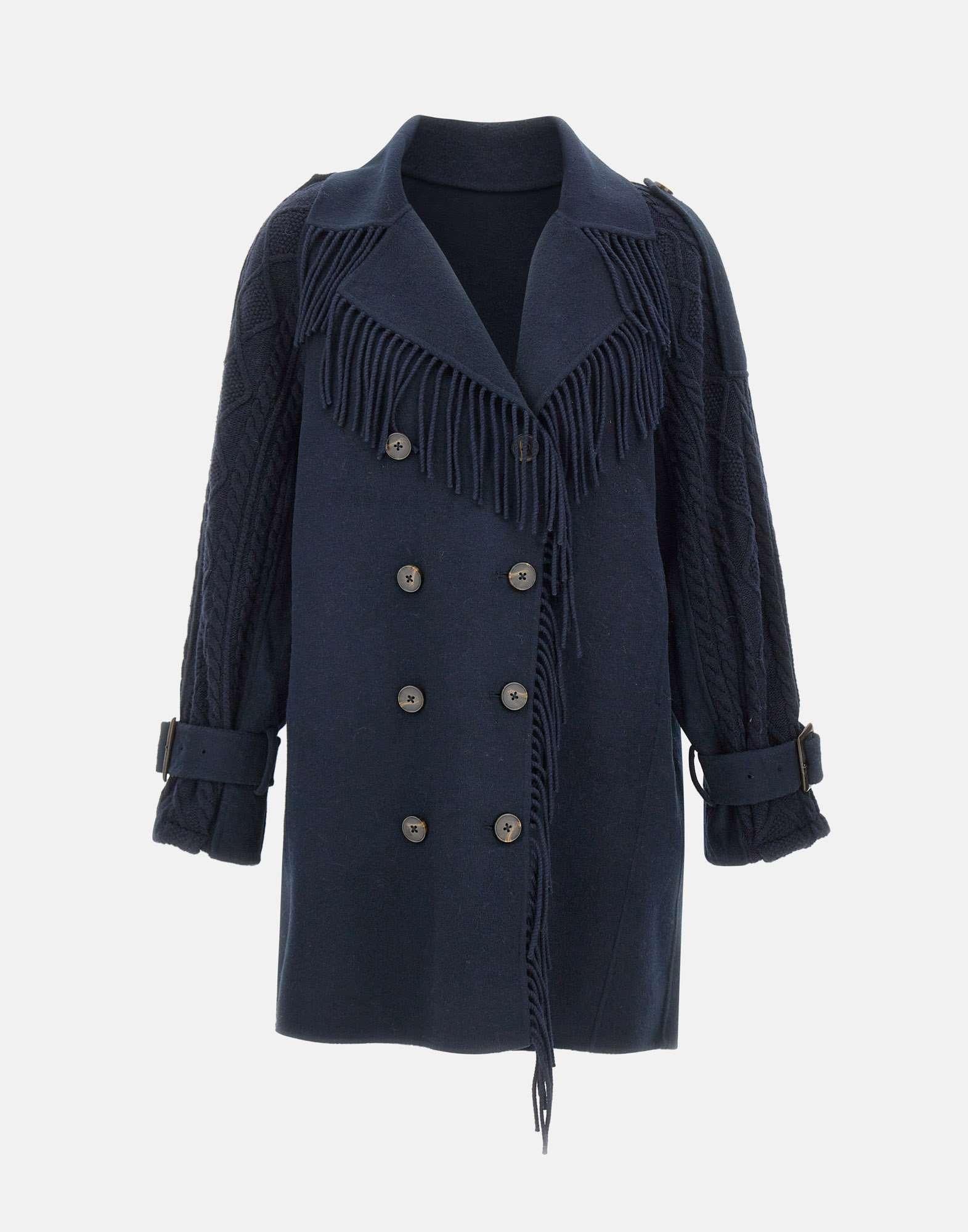 Trench donna Not Shy Cashmere "Kassila" in misto lana blu scuro, dal carattere deciso e ispirazione folk. Caratterizzato da frange sullo scollo e maniche con lavorazione a trecce, presenta una chiusura doppiopetto con otto bottoni e polsini regolabili con cinturini. Le spalline strutturate e il taglio oversize donano al capo una silhouette decisa e contemporanea, perfetta per aggiungere stile e personalità a ogni look.