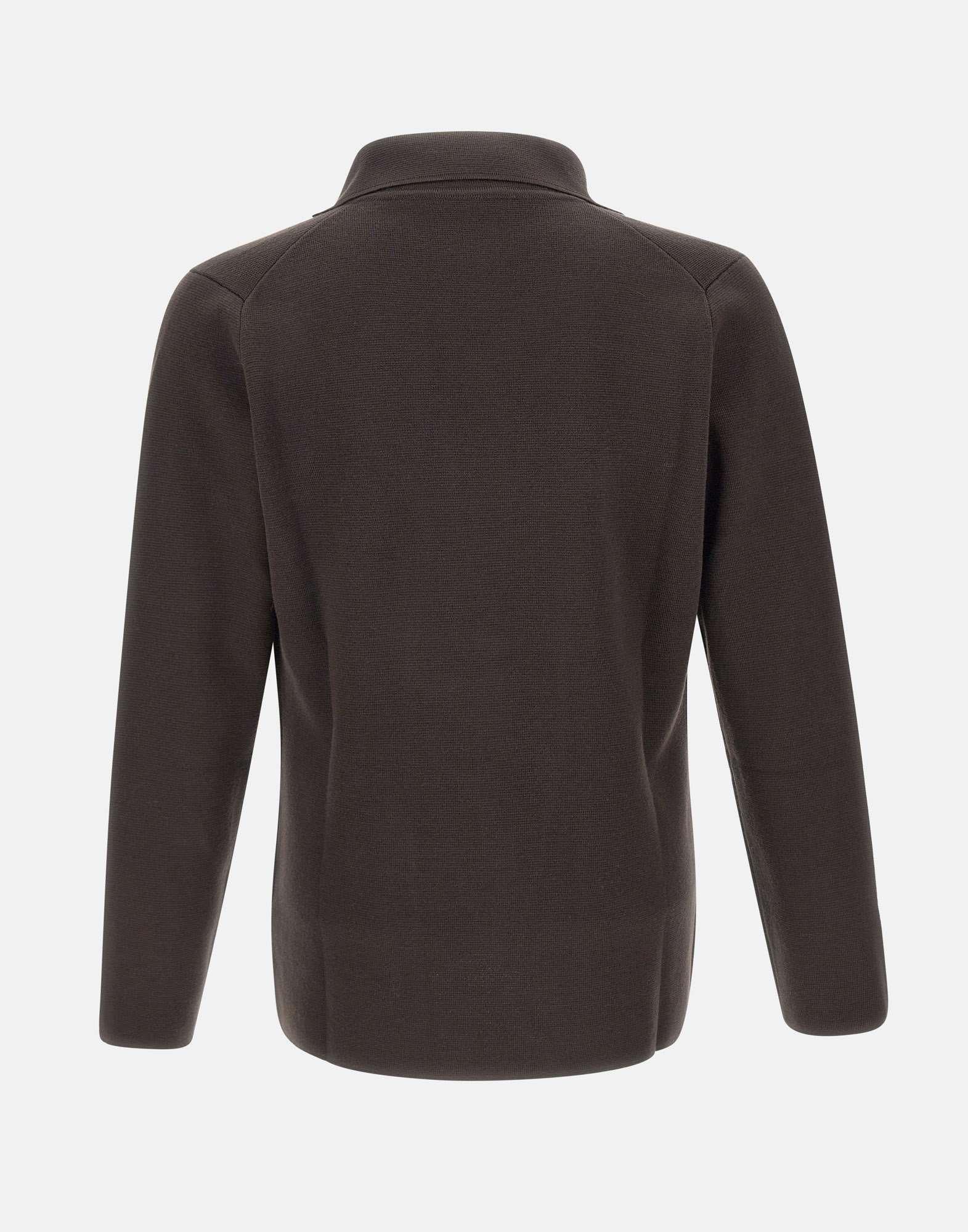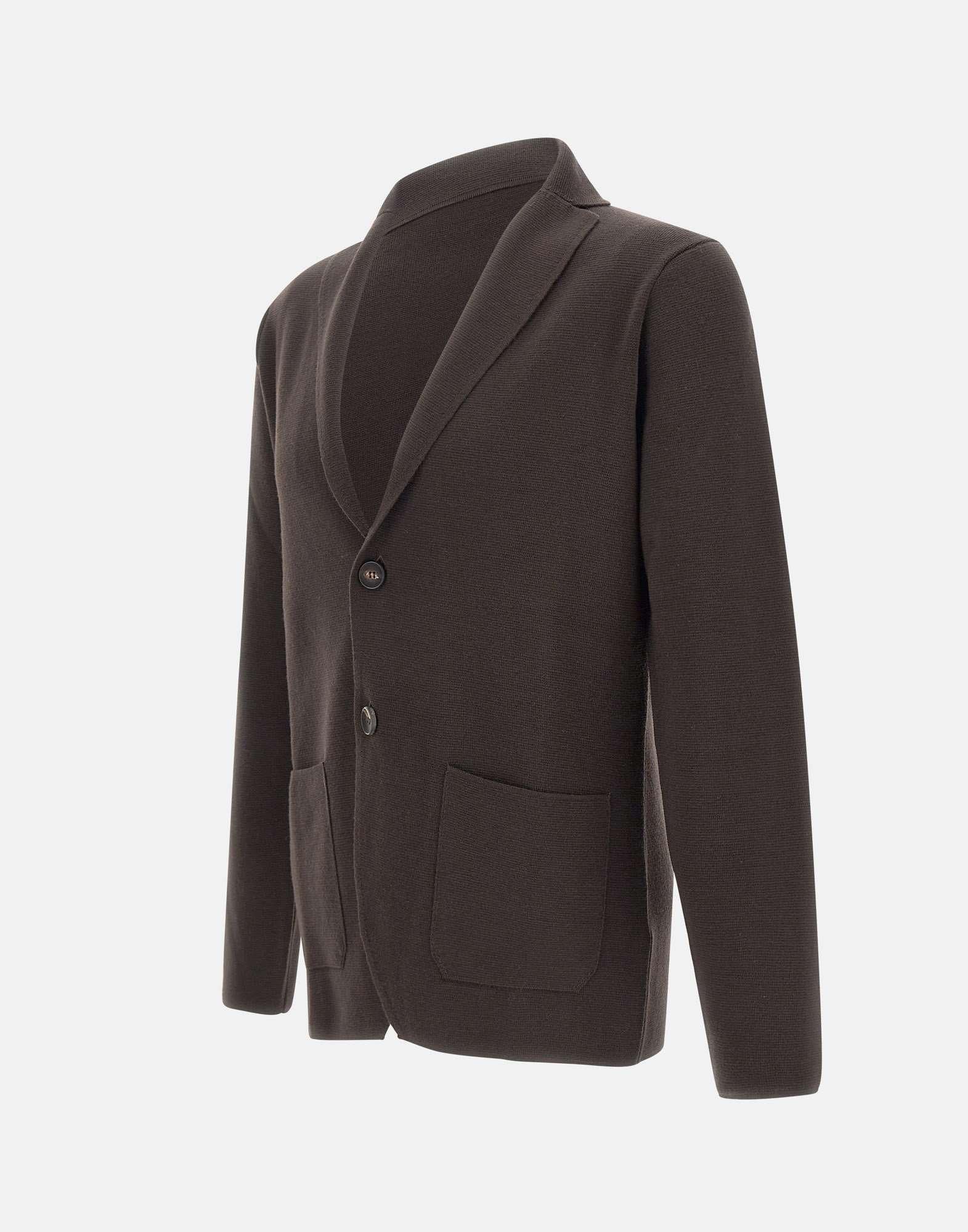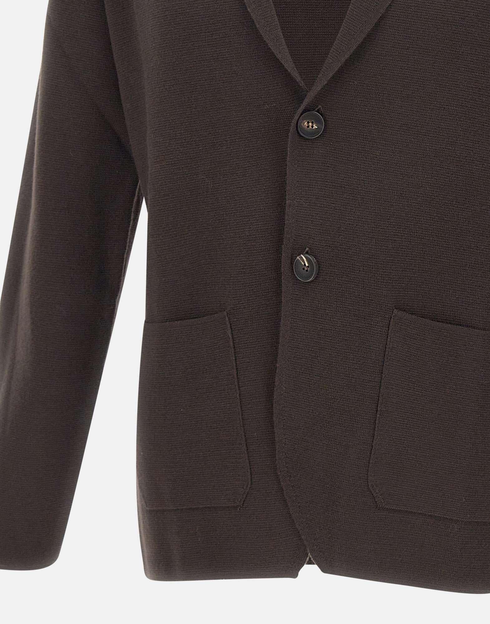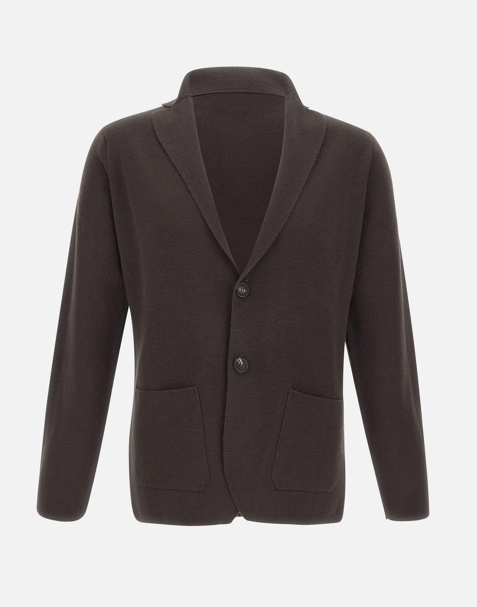 Blazer uomo Filippo De Laurentiis in maglia di lana merino, color cioccolato, collo con revers, chiusura frontale con due maxi bottoni in tinta, due tasche aperte sul davanti, calda e morbida ideale per la stagione autunnale ed invernale. Made in Italy.