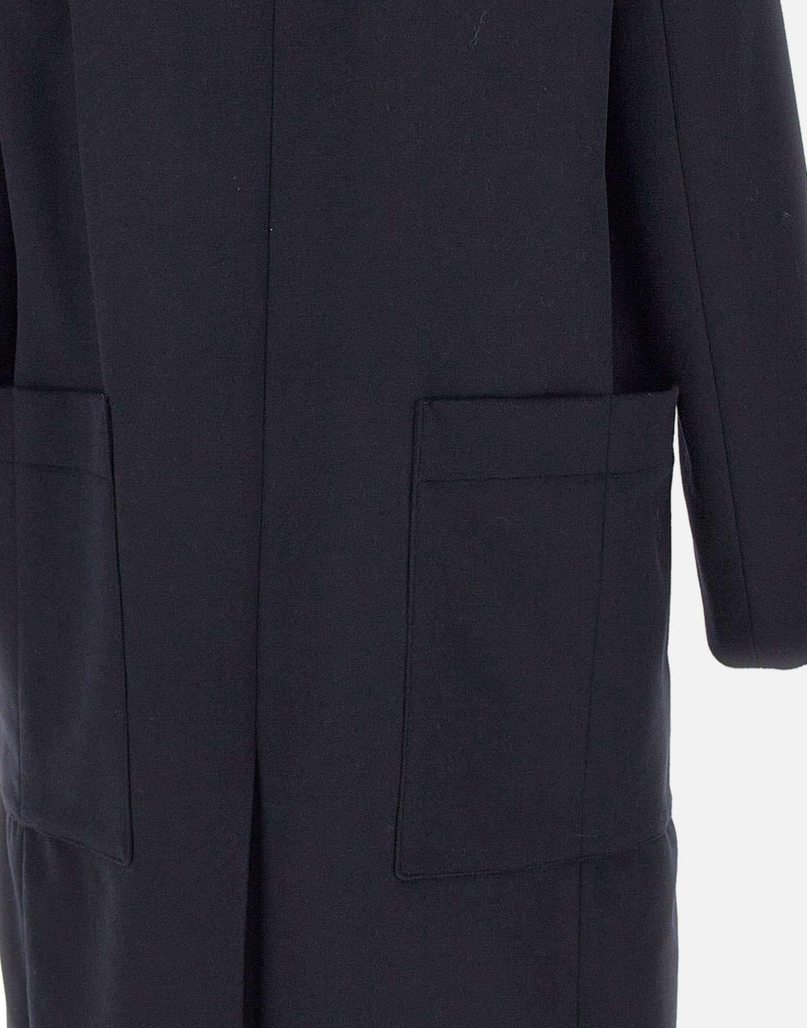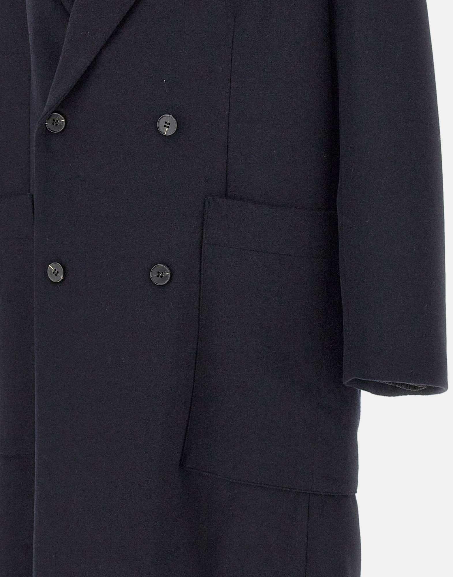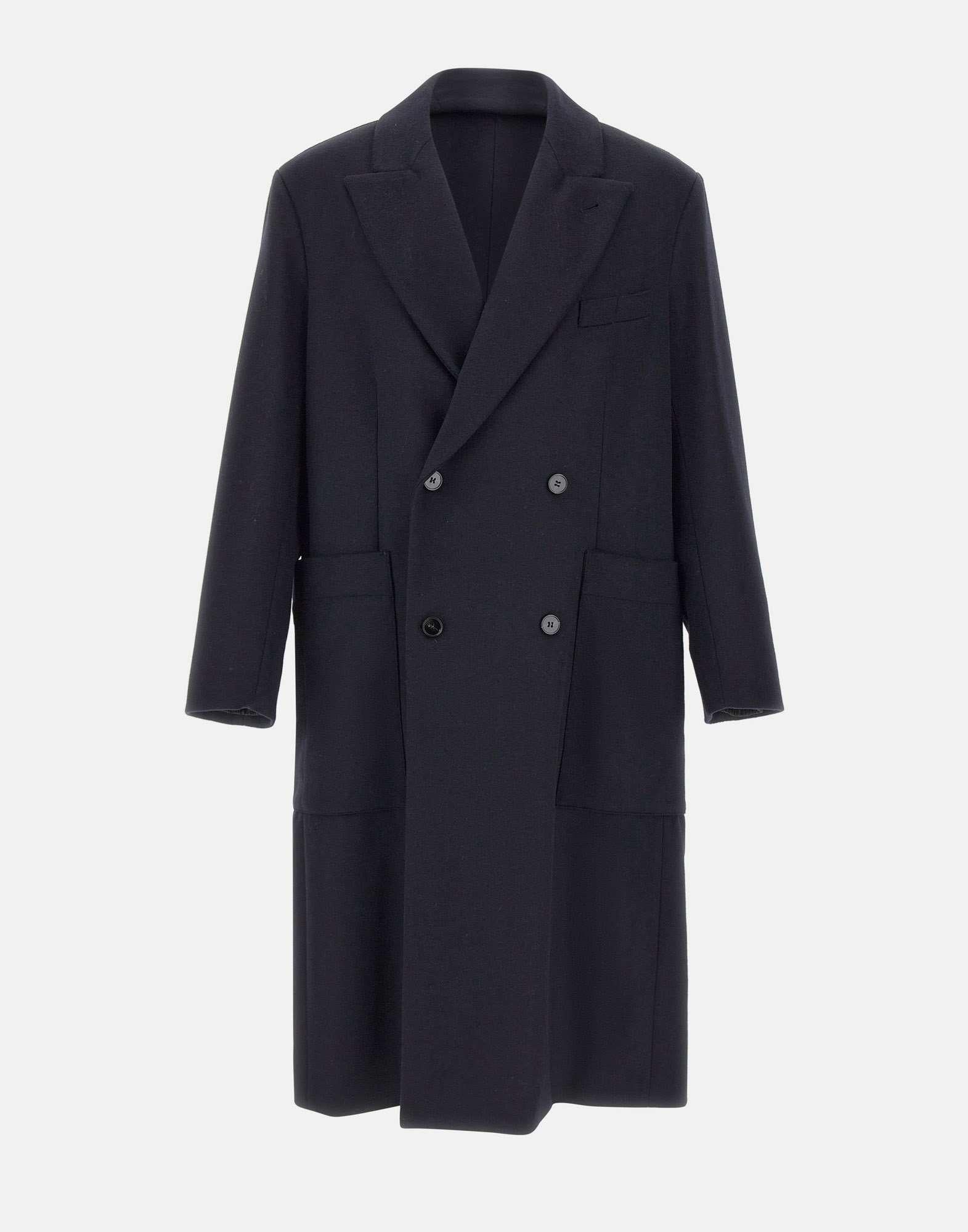 Cappotto uomo Paltò, linea Guardaroba, "Ganzo Panno Cachemire" realizzato in un pregiato mix di lana e cashmere color blu scuro. Iconico modello doppiopetto, progettato con una spalla strutturata che valorizza una vestibilita comoda e sicura. Il collo con revers a lancia classico conferisce al capo un carattere deciso, mentre il taschino sul petto aggiunge un dettaglio funzionale ed elegante. Le ampie tasche a toppa, dal design distintivo, uniscono praticità e stile, creando un equilibrio tra funzione e ricerca estetica. L'interno è studiato per un'organizzazione intelligente dello spazio, con una tasca piatta con zip e un taschino porta telefono, pensati per garantire accessibilità e ordine. Un cappotto che coniuga eleganza strutturale e praticità tecnica, ideale per un contesto urbano contemporaneo. Made in Italy.