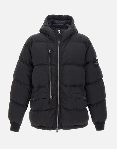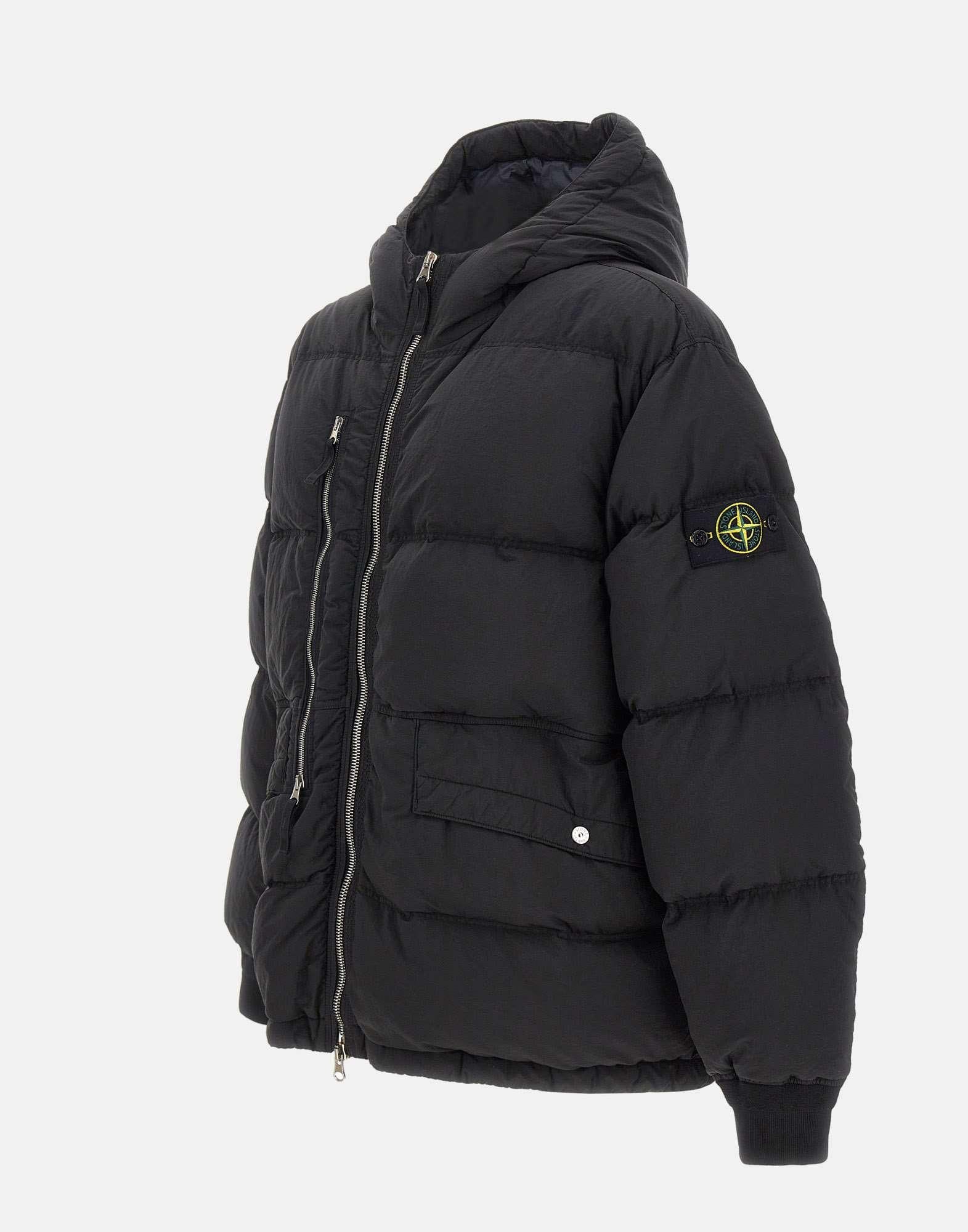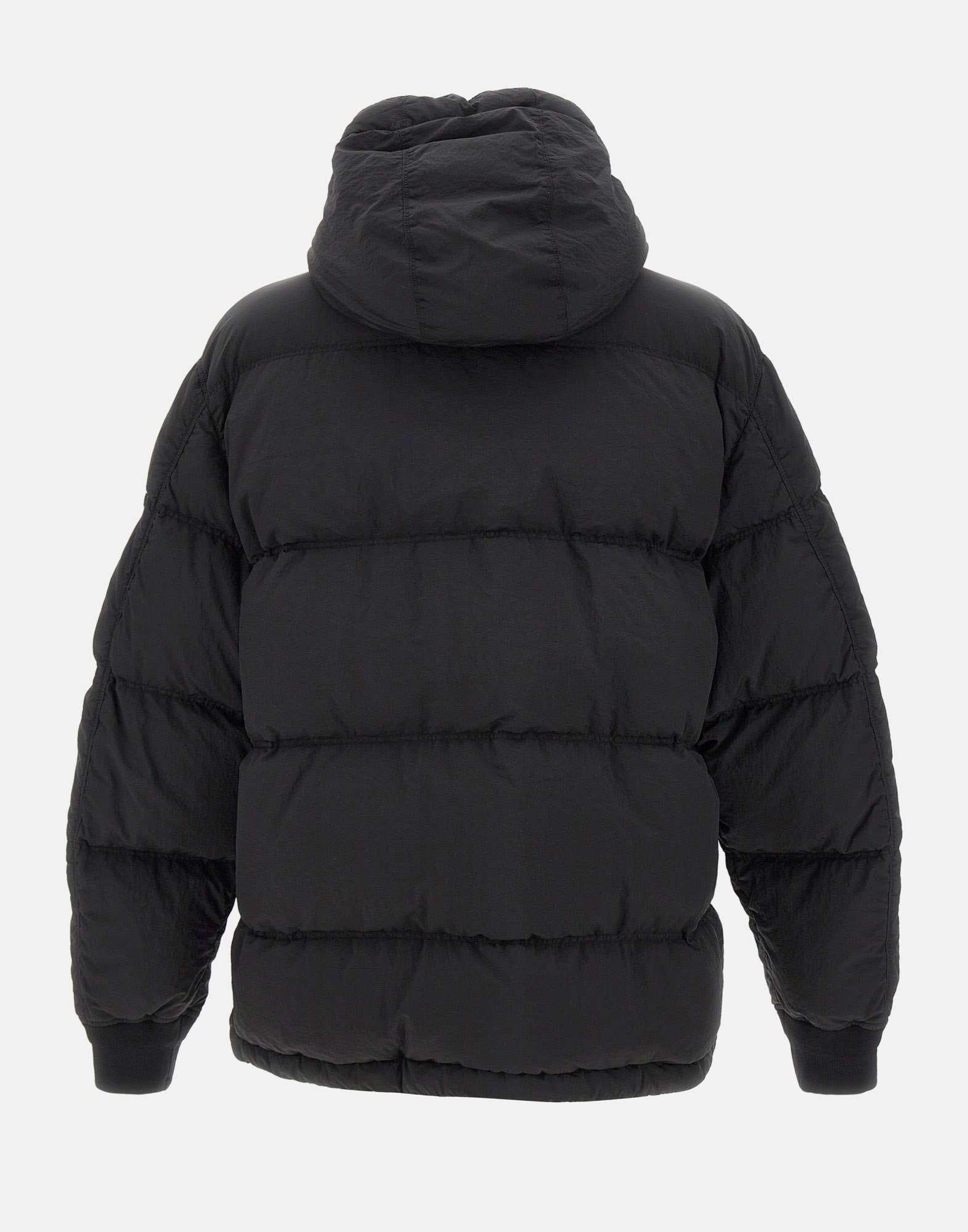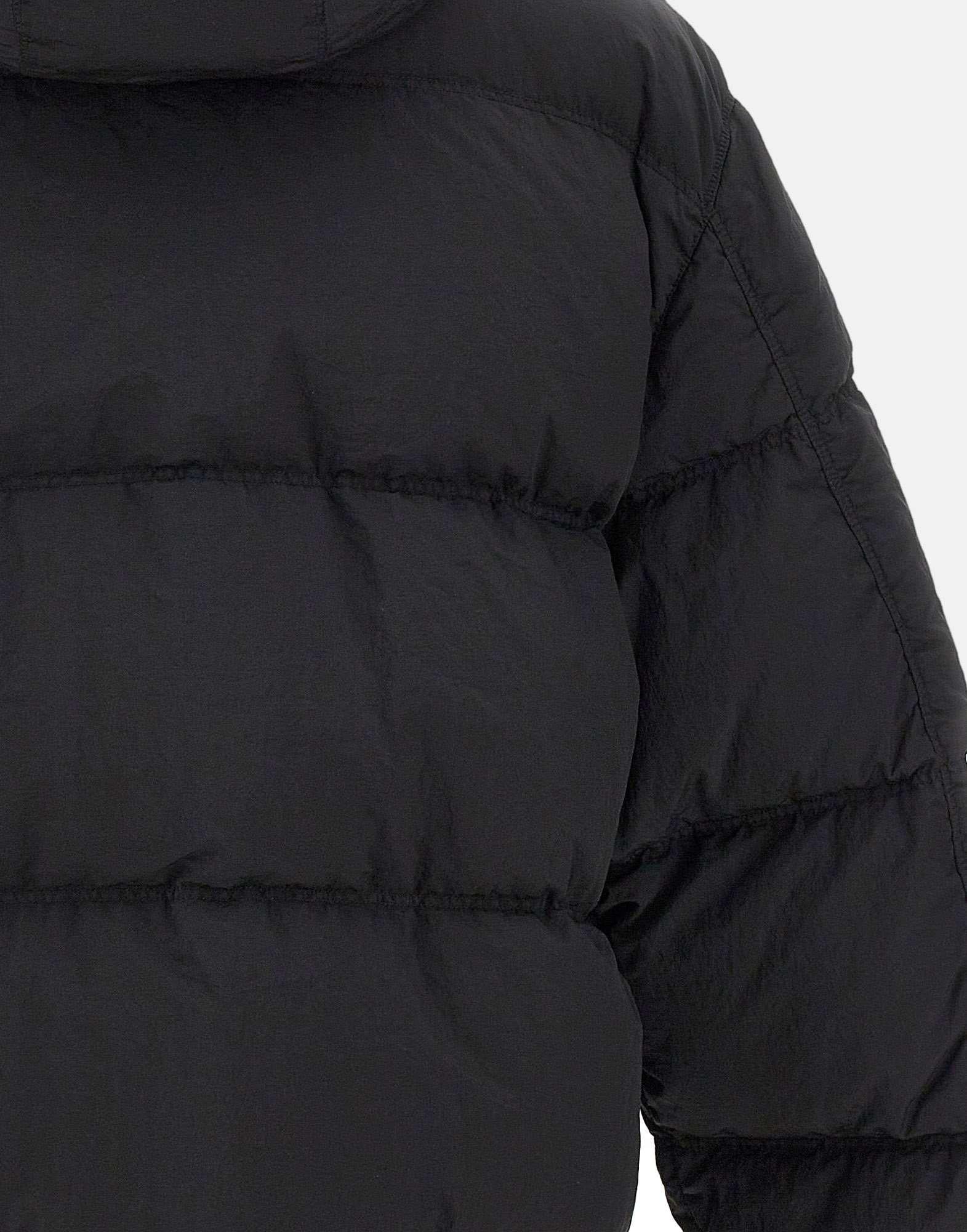 Stone Island "Nylon Metal Down Jkt" in tessuto nero cangiante, realizzato con filati rigenerati ECONYL e tinto in capo per un effetto esclusivo. Imbottito in piuma per garantire calore e leggerezza. Dotato di cappuccio regolabile con coulisse, multitasche frontali di cui una con zip verticale a doppio cursore, e iconico badge Stone Island sulla manica sinistra. Chiusura centrale con zip a due vie e polsini in maglia a costine. Regular fit.