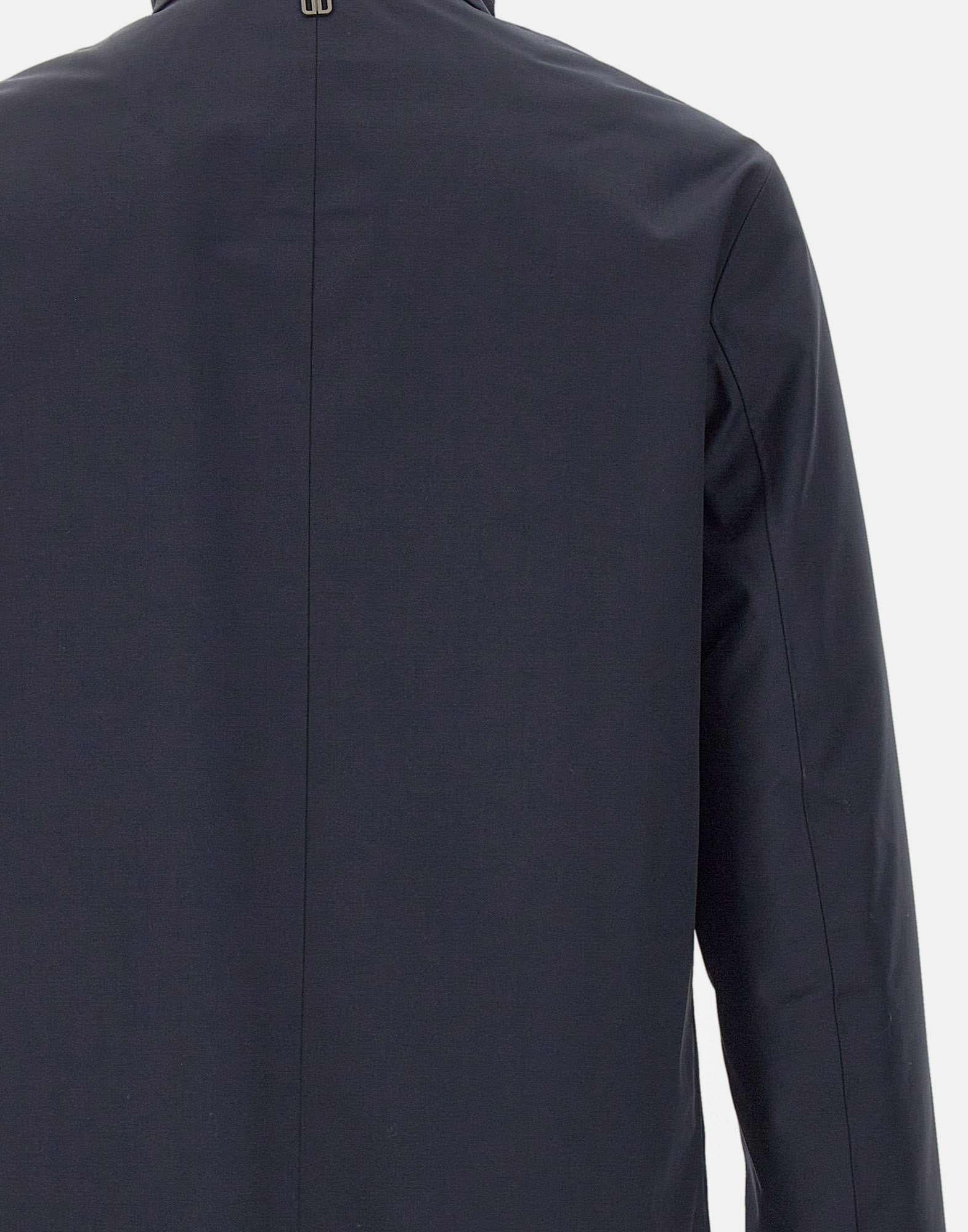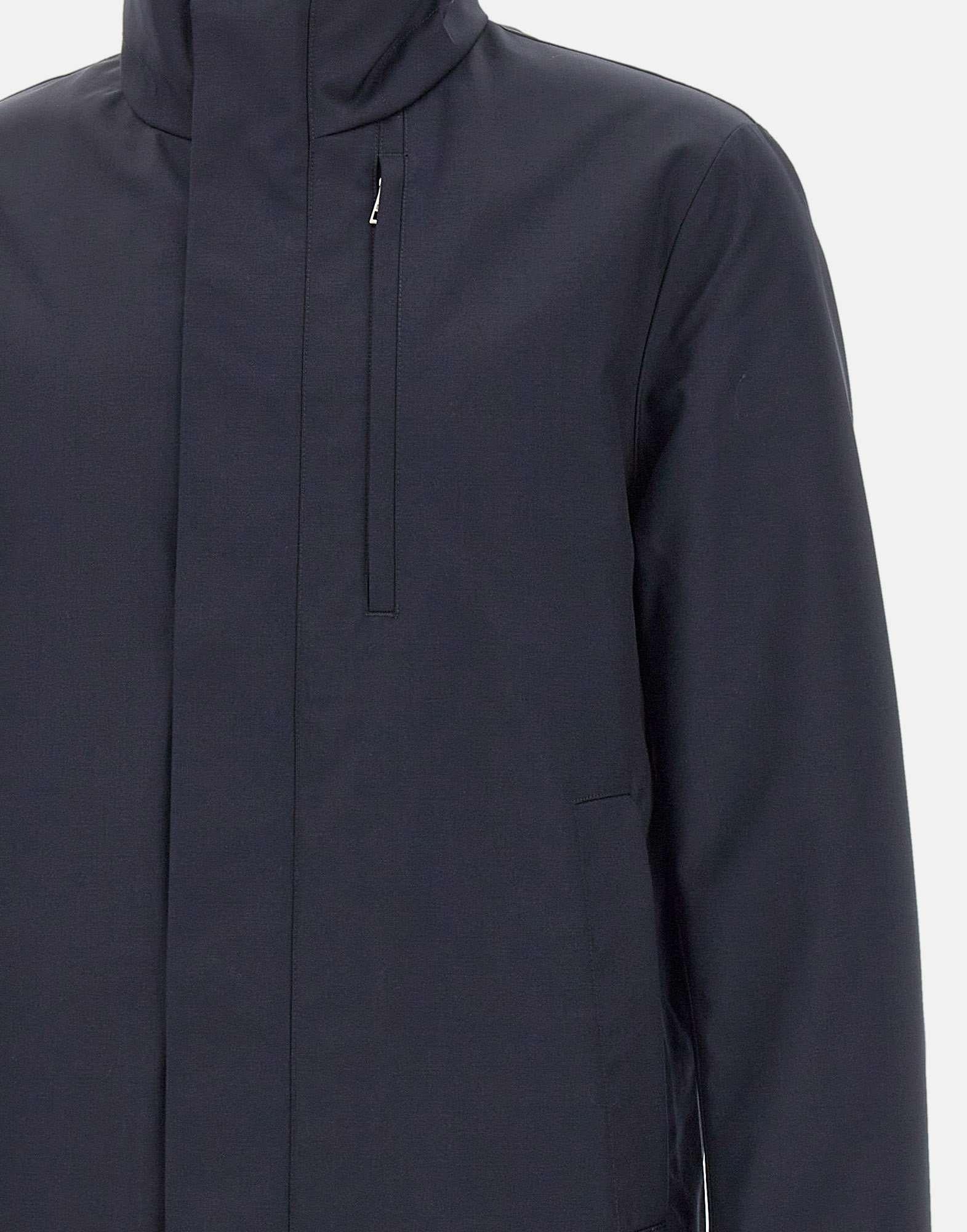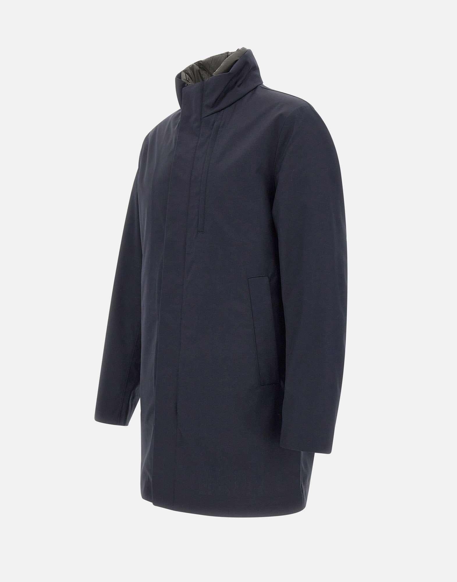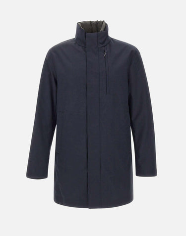 Piumino uomo Duno "Blake Mio" in misto lana blu navy, cappotto 3in1 pensato per massima versatilità e protezione. Realizzato in lana tecnica 3-Layer con cuciture interne termosaldate, presenta un piumino interno staccabile in tessuto tecnico superlight cangiante, indossabile anche separatamente. Il collo in piedi ospita un cappuccio ripiegato con chiusura in velcro. Doppia chiusura frontale con zip e automatici nascosti, tasche laterali a filetto con zip e ampia tasca al petto completano il design tecnico e sofisticato.