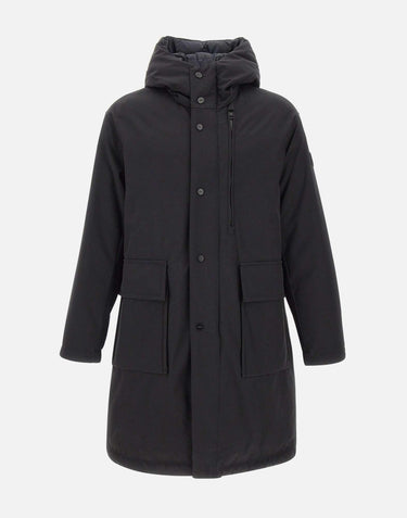 Piumino uomo Duno "Mirror" nero, modello parka reversibile in tessuto 3-Layer dall'aspetto laniero con imbottitura in piuma. Dotato di ampio cappuccio, doppia chiusura frontale con zip a doppio cursore e automatici a vista, e ampia soluzione multi-pocket: tasca al petto con zip nascosta da doppio filetto e grandi tasche laterali a toppa con pattina e automatici nascosti. Polsini regolabili con laccio e automatico. L'interno presenta piumino in tessuto tecnico superlight con zip doppio cursore, tasche laterali a filetto con zip e coulisse al fondo per regolare la vestibilità.