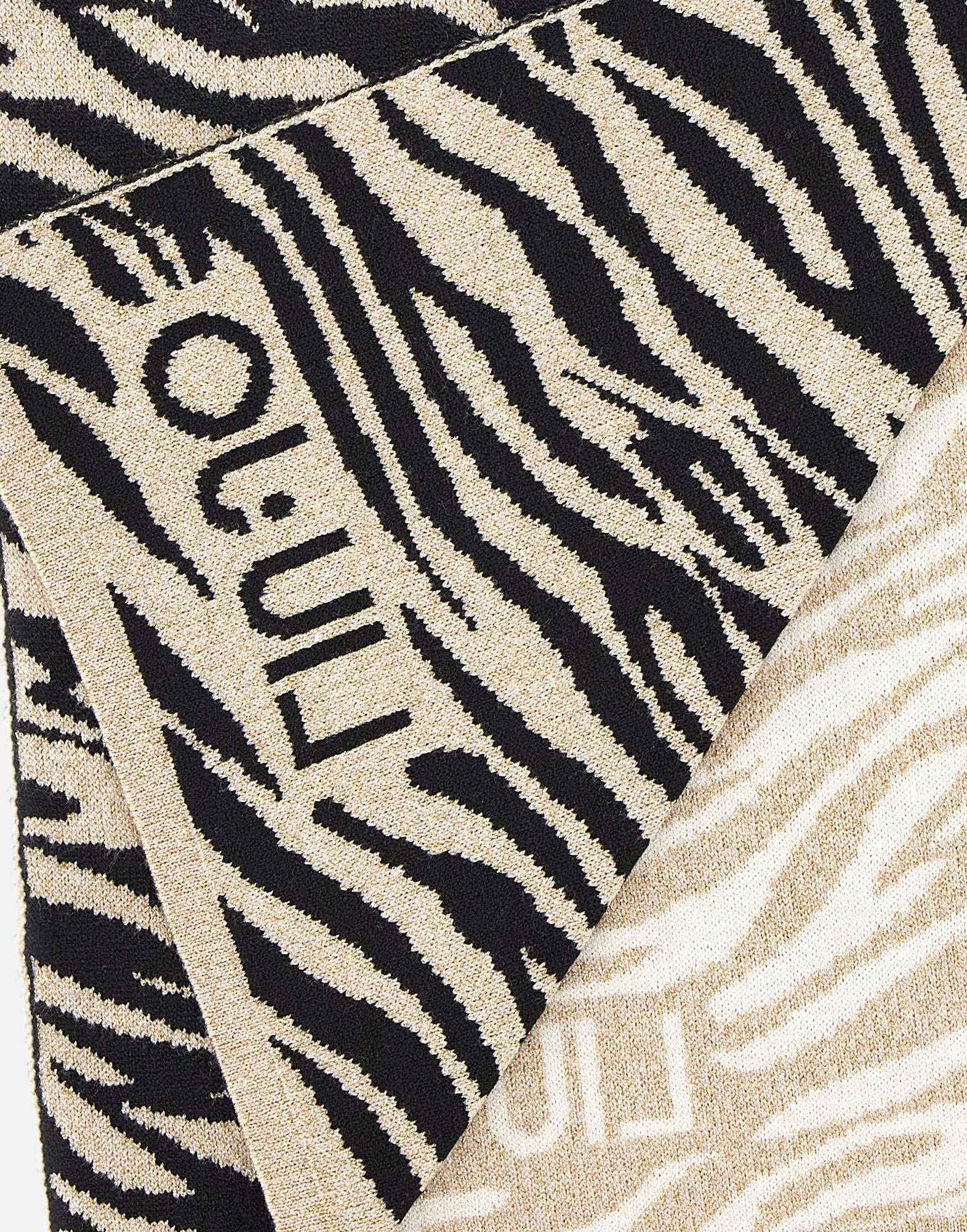 Sciarpa donna Liu-Jo in maglia di misto viscosa con fantasia animalier multicolor nei toni del nero e oro, impreziosita da fili di lurex che donano luminosità al design. Rifinita con estremità logate, unisce eleganza e carattere, perfetta per completare look sofisticati. Larghezza 30 cm.