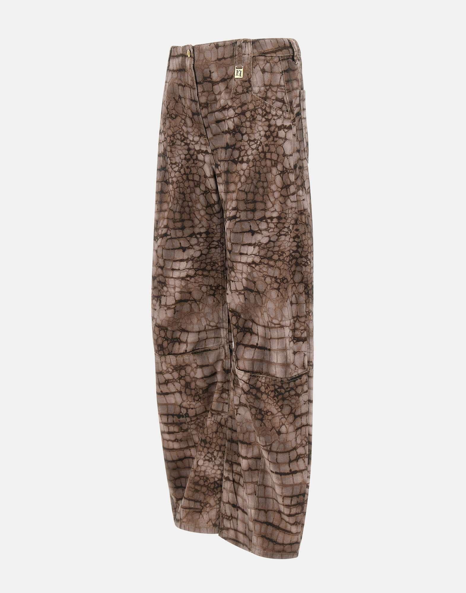Jeans donna Elisabetta Franchi realizzati in drill di cotone color marrone con stampa all-over a tema alligatore ispirata a forme e geometrie naturali. Il modello presenta tasche sagomate sul davanti e tasche applicate sul retro, con volumi inediti costruiti tramite pinces e tagli che aggiungono ampiezza e struttura alla silhouette. Chiusura con zip e bottone logato, passanti per cintura e charm logo metallico applicato in vita a completare il design. Vestibilità over.