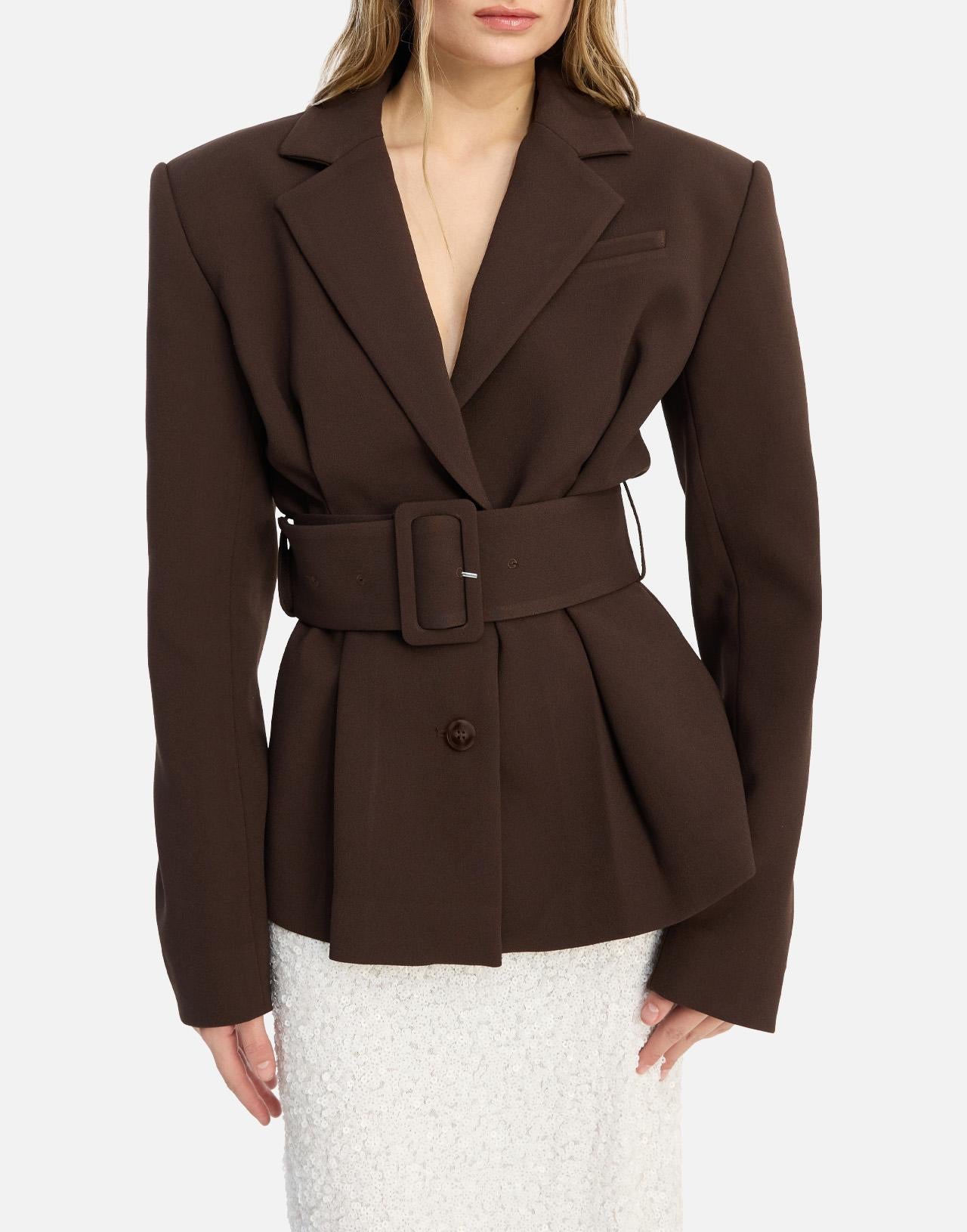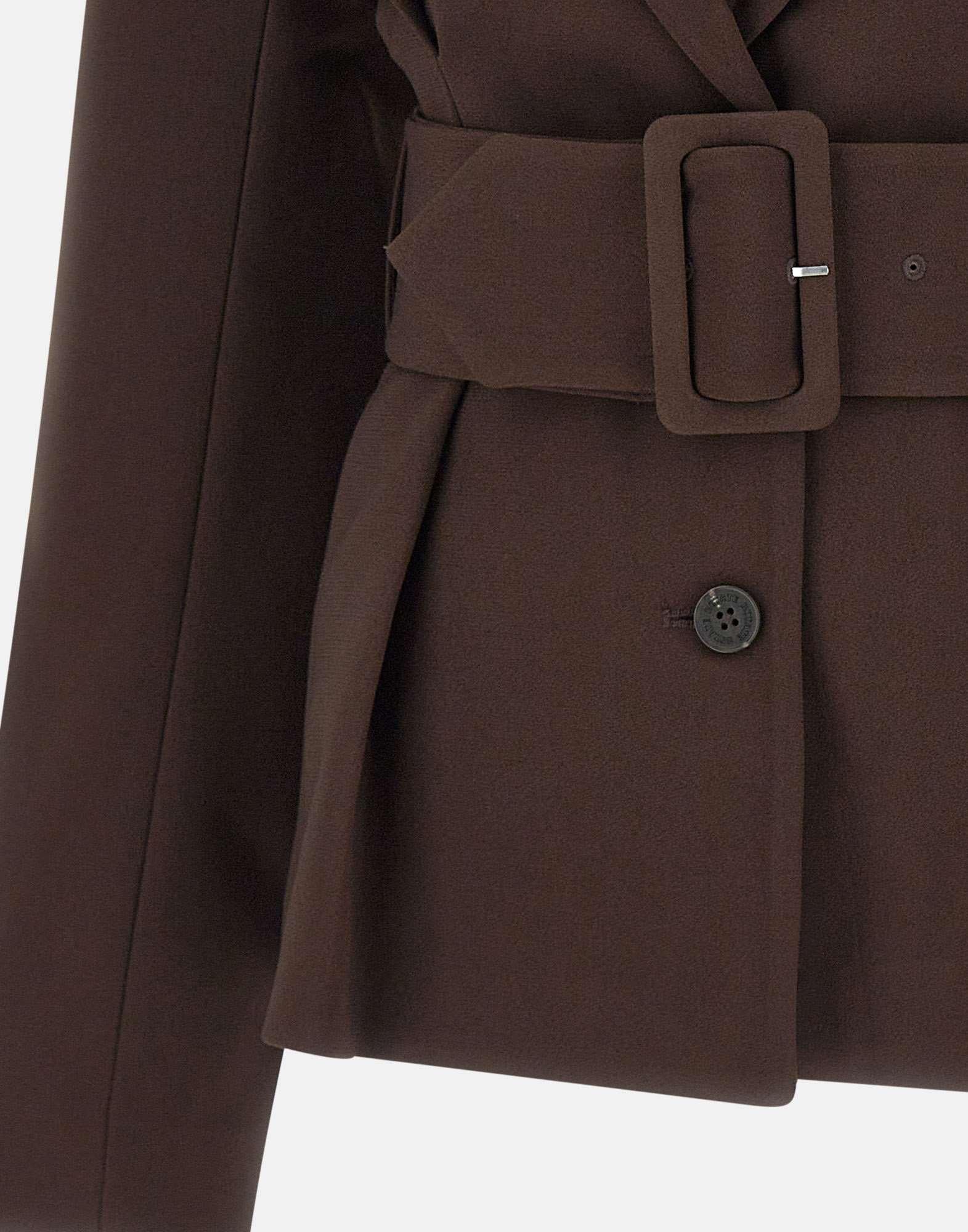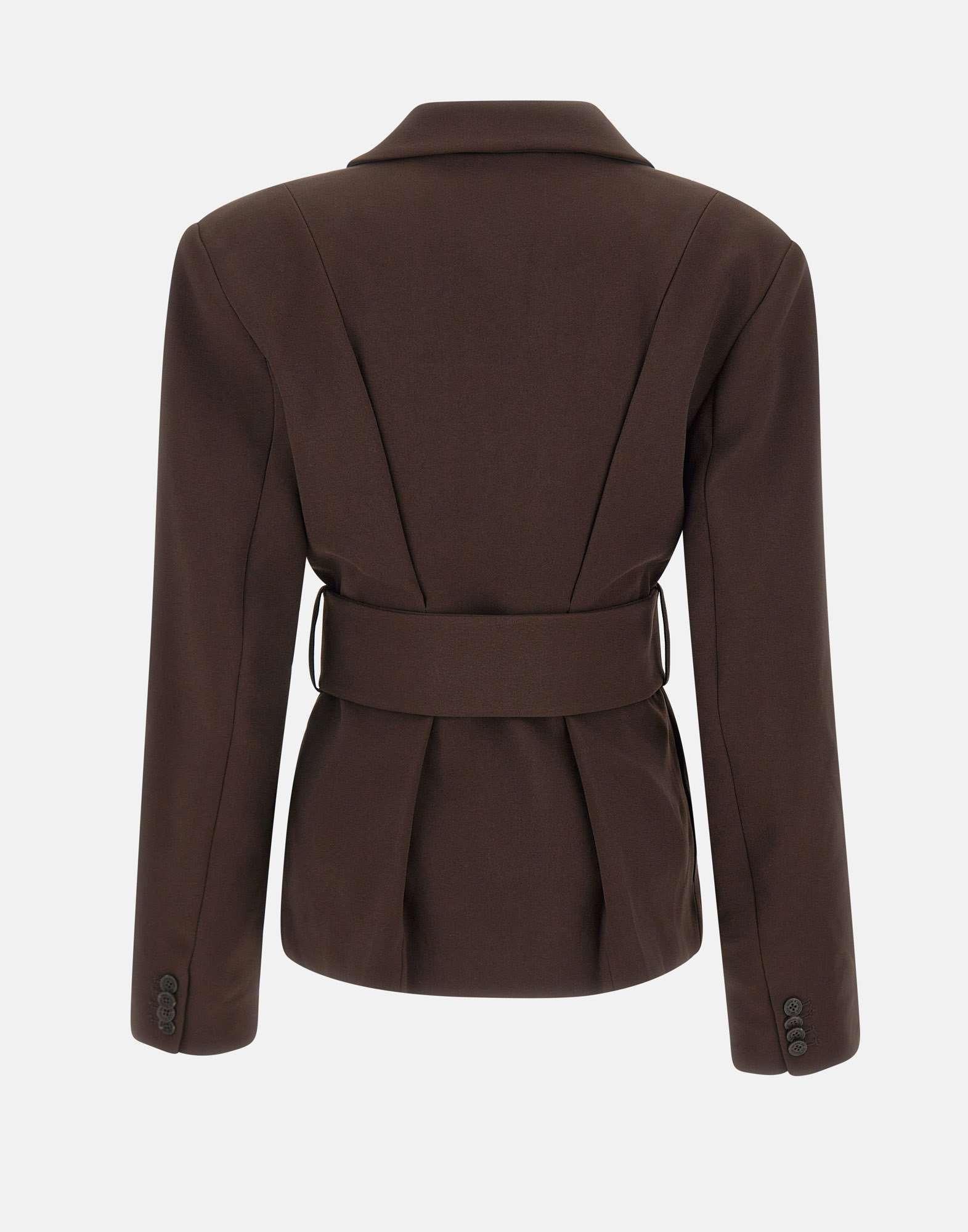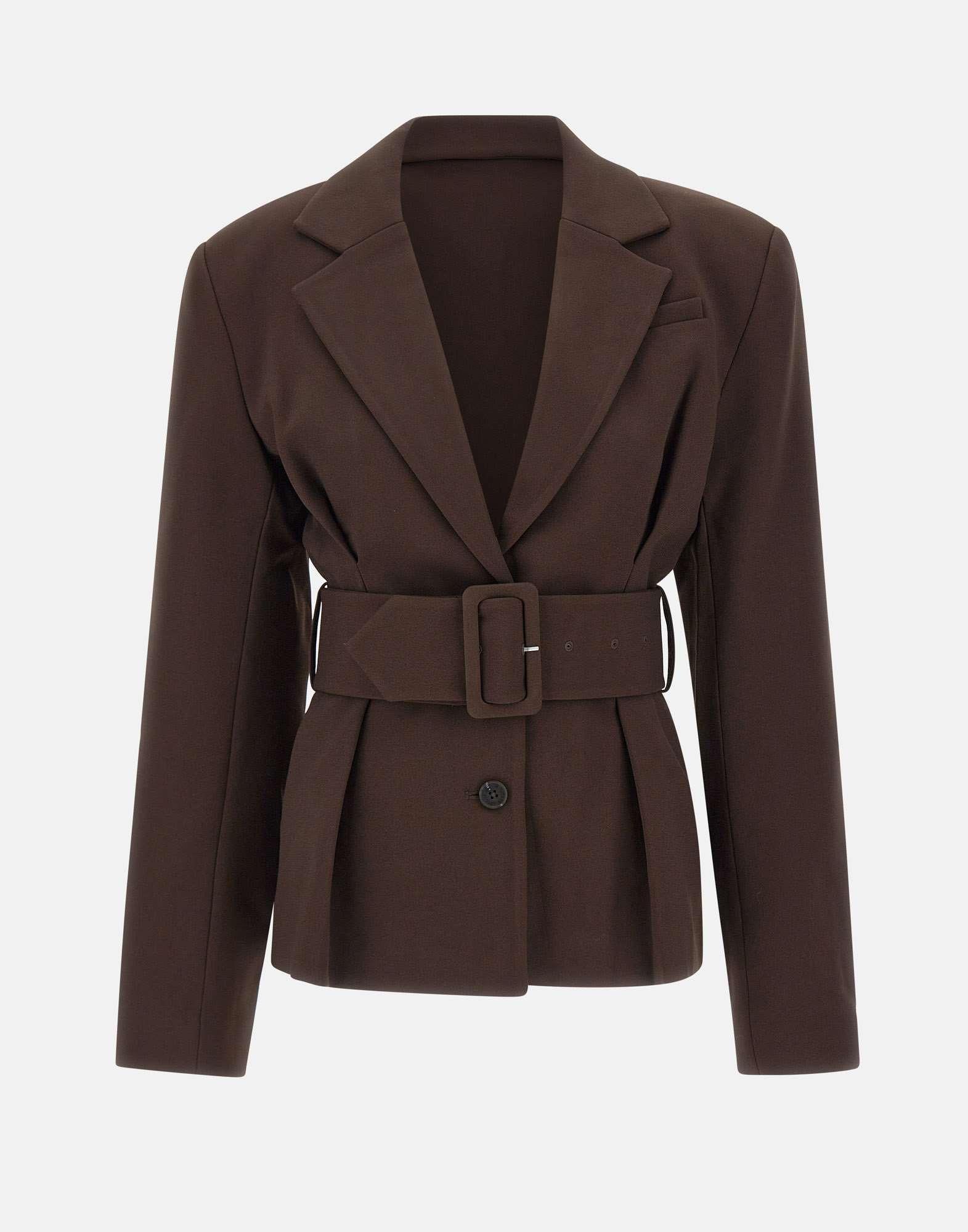 Blazer donna Rotate Birger Christensen "Suiting Belted Blazer" in tessuto crepe color cacao, dal taglio elegante e strutturato, Sunday Collection. Presenta spalle definite, maniche lunghe con polsini abbottonati e chiusura frontale con bottoni. Il punto vita è valorizzato da una cintura coordinata con fibbia rivestita in tessuto, che scolpisce la silhouette. Dotato di tasche frontali discrete e tasca a filetto sul petto, è completato da una fodera interna morbida misto viscosa per massimo comfort. Vestibilità comfort fit aderente in vita, ideale per look raffinati e contemporanei.