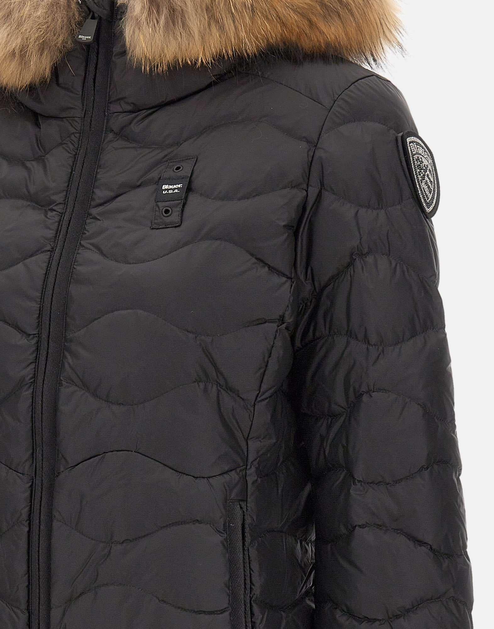 Blauer "Aldie", color nero, unisce stile urbano e funzionalità. Realizzato con imbottitura in piuma d’oca, assicura calore e leggerezza ideali per la stagione invernale. Il design slim fit è definito dalla trapuntatura ad onde, dal cappuccio con bordo in vera pelliccia removibile, dalle tasche laterali con zip e dalla chiusura frontale con zip a due vie, completata da tasche interne pratiche e funzionali. I bordi nastrati, il passante Blauer cucito sul petto e lo scudo glitterato sulla manica sinistra arricchiscono un capo sofisticato, pensato per una femminilità contemporanea.