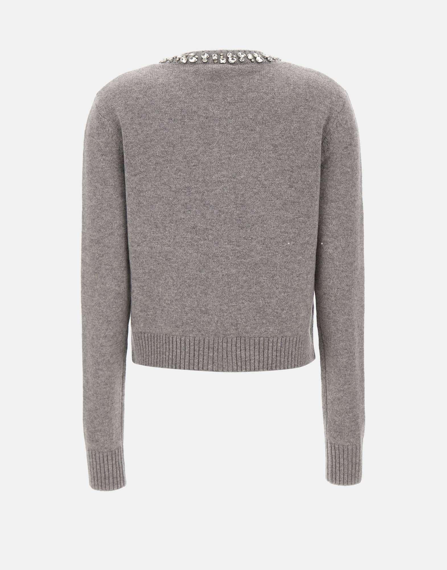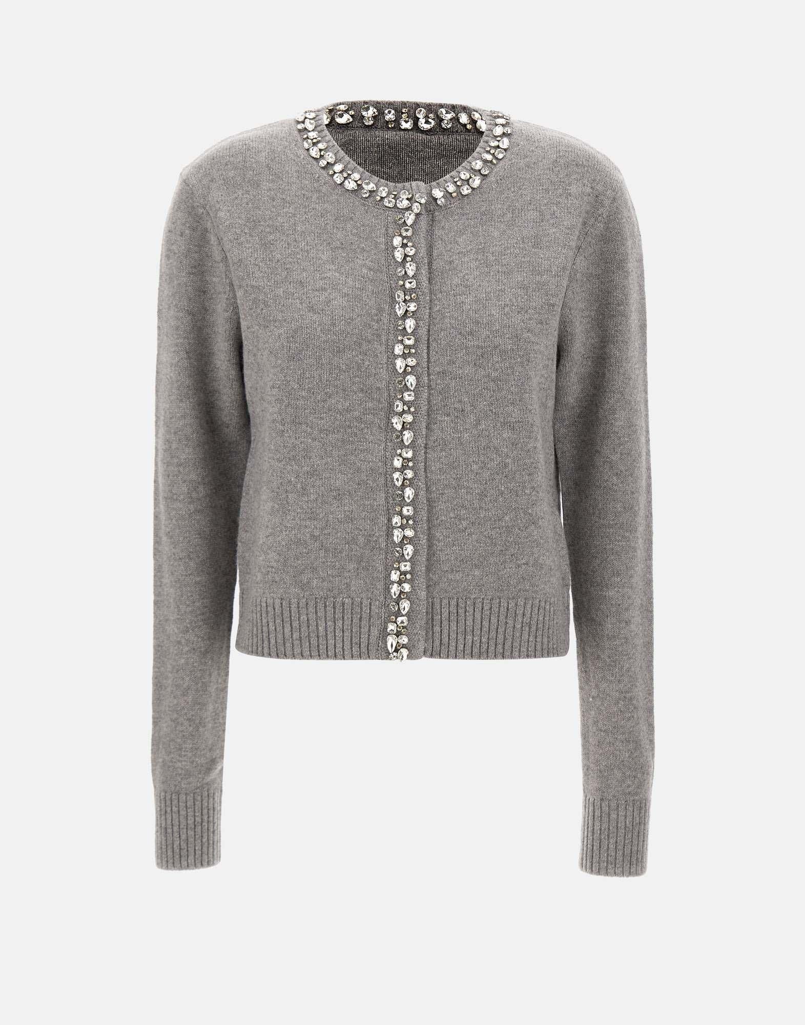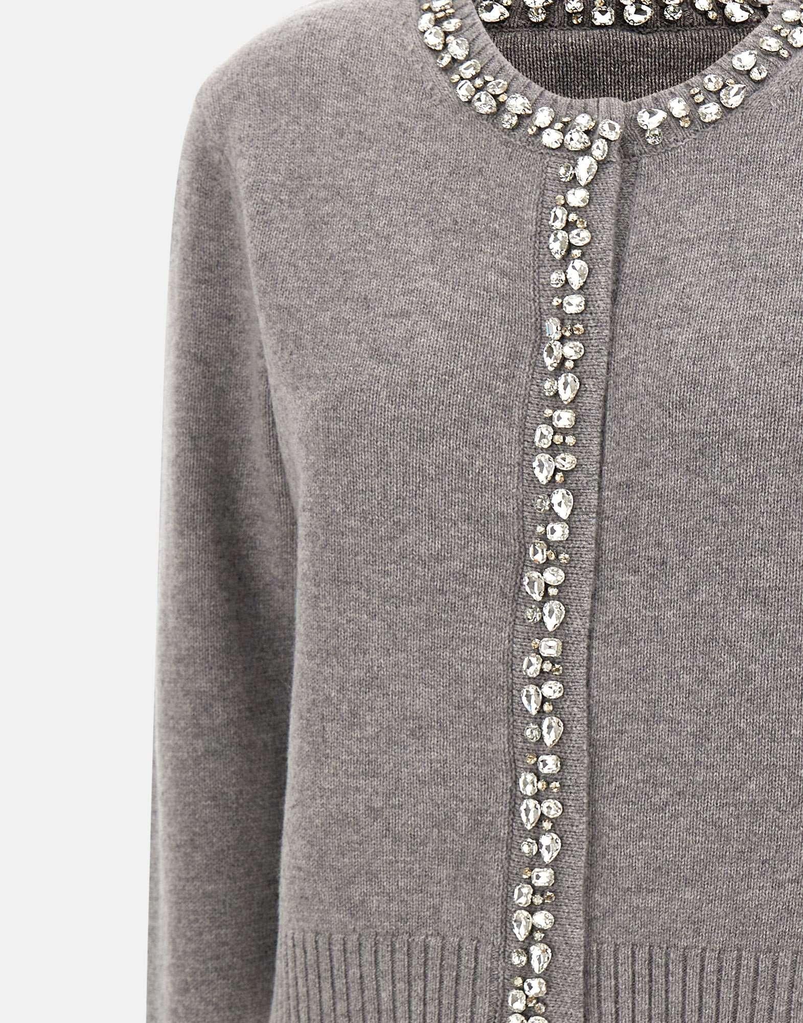 Cardigan Kaos da donna realizzato in morbida lana vergine di alta qualità, presenta in un versatile colore grigio maniche lunghe, scollo tondo e bordi a costine, per una vestibilità confortevole e curata. Ad impreziosire il design, un delicato dettaglio di zirconi decorativi lungo i bordi, che dona luce e femminilità al capo senza rinunciare alla sobrietà. La vestibilità regular fit lo rende perfetto sia per outfit casual che più eleganti.