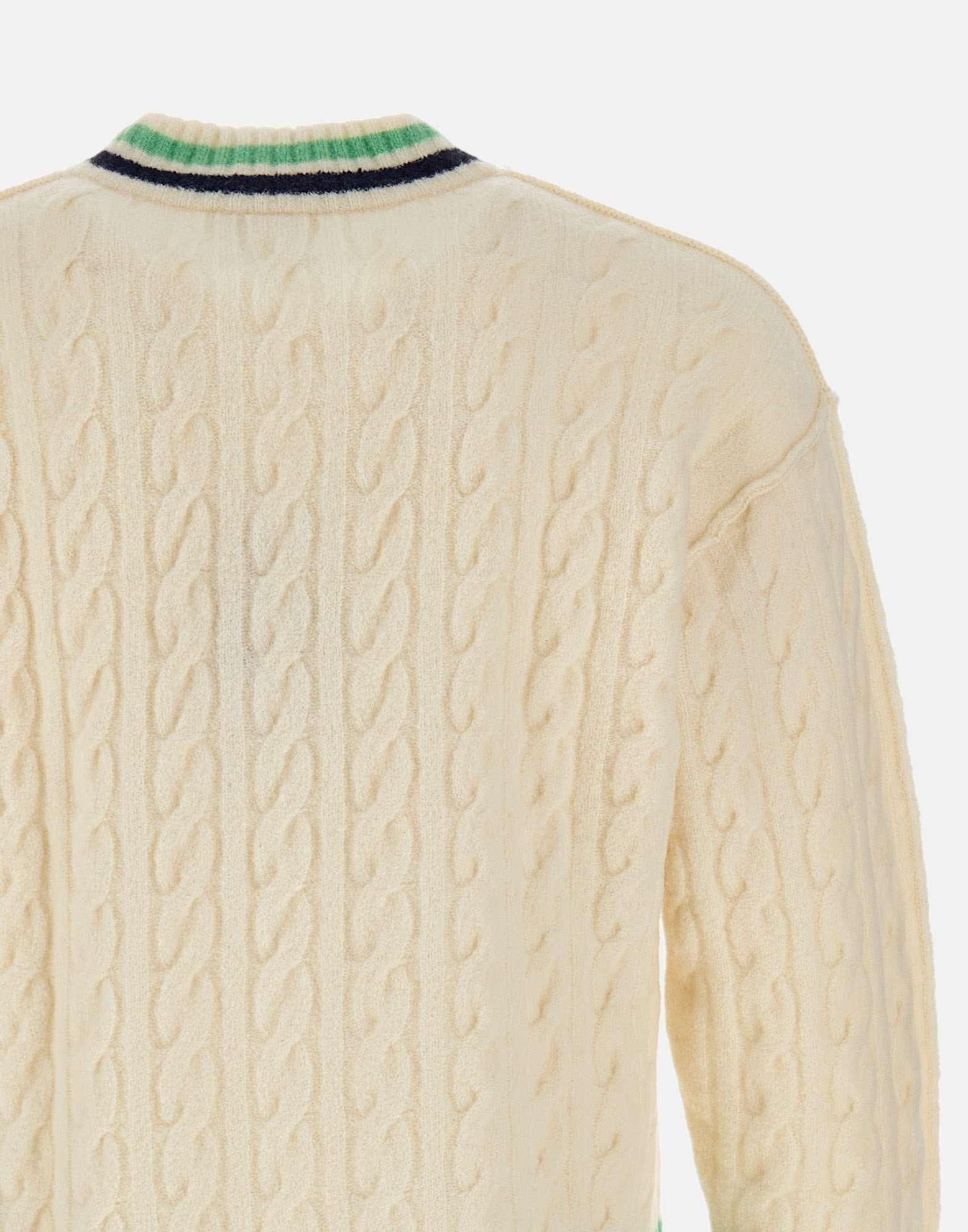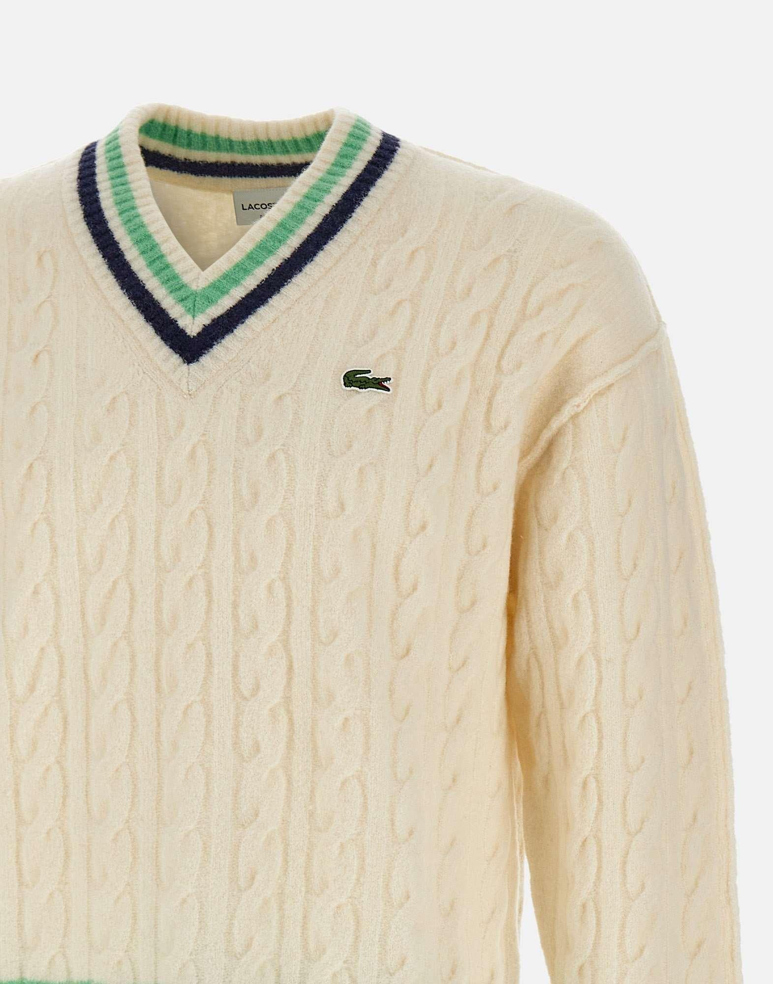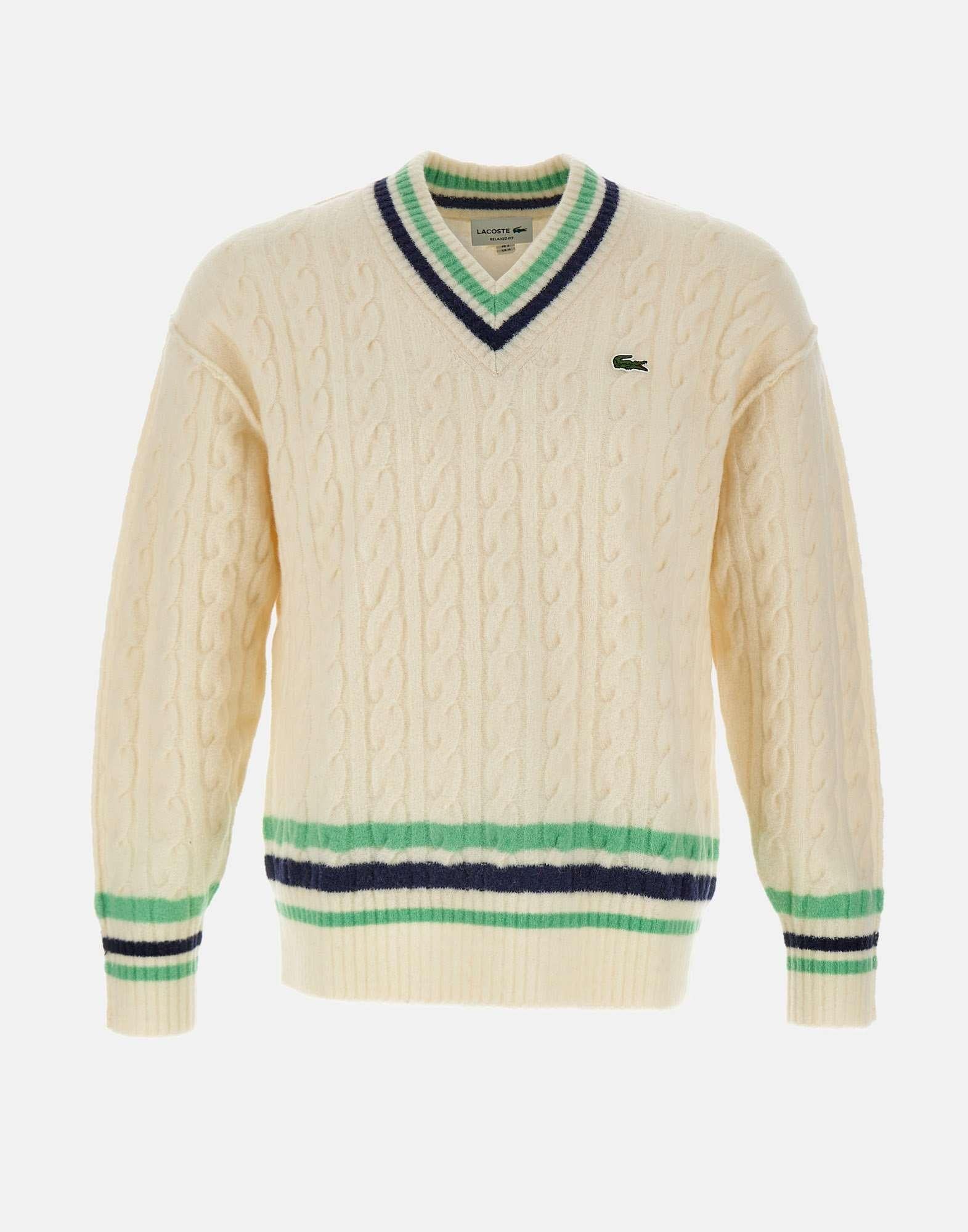 Maglione Lacoste da uomo in lana bianca, caratterizzato da profili multicolor a contrasto e lavorazione a trecce finezza 7. Modello con scollo a V, maniche lunghe e bordi a costine. Le spalle leggermente scese donano un tocco rilassato e contemporaneo, mentre liconico coccodrillo ricamato sul petto firma il design. Vestibilità relaxed fit.
