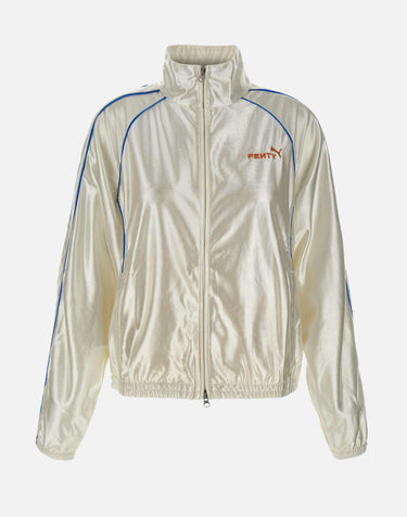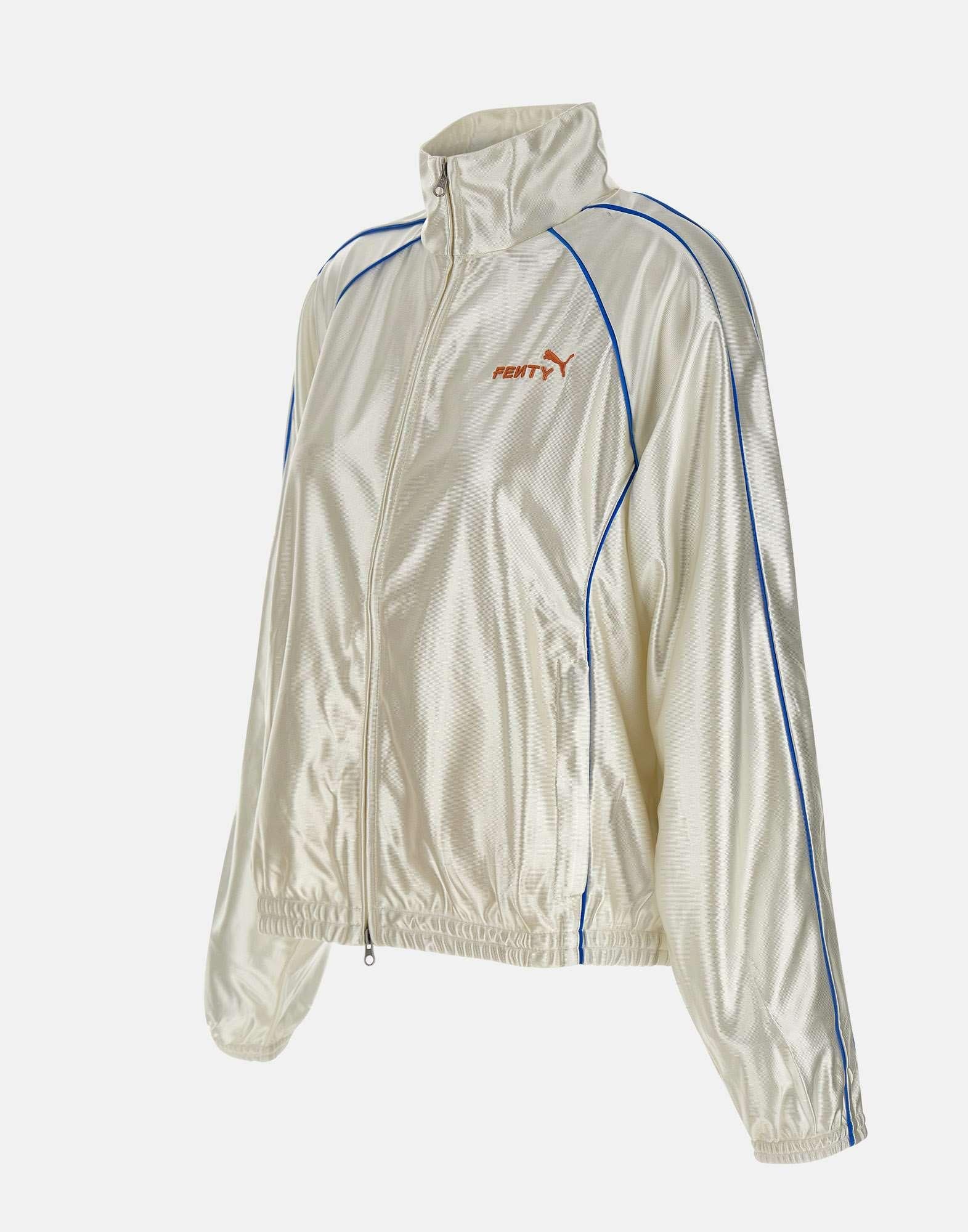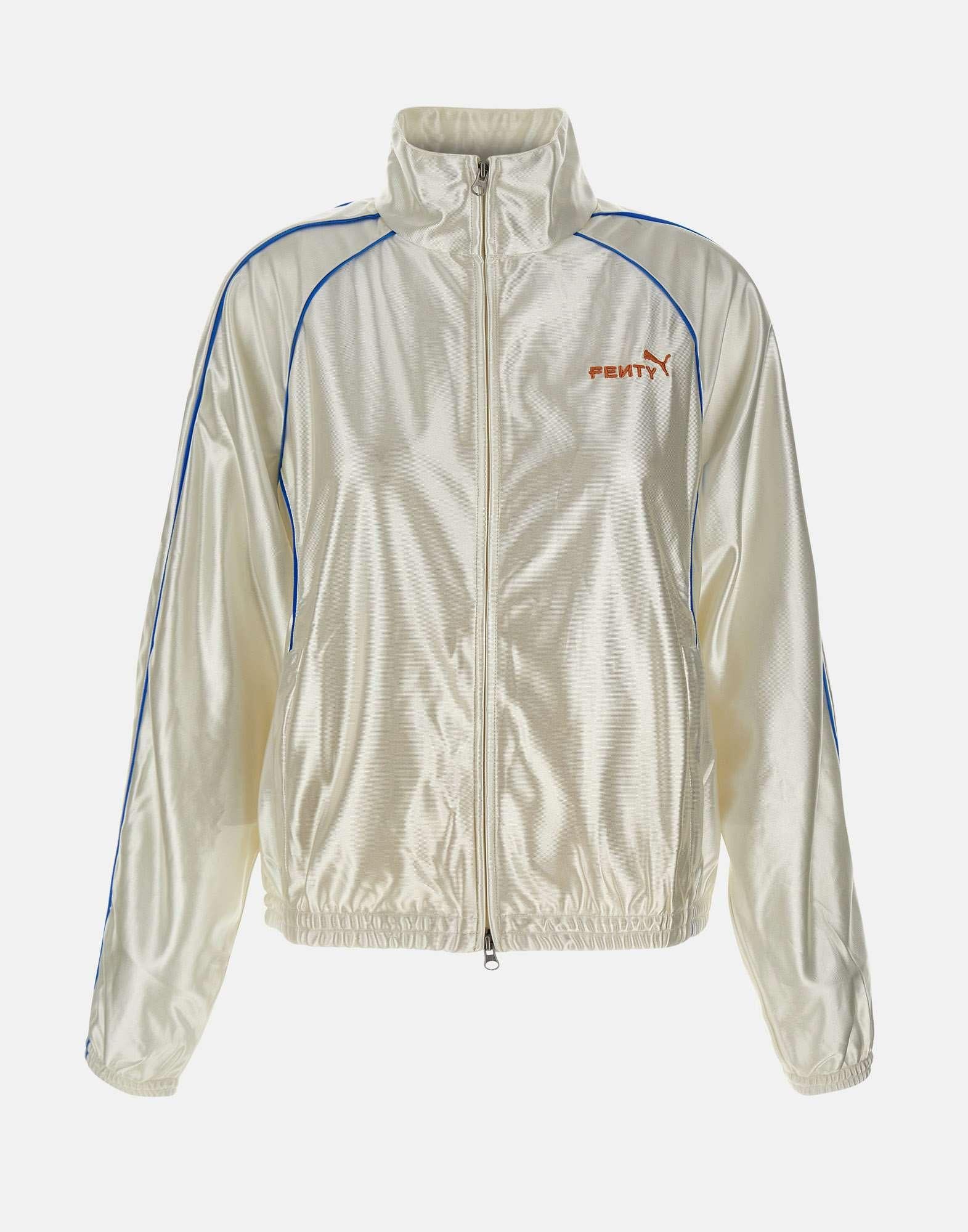 Felpa donna "Fenty x Puma T7" bianca effetto lucido, con dettagli blu e logo arancione ricamato sul petto, dalla nuova collaborazione FENTY x PUMA. Il modello presenta chiusura centrale con zip, polsini e orlo elasticizzati per una vestibilità comoda e sportiva. Colori vivaci e design energico per un look che unisce sport e stile contemporaneo.