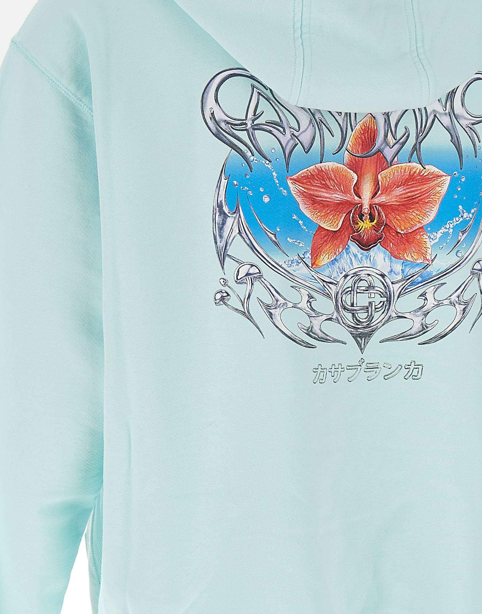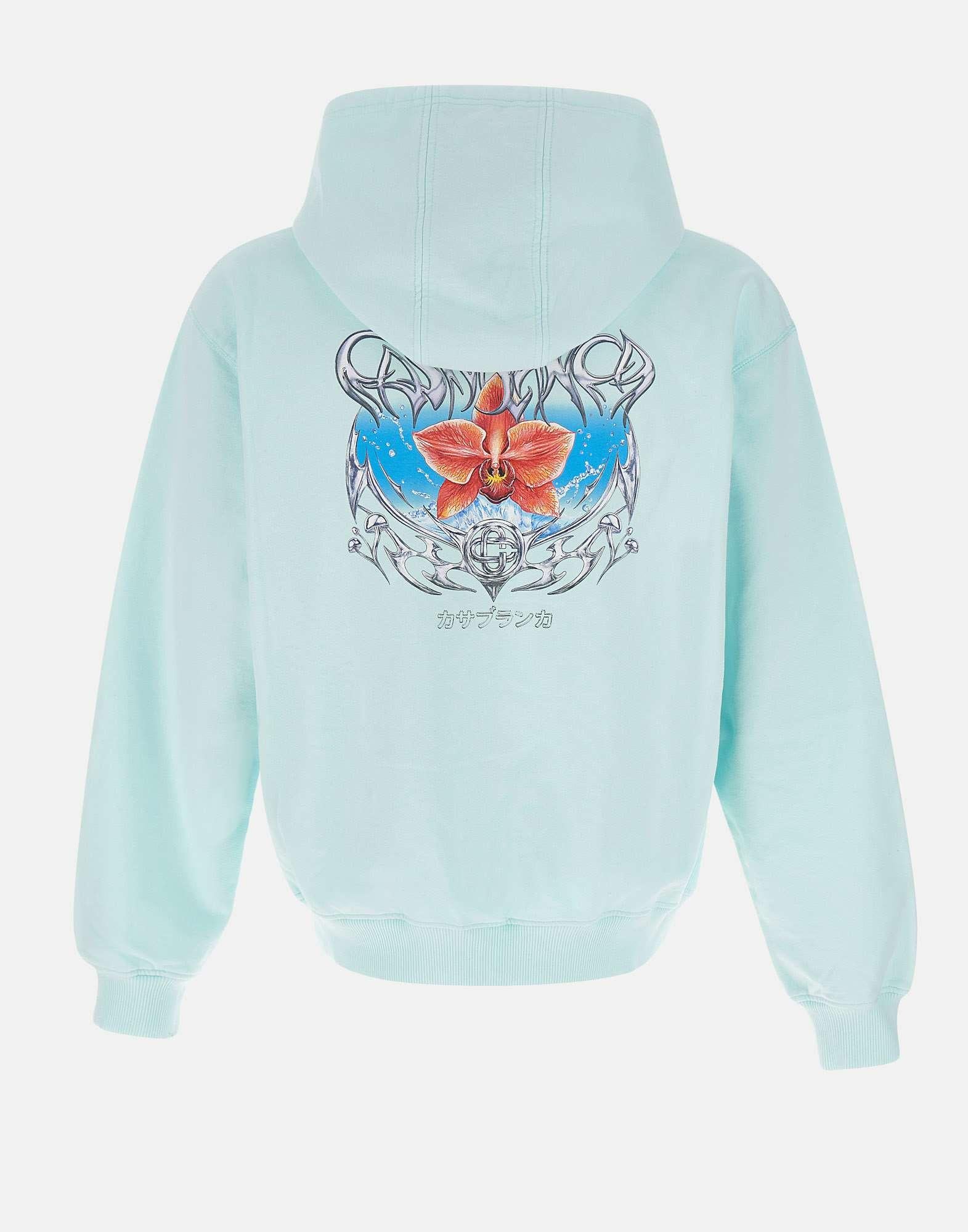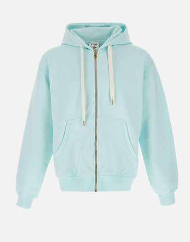 Felpa da uomo Casablanca modello "Casa Chrome Full Zip", realizzata in morbido cotone celeste chiaro, con interno garzato. Il design presenta cappuccio con coulisse, chiusura frontale full zip color oro, maniche lunghe e tasche laterali a filo. Rifinita con bordi a costine e maxi stampa multicolor sul retro. Vestibilità relaxed, ideale per un look urban di lusso.