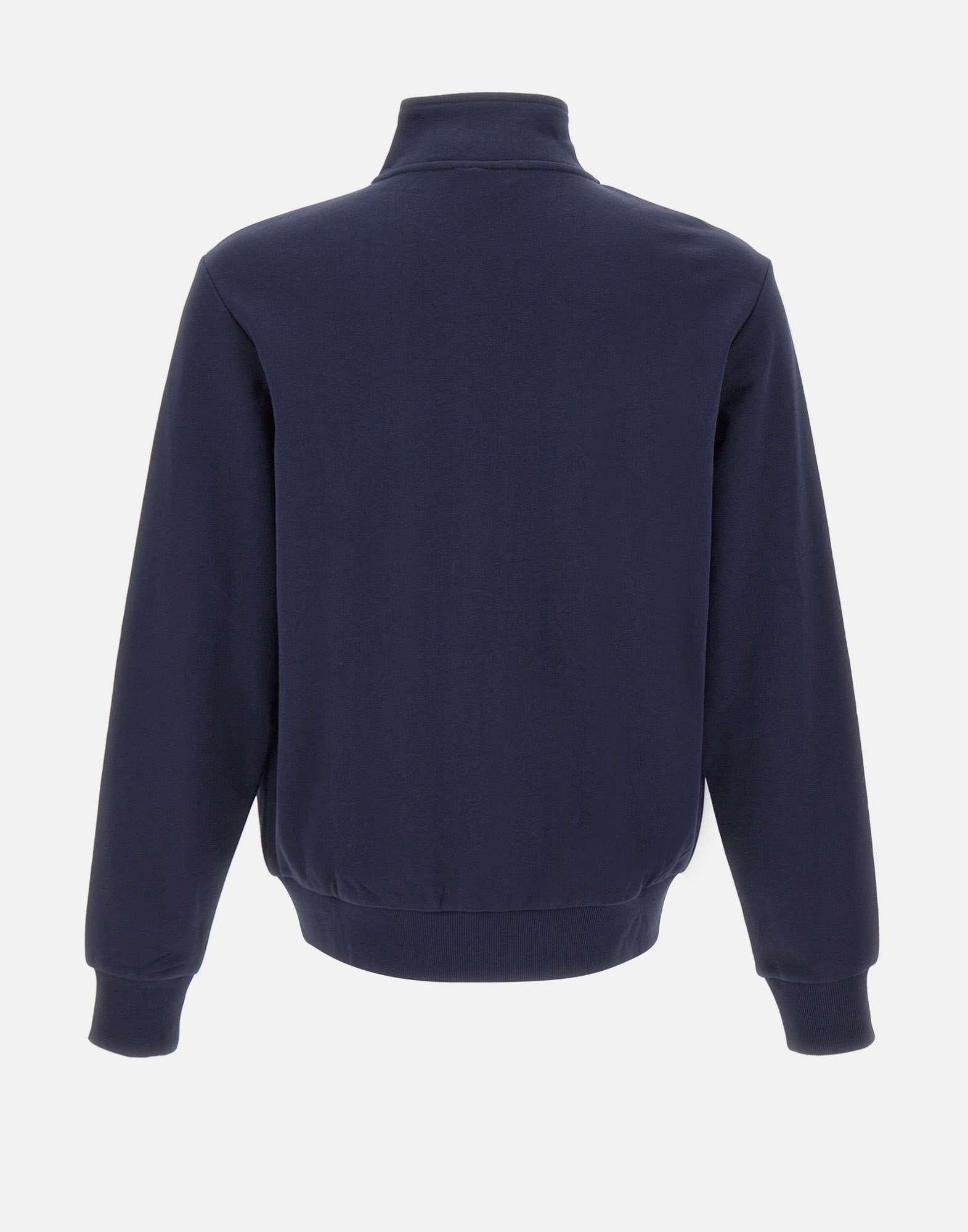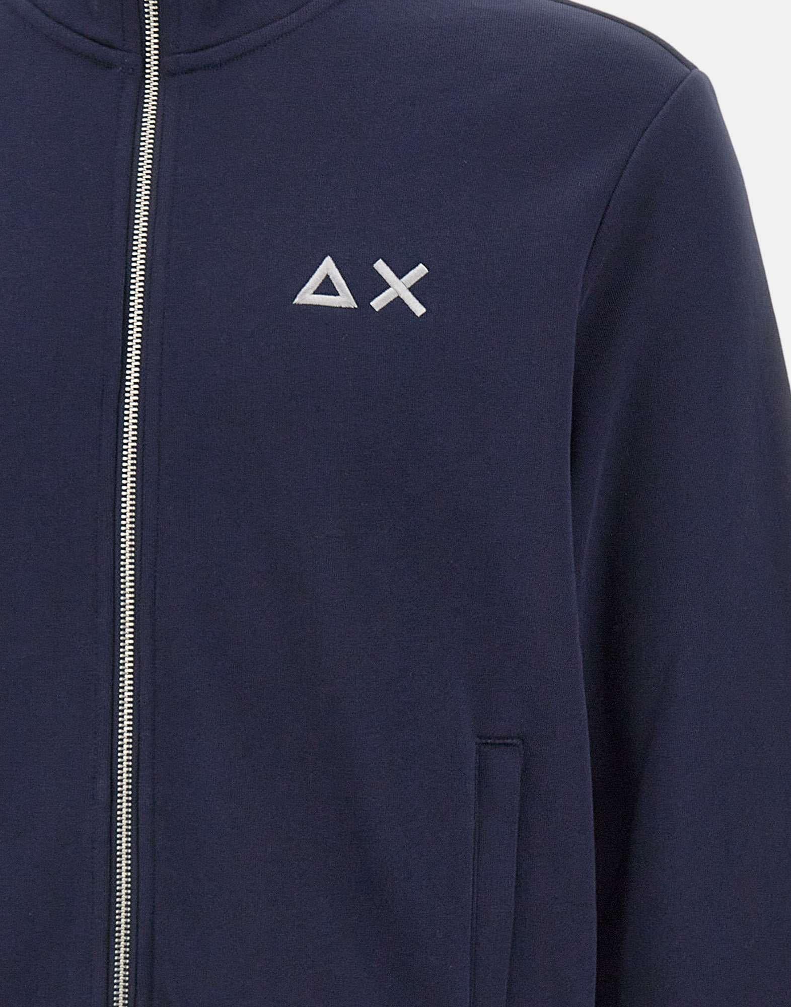 Felpa uomo Sun68 "Track Zip Basic" colore blu, appartenente alla linea Everyday. Realizzata in misto cotone morbido con interno felpato, presenta maniche lunghe, colletto in piedi e chiusura frontale con zip in metalleria silver. Le tasche laterali con zip offrono praticità, mentre i bordi a costine e il maxi logo ricamato sul petto completano il design. La vestibilità regular fit assicura comfort e uno stile casual contemporaneo.