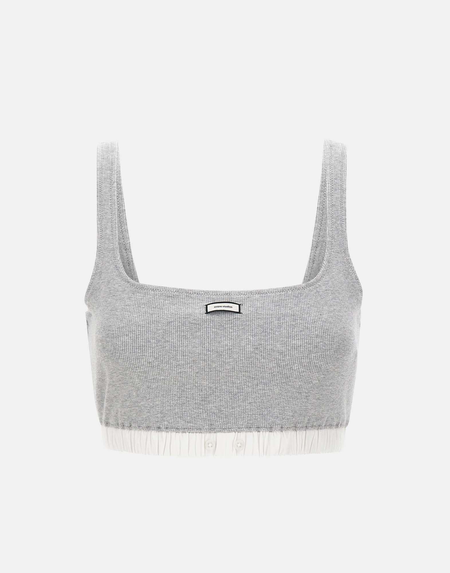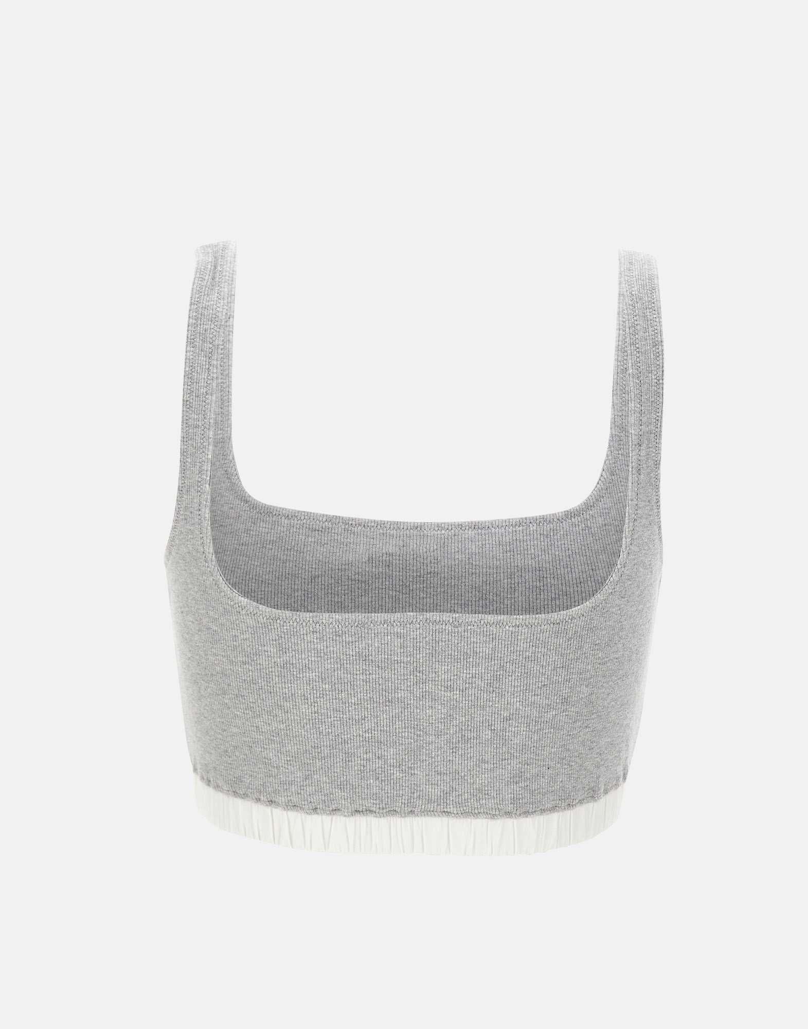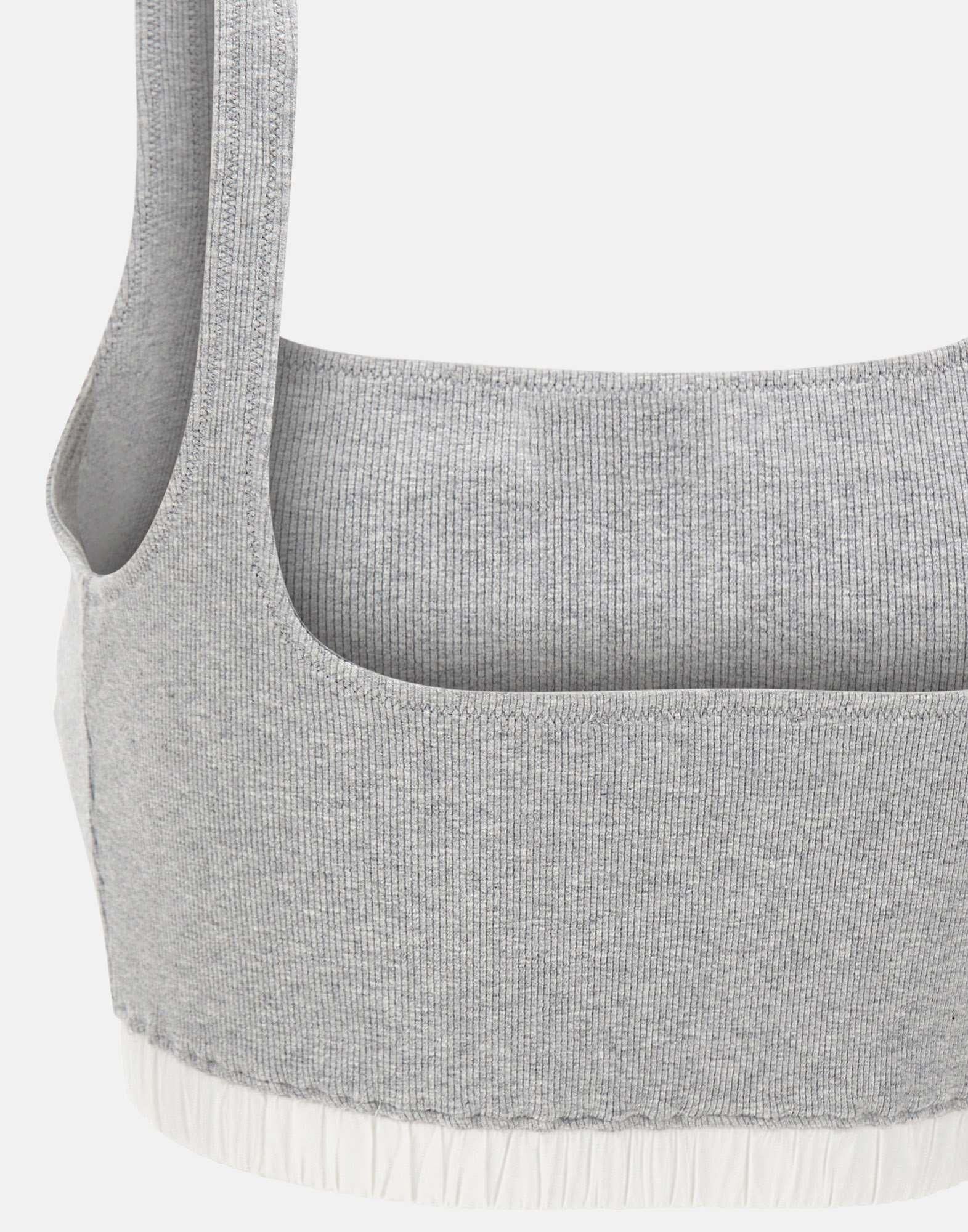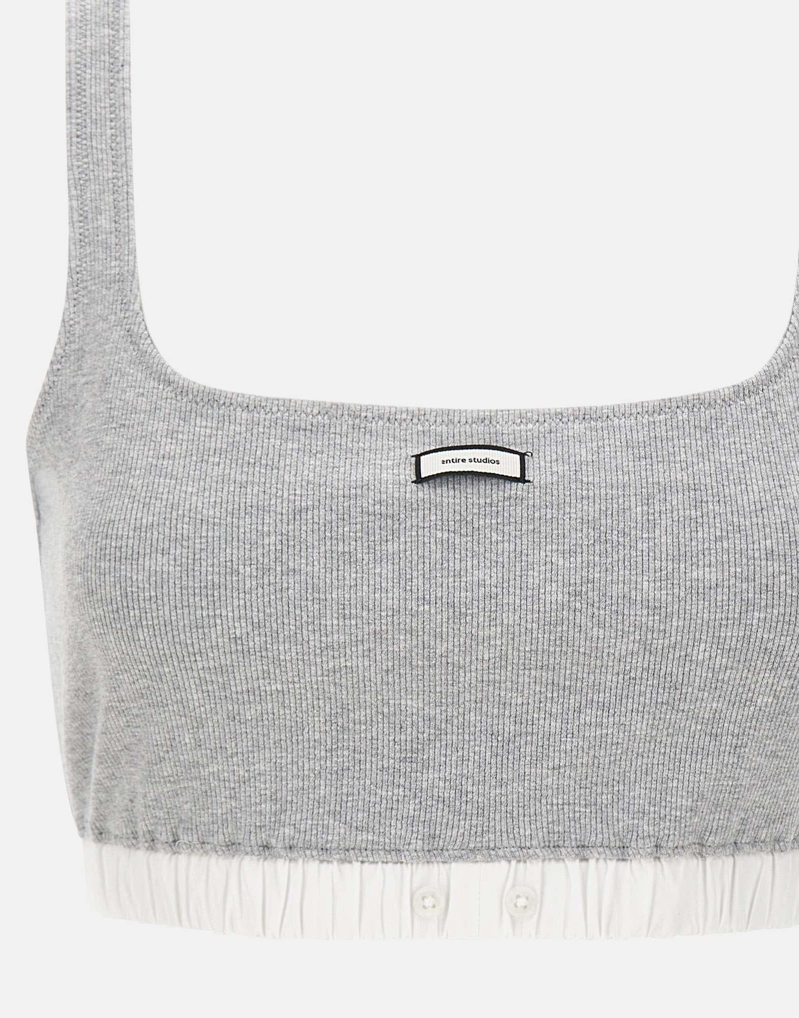 Reggiseno sportivo Entire Studios "Lounge Bra Redwood" realizzato in cotone elasticizzato a costine color grigio, pensato per un comfort essenziale e contemporaneo. Il modello presenta una fascia elastica bianca sotto il seno che assicura sostegno e vestibilità stabile durante l'uso quotidiano. Il design è completato dal patch logo applicato sul petto, dettaglio discreto e riconoscibile. Vestibilità regular fit, ideale per momenti di relax o come base per look athleisure.