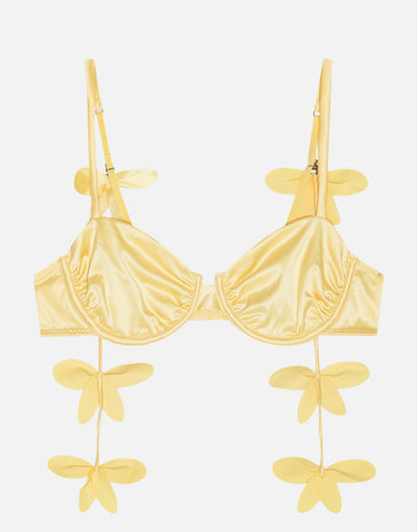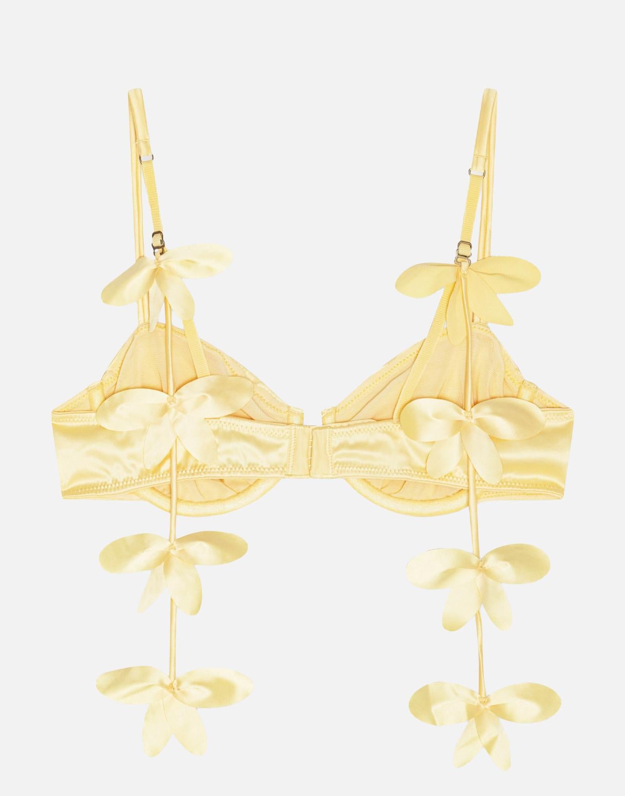 Reggiseno donna Rotate Birger Christensen X Love Stories color giallo chiaro, con ferretti in metallo sostenitivi per una linea strutturata e un supporto definito. Il modello presenta spalline regolabili e chiusura sul retro con gancetti regolabili per una vestibilità personalizzata. Rifinito con dettagli di fasce pendenti arricchite da fiori tono su tono, aggiunge un accento distintivo e curato nei dettagli, ideale come lingerie dal carattere moderno.