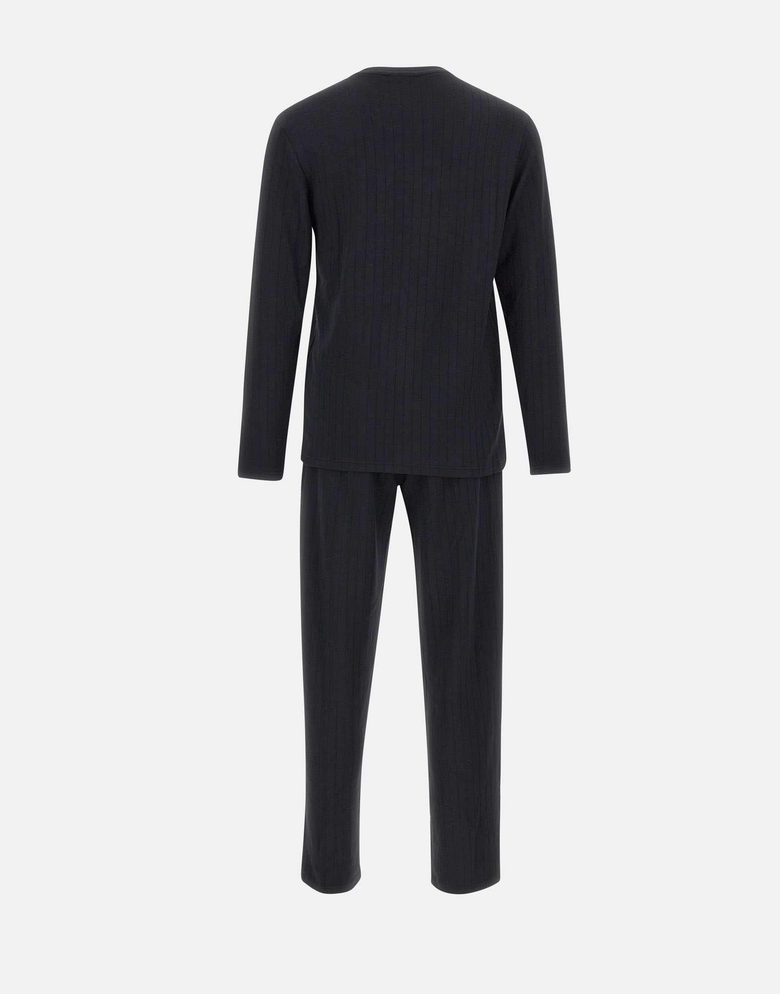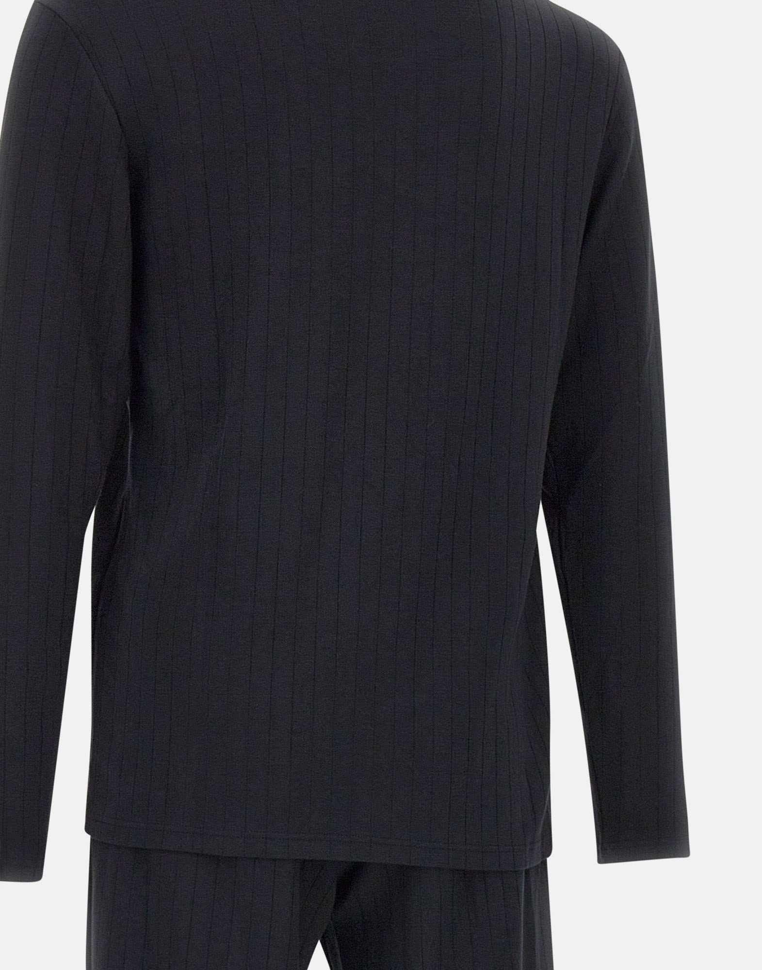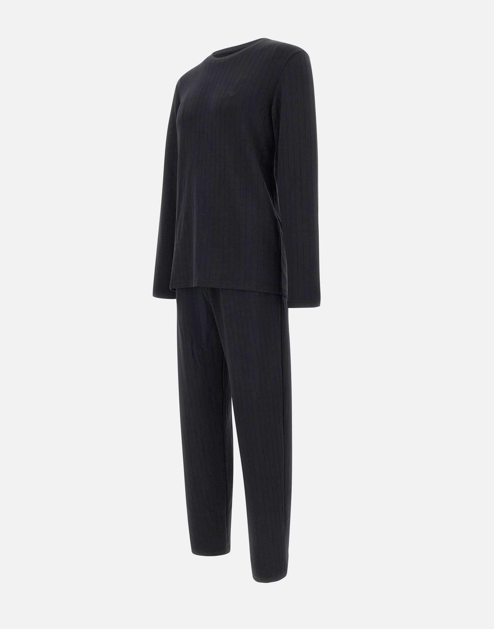 Il completo pigiama Emporio Armani colore nero è realizzato in morbido tessuto misto modal stretch, che garantisce comfort e traspirabilità. La maglia a maniche lunghe con girocollo presenta una trama rigata sottile e il logo ricamato tono su tono sul petto, mentre i pantaloni con vita elasticata e tasche laterali offrono praticità e libertà di movimento. Un completo elegante e confortevole, ideale per il relax quotidiano.