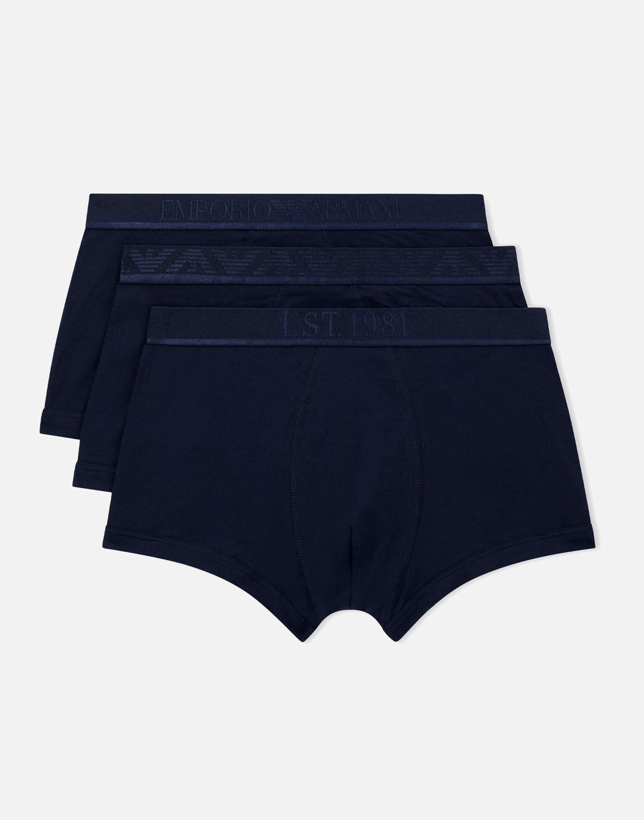 Set tre pack boxer Emporio Armani in cotone organico stretch, blu, Armani Sustainability Values, banda elastica con logo, regular fit