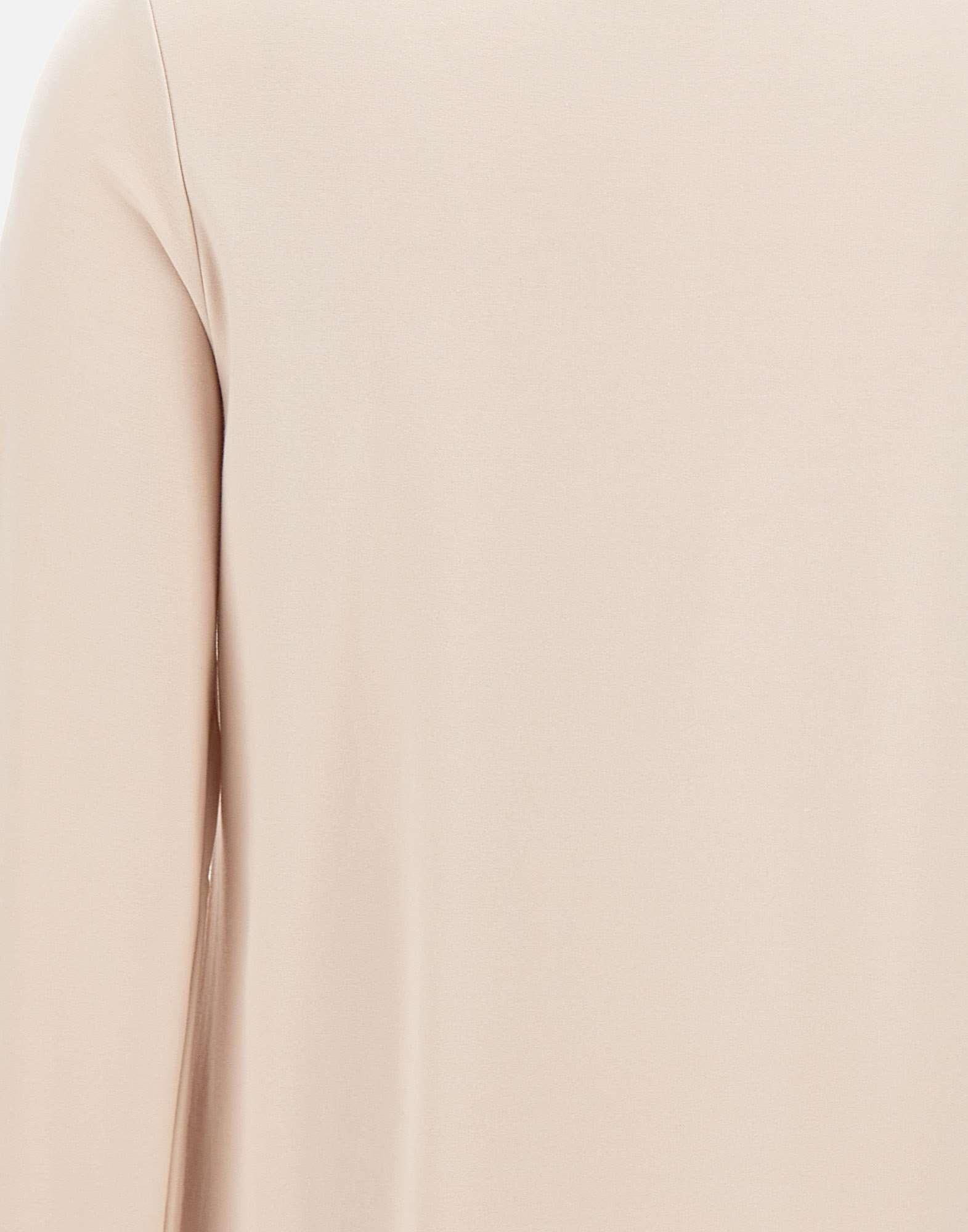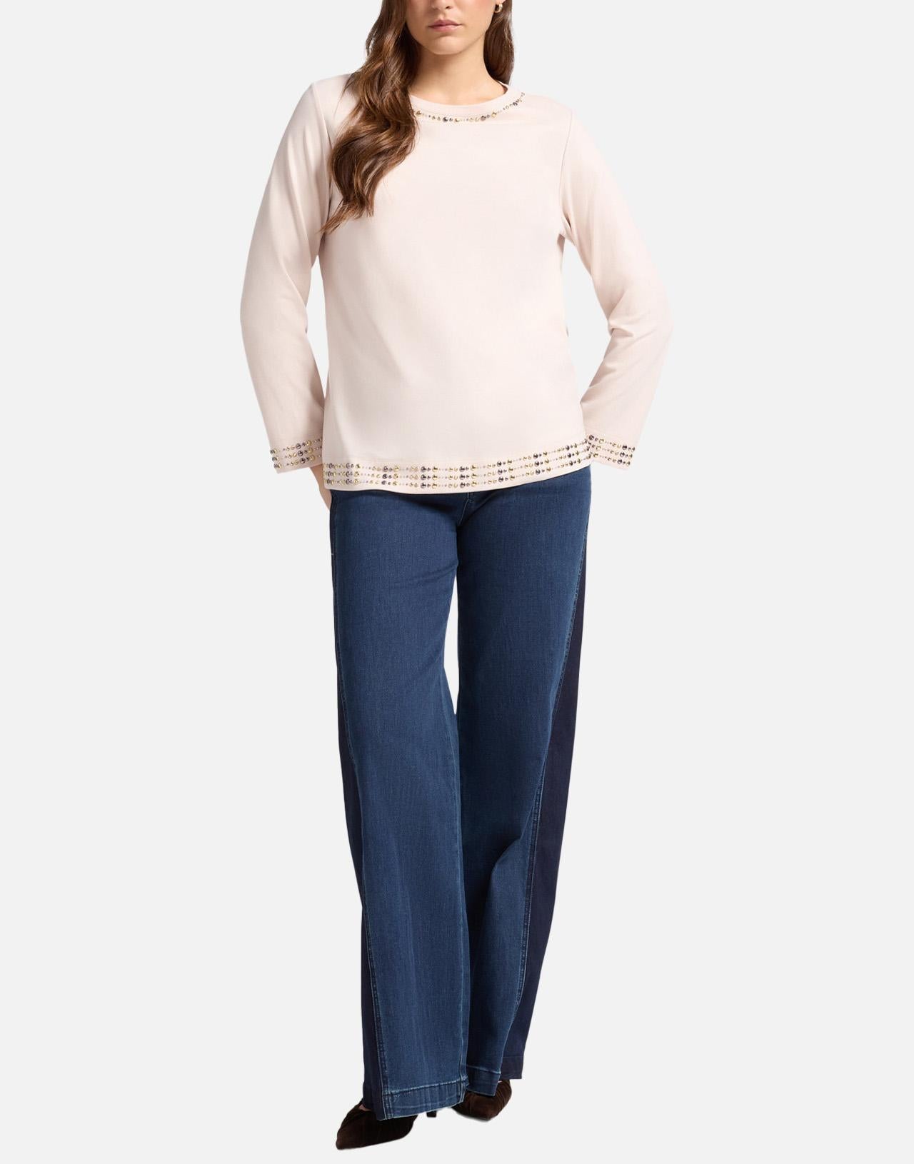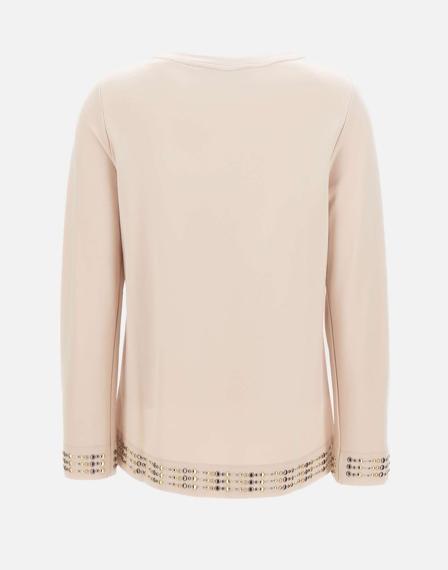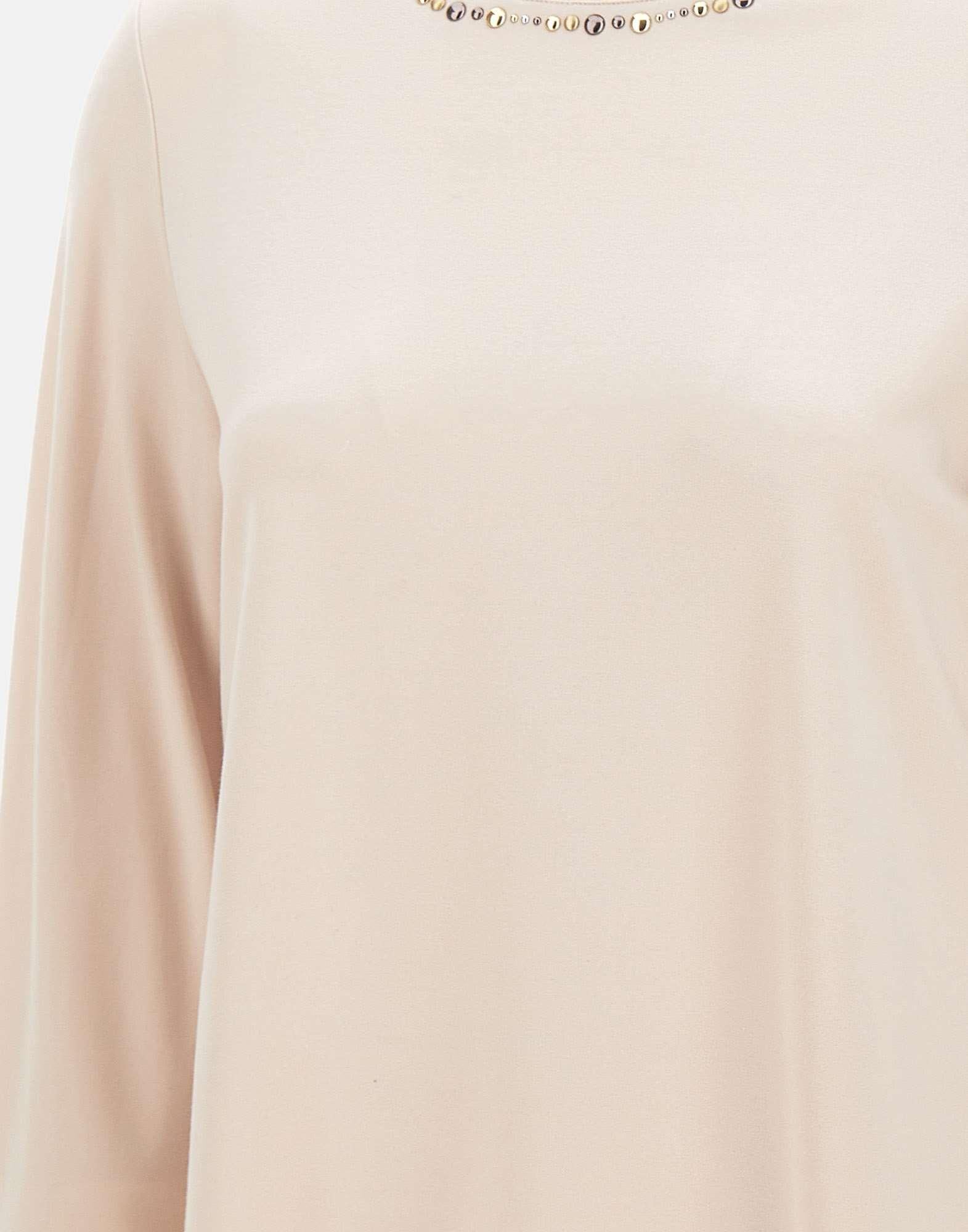Blusa Elena Mirò in crepe di viscosa stretch beige, elegante e luminosa. Presenta scollo tondo e maniche lunghe, impreziosita da un motivo di micro borchiette oro e argento che illuminano i profili. Vestibilità regular, ideale per aggiungere un tocco sofisticato ai look da giorno o da sera.