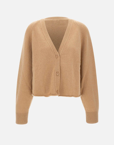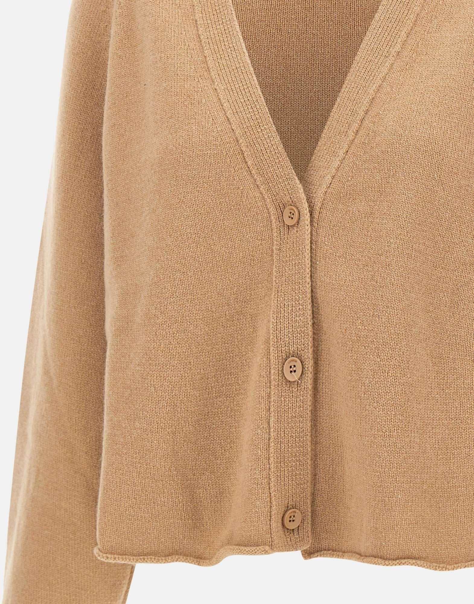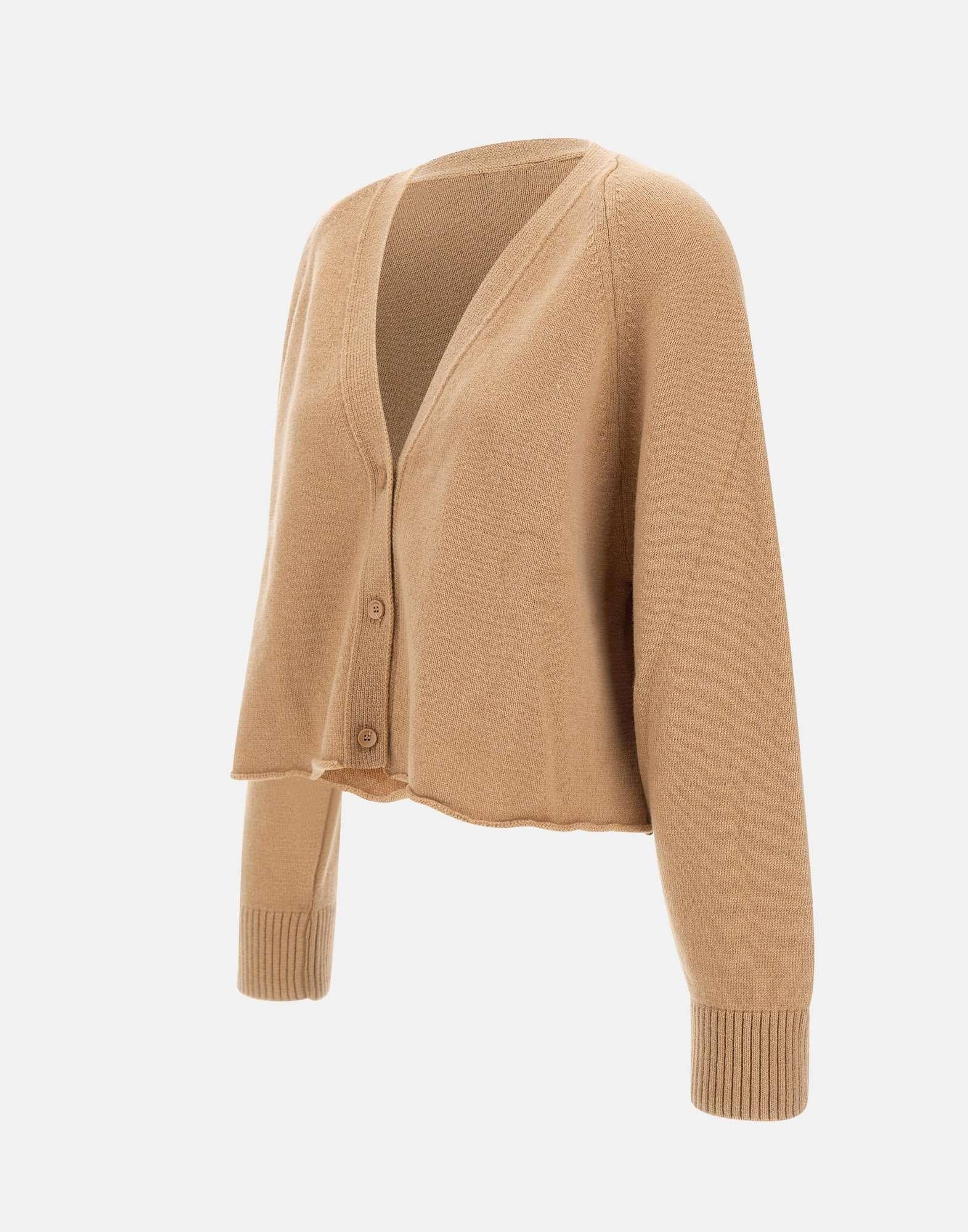 Cardigan donna Laneus in misto lana merinos extrafine e cashmere color cammello, con taglio cropped e fondo a taglio vivo che crea un elegante effetto arrotolato. Un capo essenziale rivisitato in chiave contemporanea, dal design minimale ma con un dettaglio distintivo. Presenta una silhouette regular, chiusura frontale con 3 bottoni e polsini a costine. Morbido, raffinato. Made in Italy.