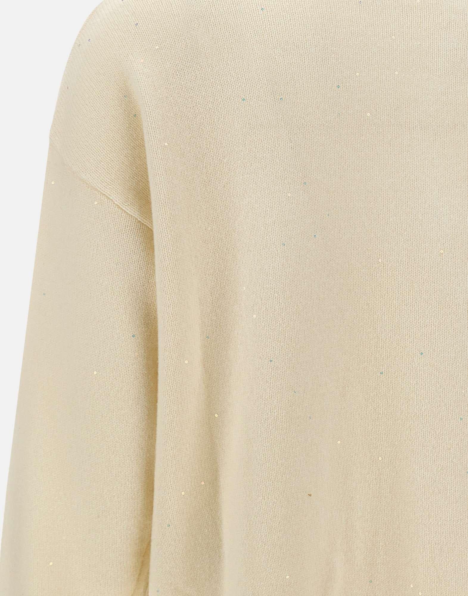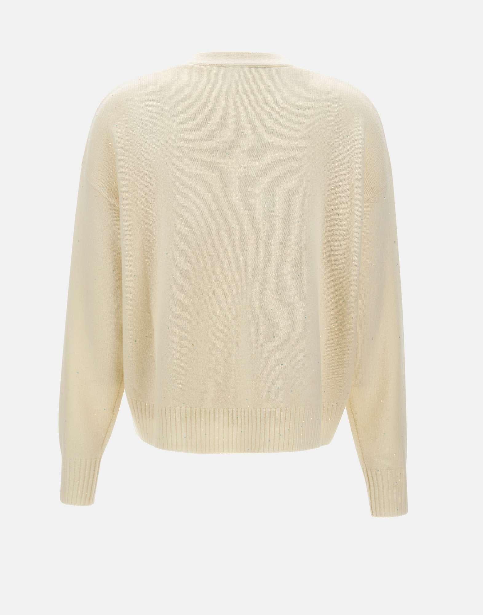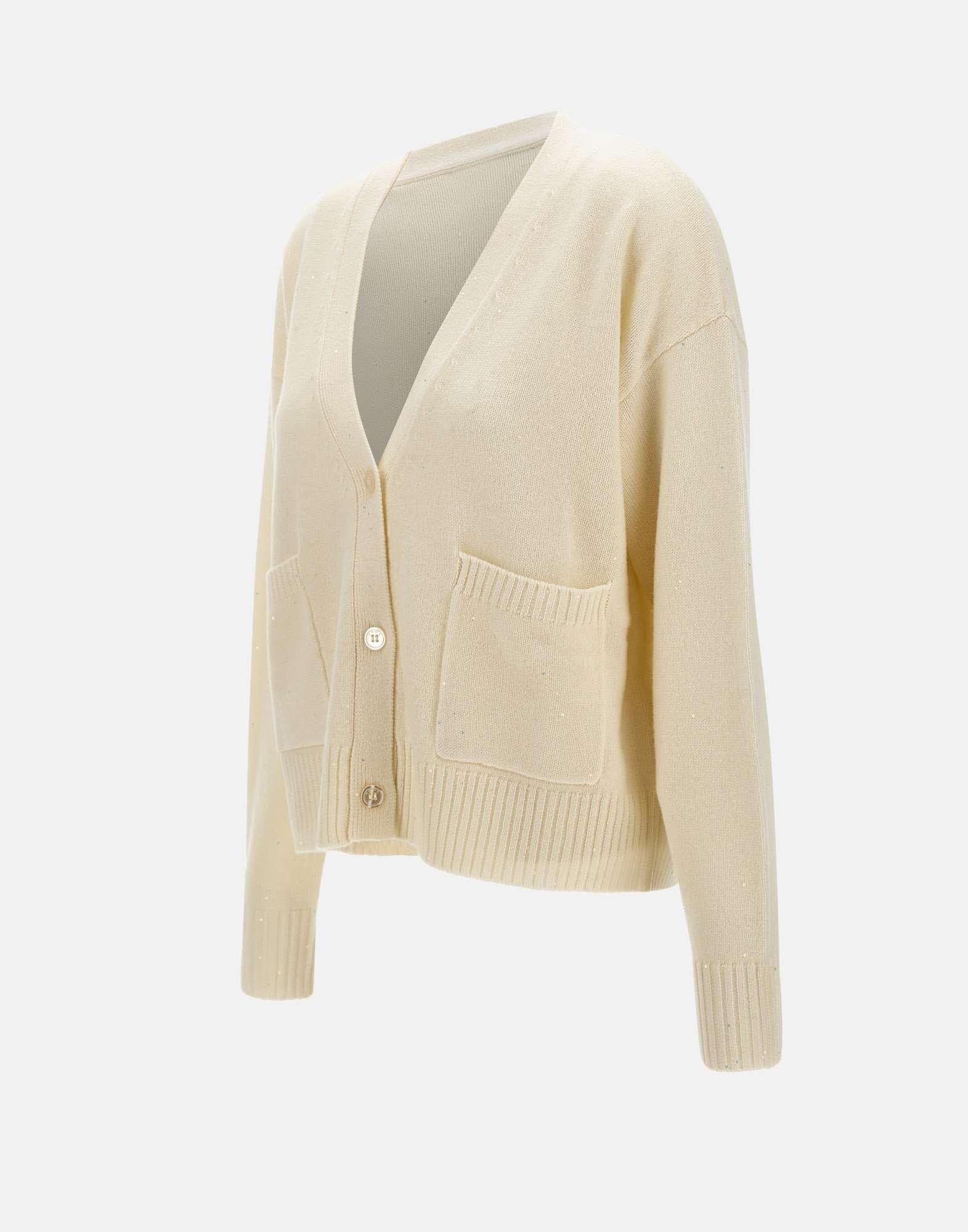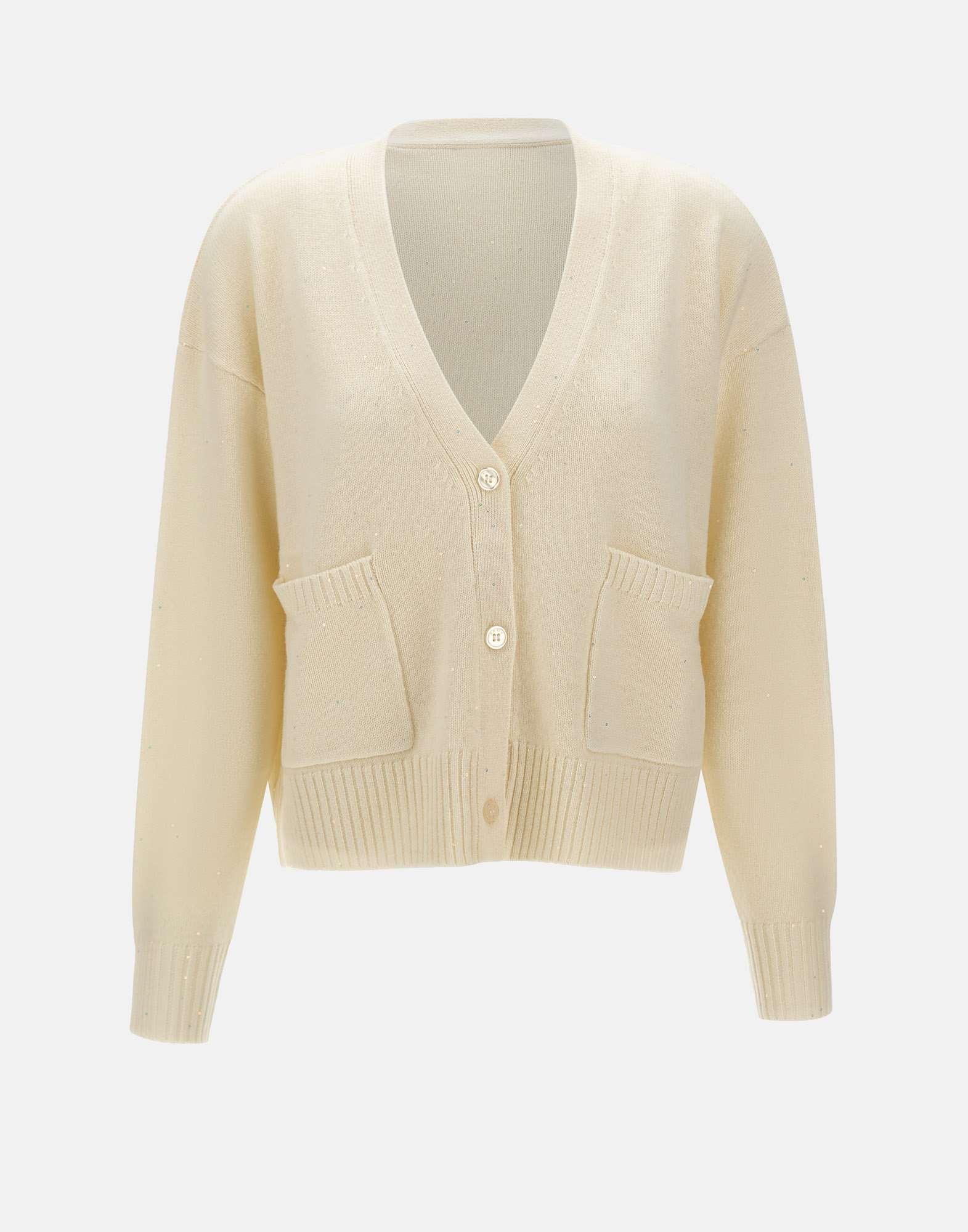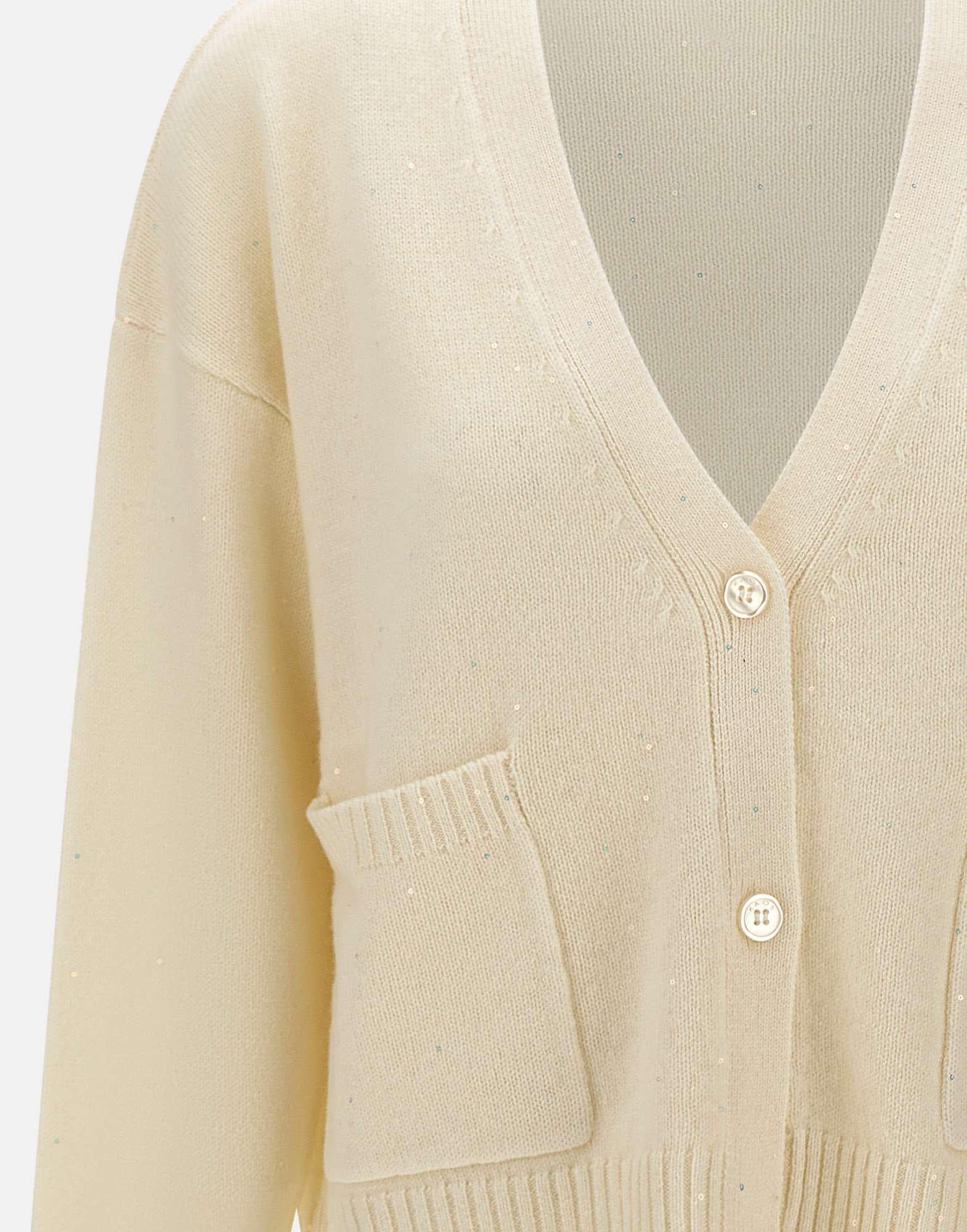 Aggiungi un tocco di luce ai tuoi look quotidiani con questo elegante cardigan Kaos da donna. Realizzato in morbida lana color panna, presenta un design sofisticato ma easy-to-wear, impreziosito da piccole paillettes in tinta all over, che regalano un effetto brillante ma discreto. Dotato di maniche lunghe con spalle scese, scollo a V e bordi a costine, offre una vestibilità relaxed fit ideale per il massimo comfort. Completano il design le tasche anteriori e la chiusura con bottoni in madreperla, dettagli che uniscono praticità ed eleganza.