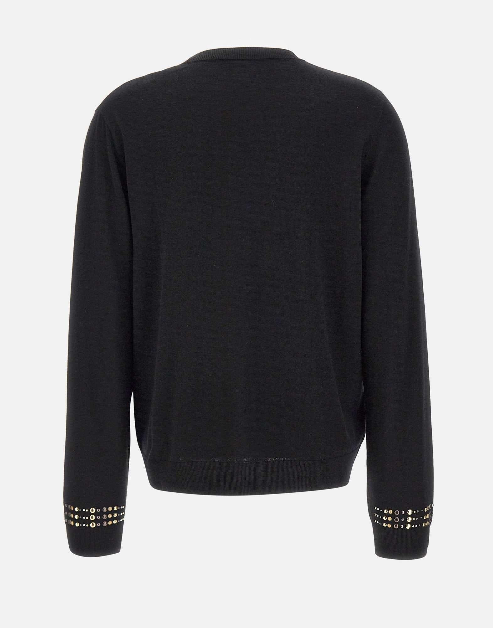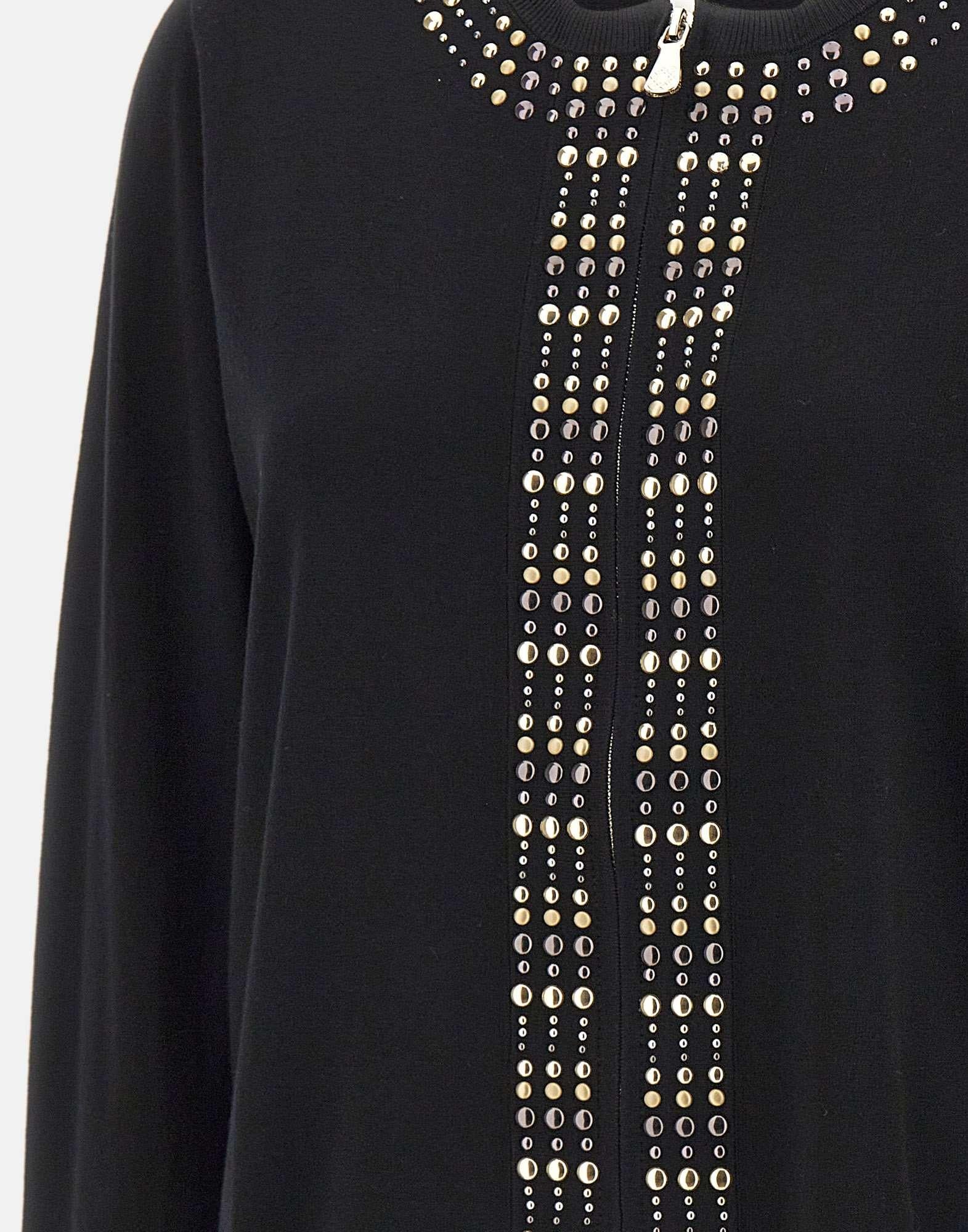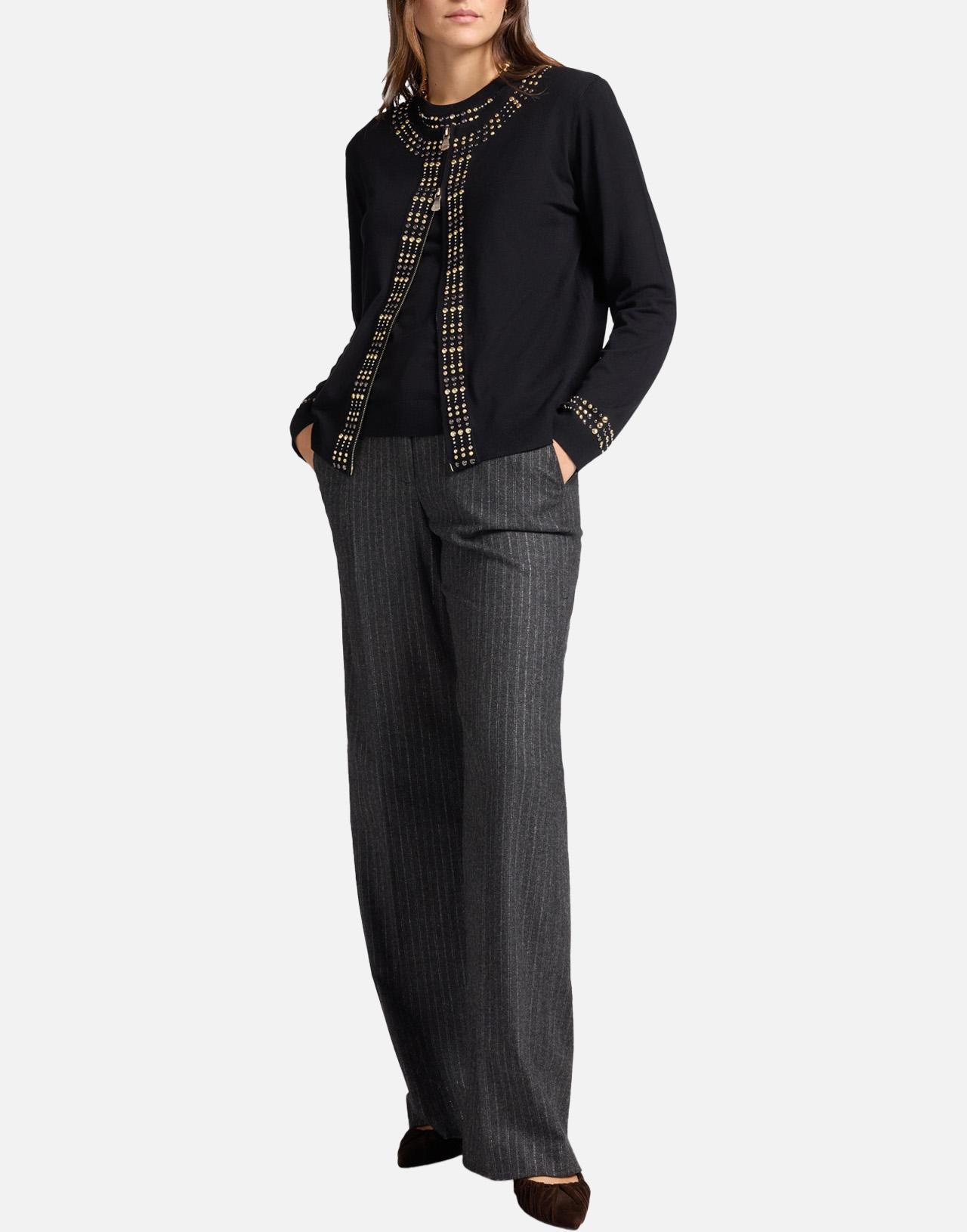 Cardigan donna Elena Mirò in misto viscosa color nero, dal fascino elegante e contemporaneo. Presenta scollo tondo, maniche lunghe e chiusura frontale con zip. I profili decorati con borchiette argento e oro donano un tocco luminoso e raffinato. La vestibilità relaxed fit assicura comfort e femminilità, perfetta per completare look casual-chic o serali.