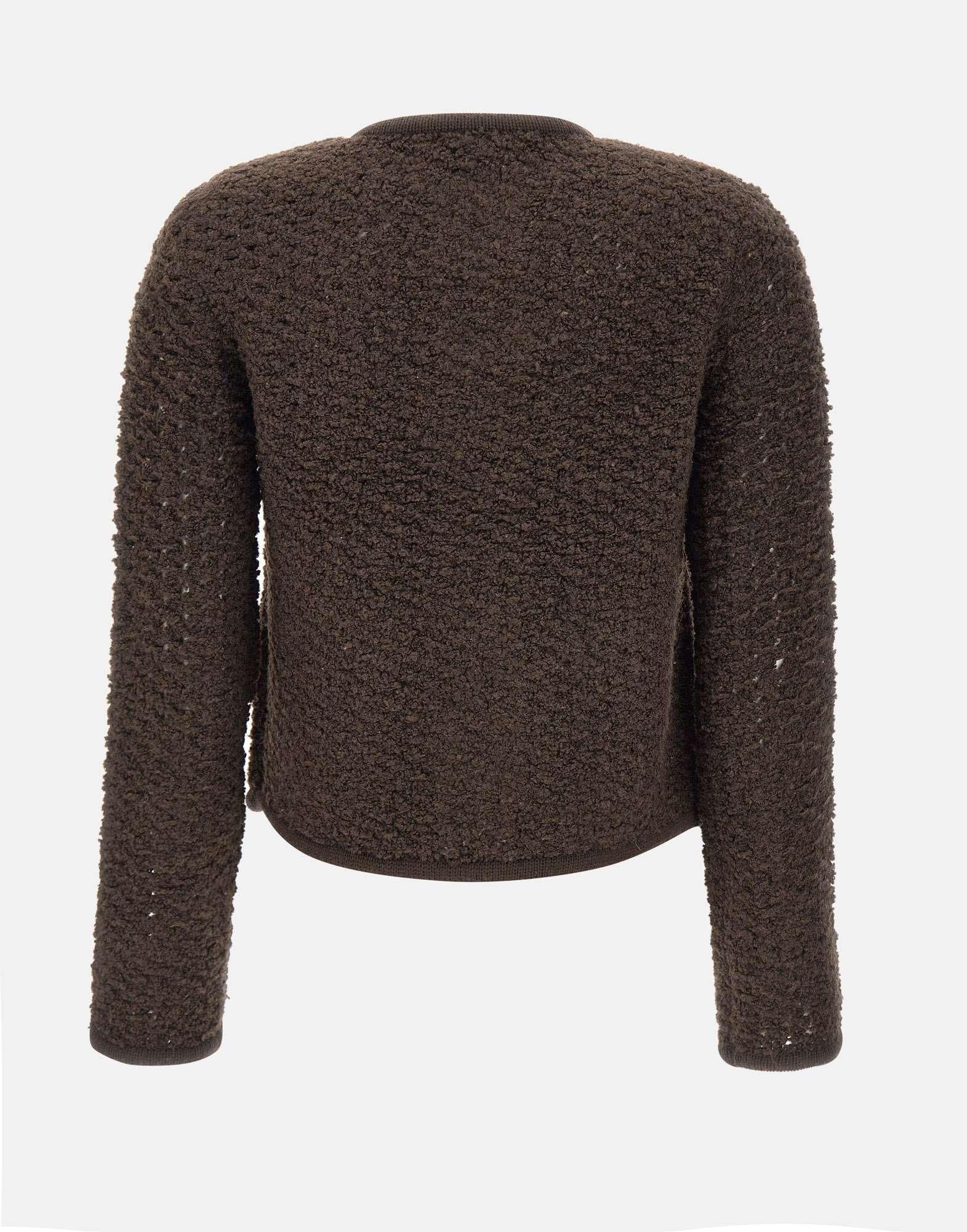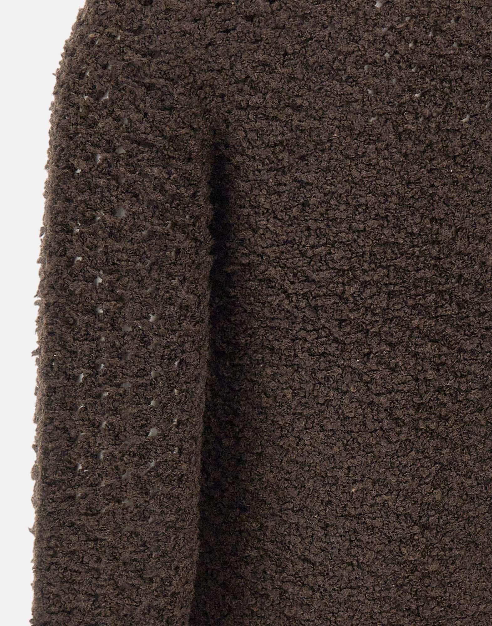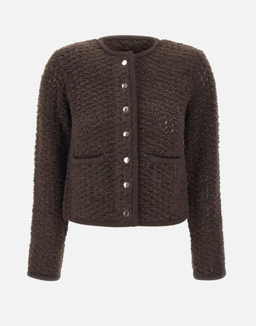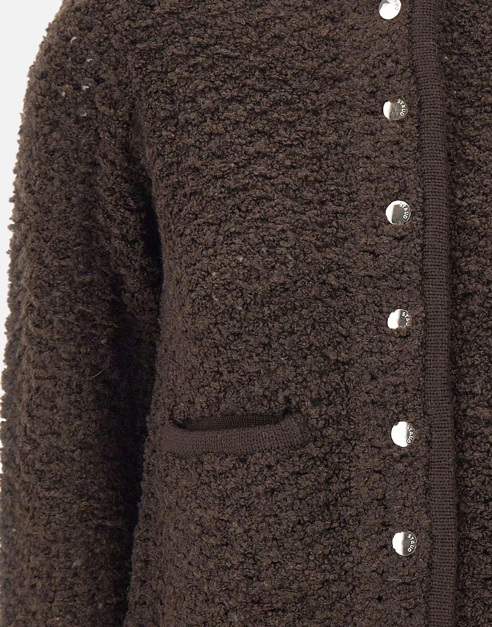 Cardigan donna Staud "Lisson" a maglia effetto bouclé color cioccolato, perfetto per aggiungere un tocco sofisticato e contemporaneo al guardaroba. Presenta chiusura centrale con bottoni metallici, taschini frontali e girocollo. Orli e polsini a costine definiscono la silhouette leggermente over, per uno stile comodo e attuale.