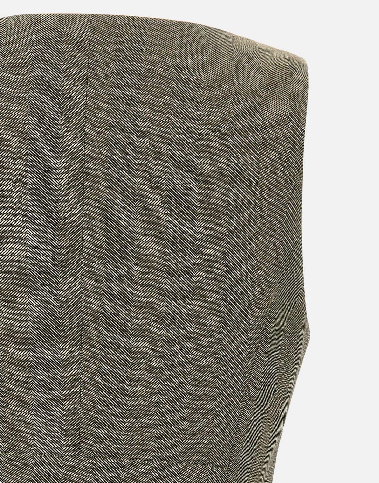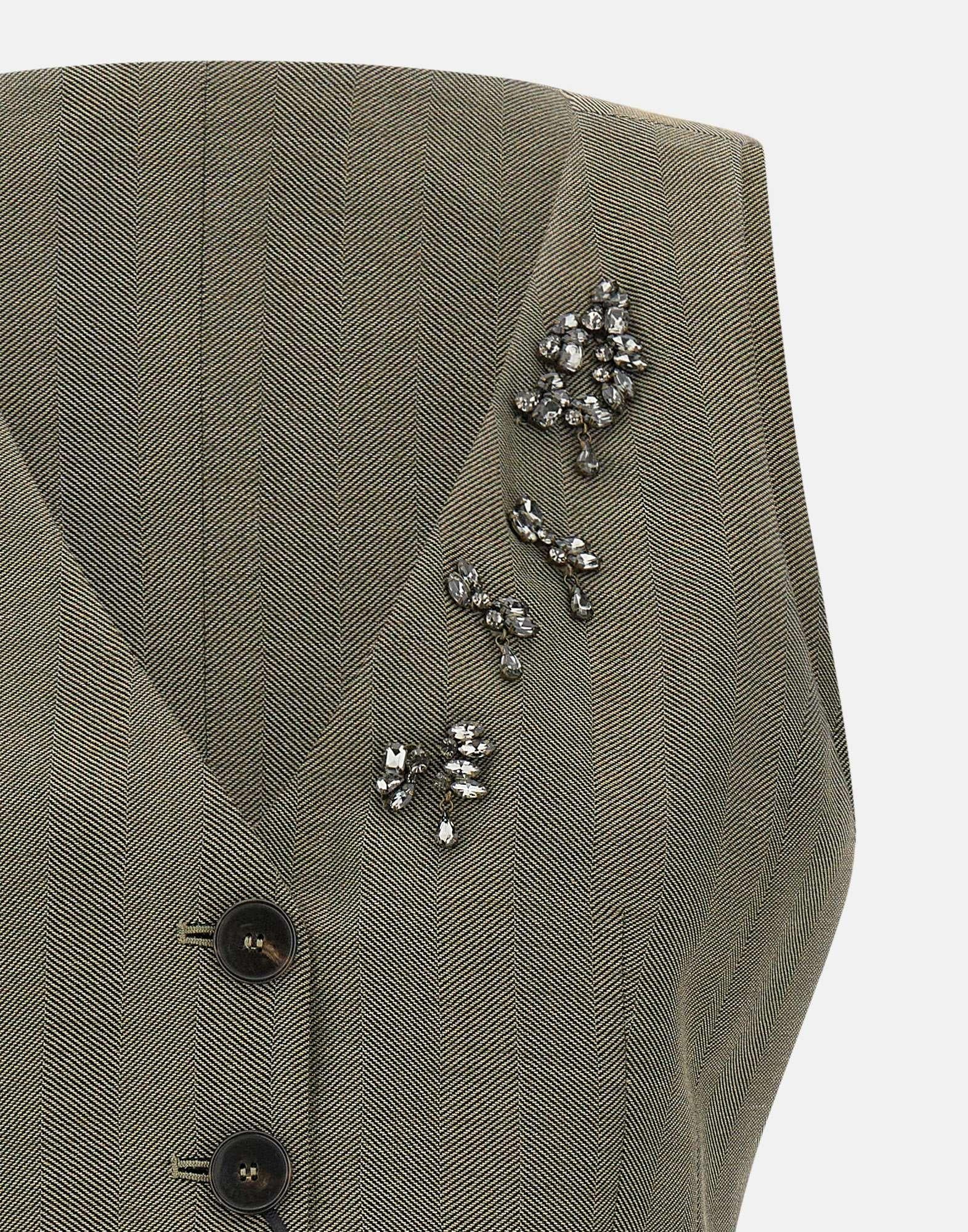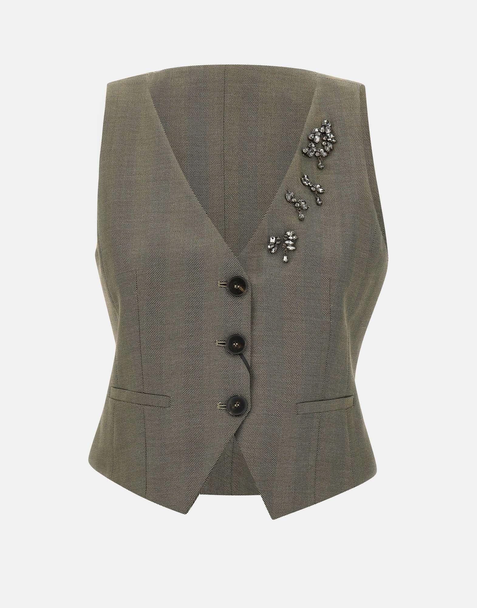 Gilet donna Marella "Cantico" in misto lana color kaki con micro motivo spigato, definito da un taglio sartoriale e da un fit aderente con lunghezza in vita. Il modello presenta scollo a V e chiusura con bottoni, impreziosita dal dettaglio gioiello dei cristalli applicati sullo scollo. Sono presenti tasche a filetto sui fianchi e retro con finta martingala che completa la costruzione del capo. Un gilet femminile e contemporaneo, perfetto come nuovo elemento cool da interpretare con versatilità.