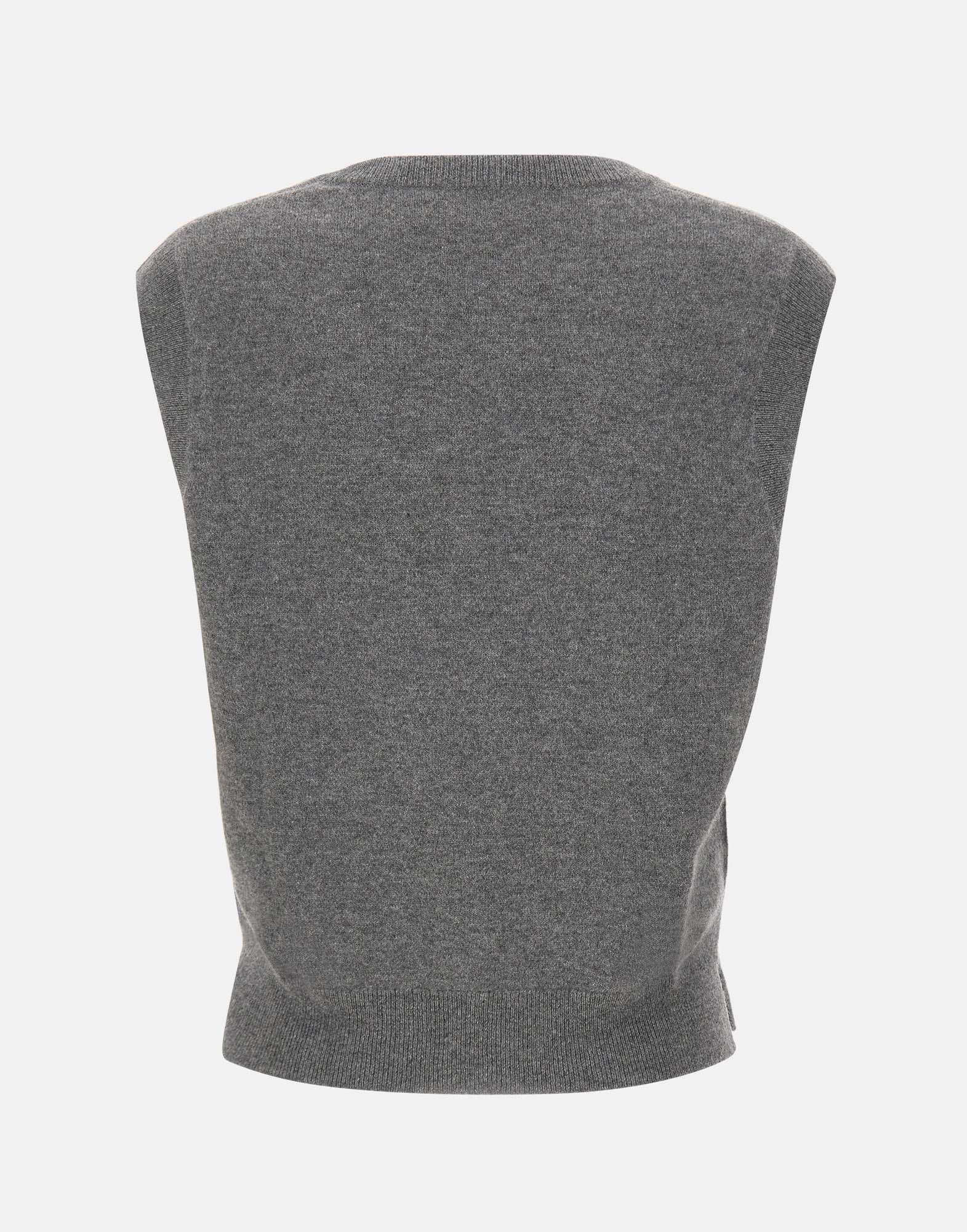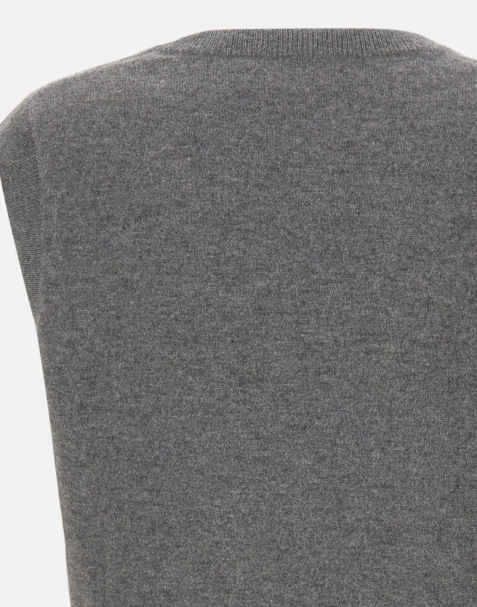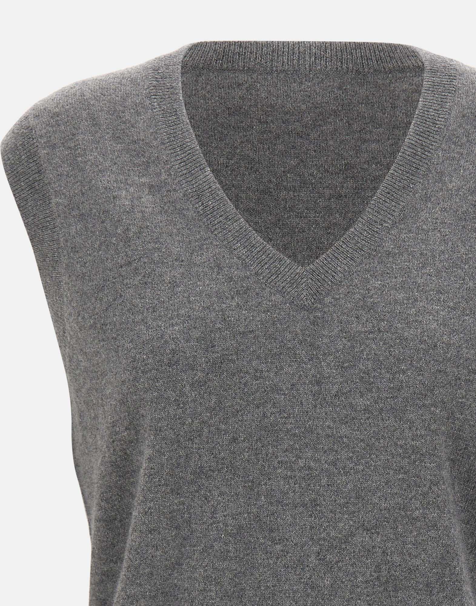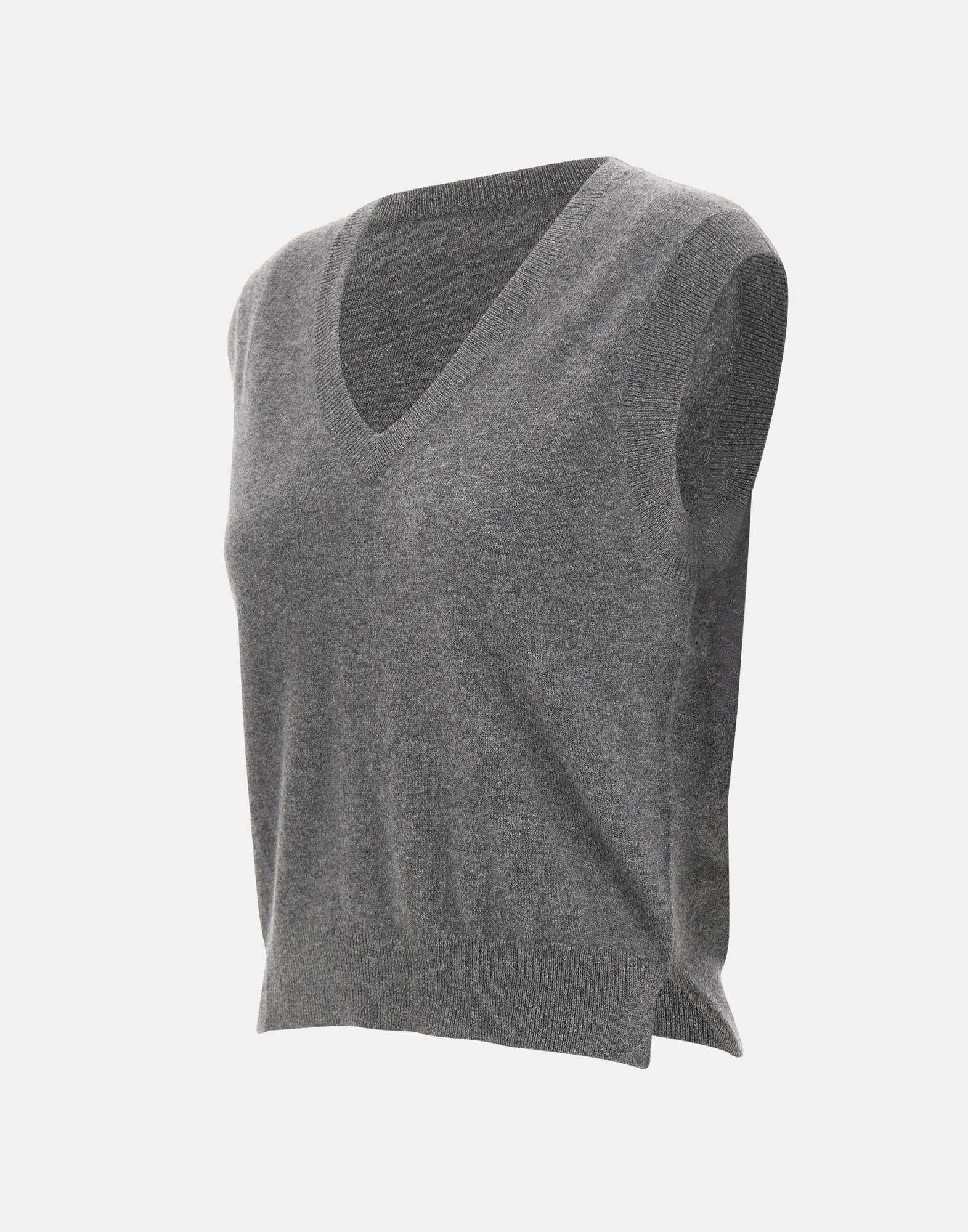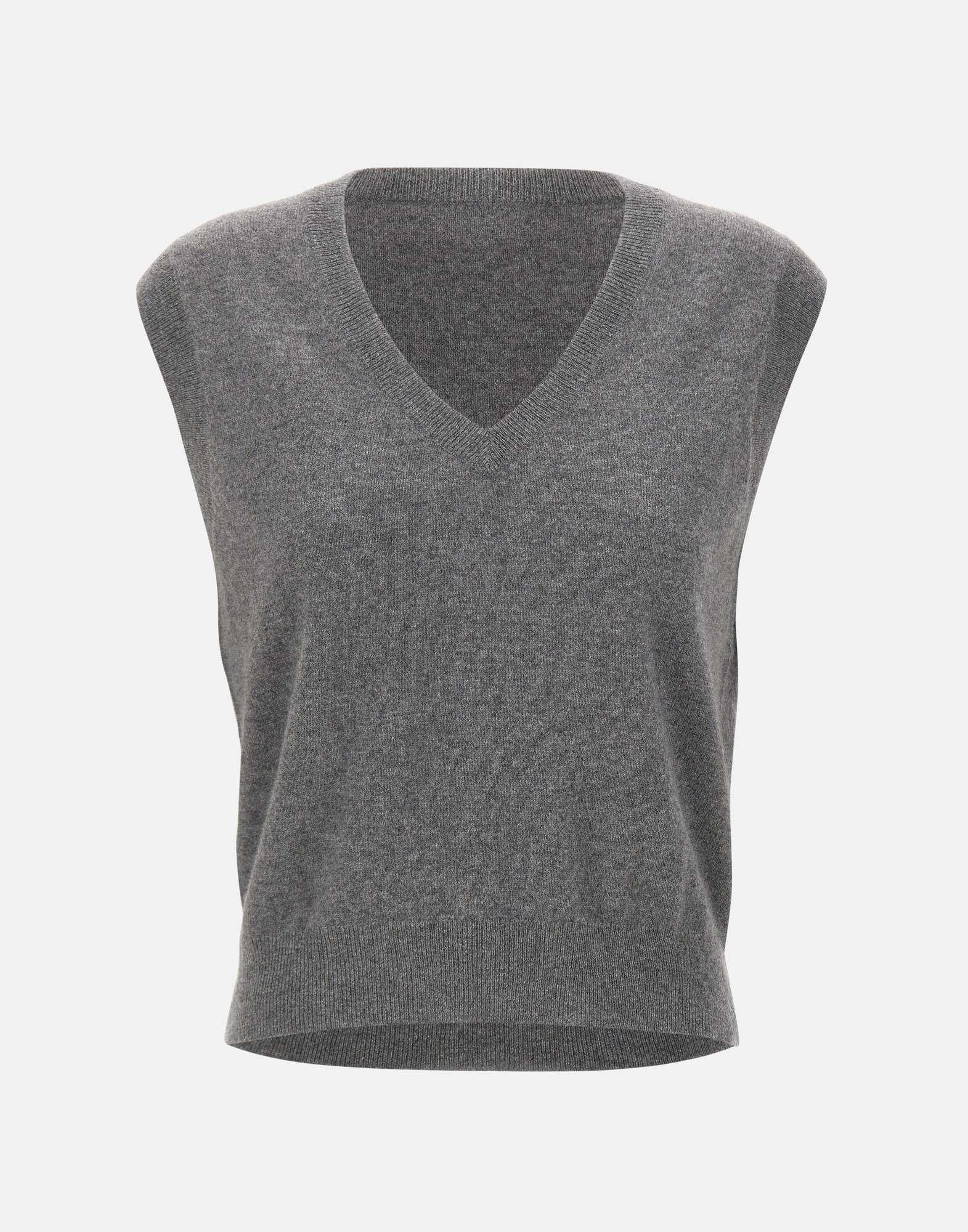 Gilet in maglia donna Not Shy Cashmere "Elsie", modello smanicato in 100% puro cashmere, grigio, dal design essenziale e versatile. Presenta scollo a V e orli a costine, con piccoli spacchi laterali sul fondo che donano movimento alla silhouette. La vestibilità over assicura comfort e stile, ideale da indossare da sola o a strati per un look contemporaneo e sofisticato.