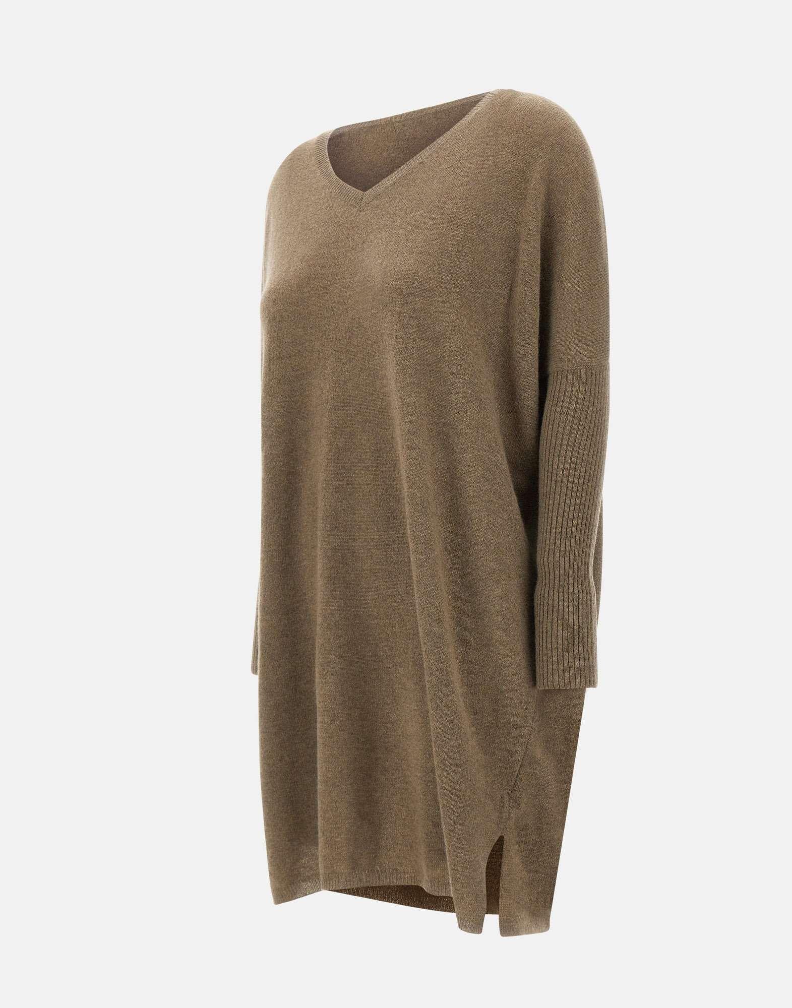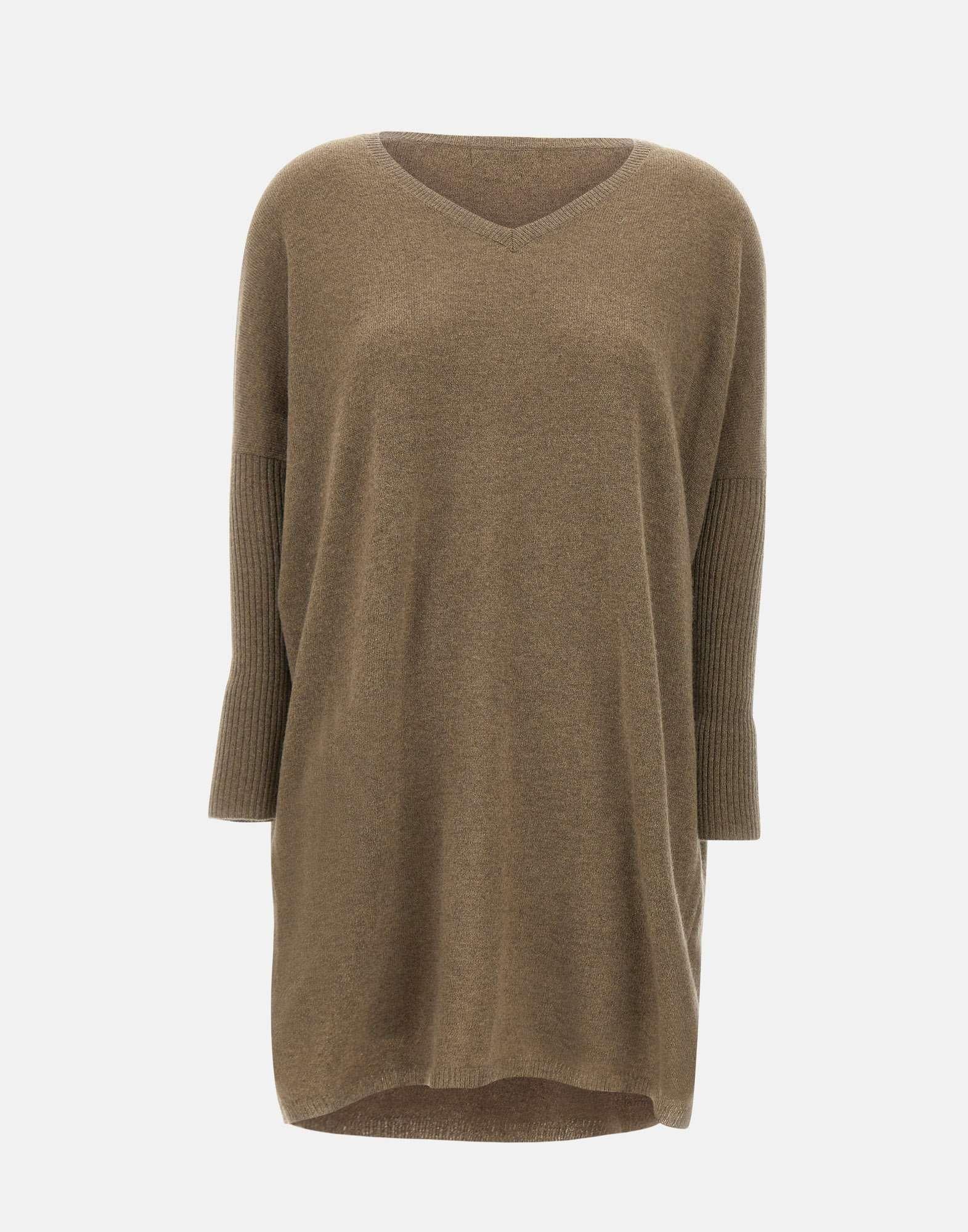 Maglia donna Sweet Cashmere "Bella" in 100% puro cashmere color verdone, dal design avvolgente e rilassato. Caratterizzata da scollo a V, maniche lunghe a costine e finiture a costine, presenta spacchi laterali che donano movimento alla silhouette. La vestibilità over la rende perfetta per un'eleganza disinvolta e contemporanea.