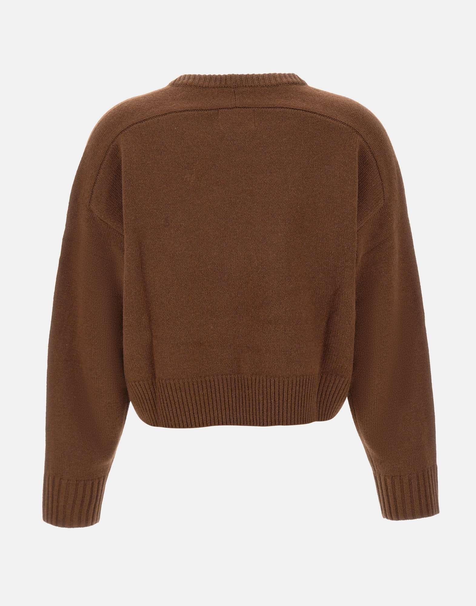 Maglia donna Loulou de Saison "Bruzzi LDS" in lana e cashmere color terracotta, emblema dello stile classico e raffinato del marchio. La vestibilità leggermente corta si combina a un ampio volume, mentre le maniche larghe e le spalle scese creano un look relaxed chic perfetto per ogni occasione. Il dettaglio ricamato a forma di conchiglia sul fondo sinistro aggiunge un tocco distintivo, completato da profili a coste e design cropped.