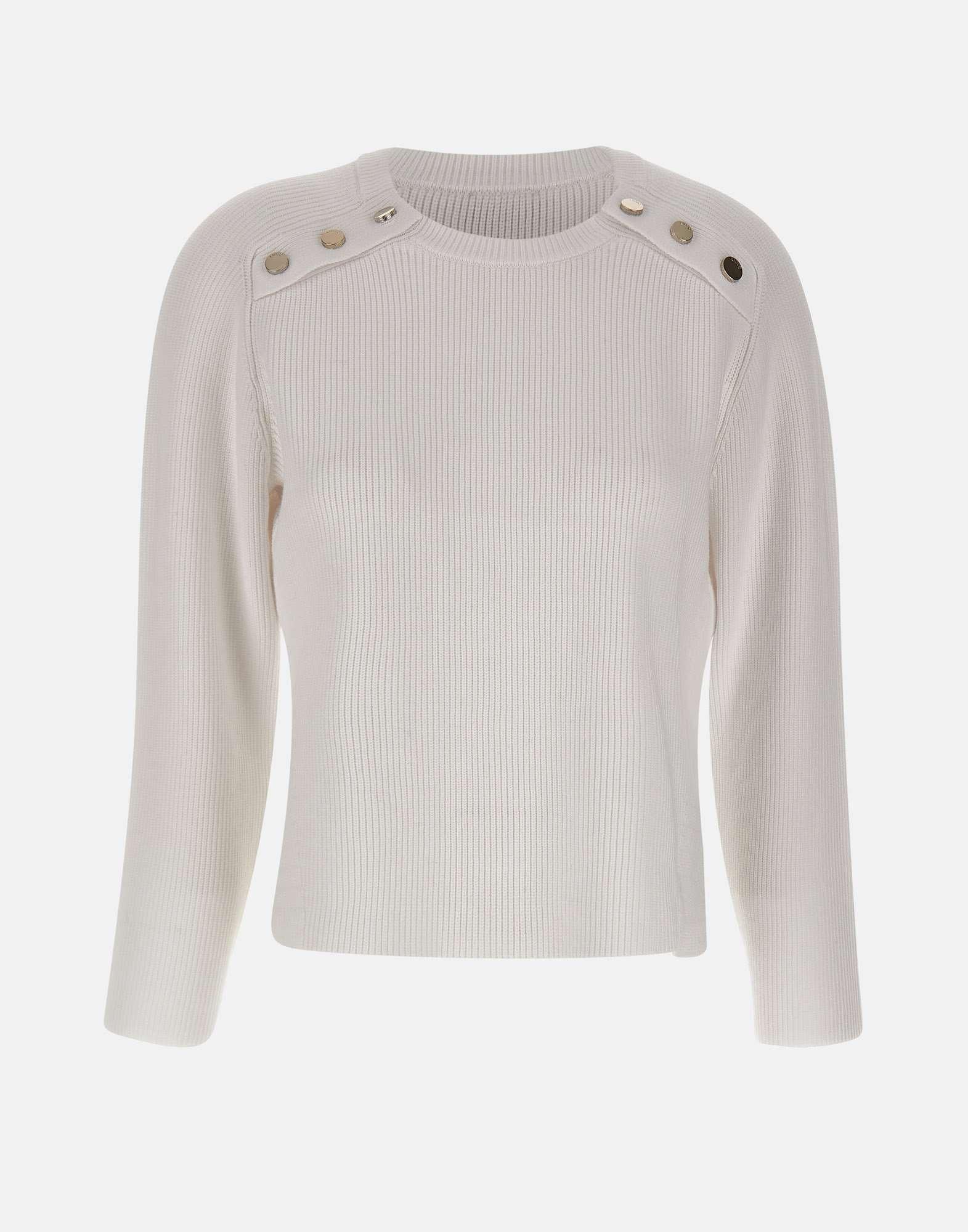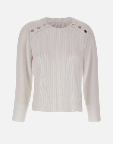 Maglia donna Liu Jo color bianco, con lavorazione a costine, pensata per un look essenziale e contemporaneo. Il modello presenta maniche lunghe, girocollo e bottoni a pressione ai lati dello scollo che aggiungono un dettaglio moderno. Gli spacchi laterali rendono la linea piu fluida, mentre la vestibilità leggermente over garantisce comfort e facilità di abbinamento.