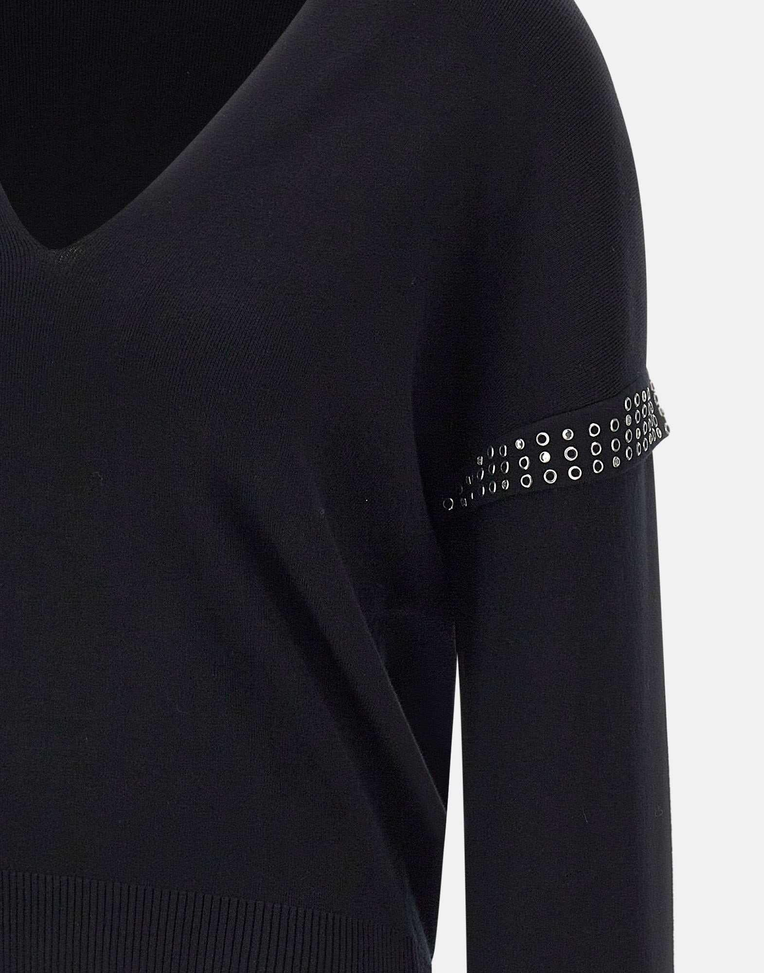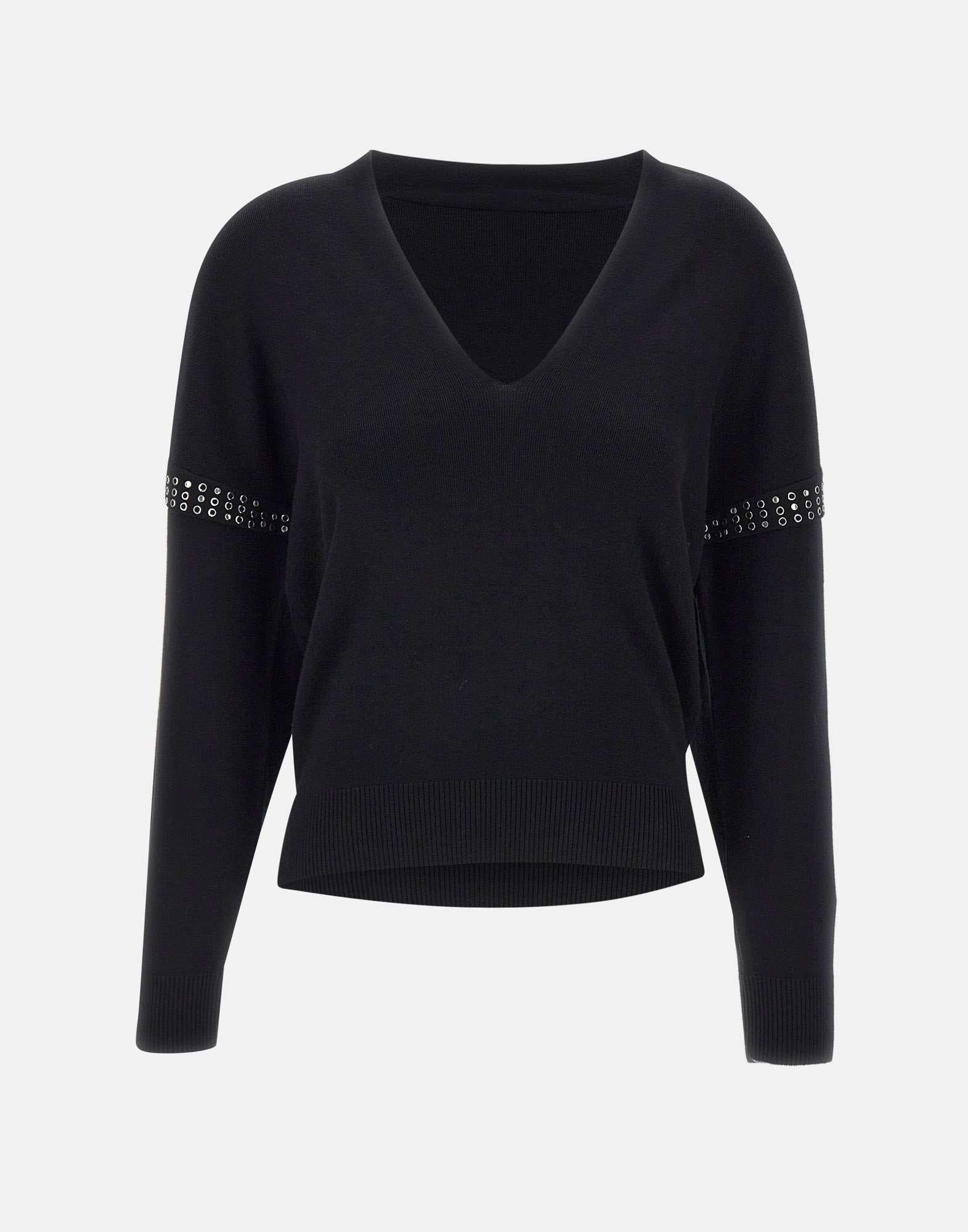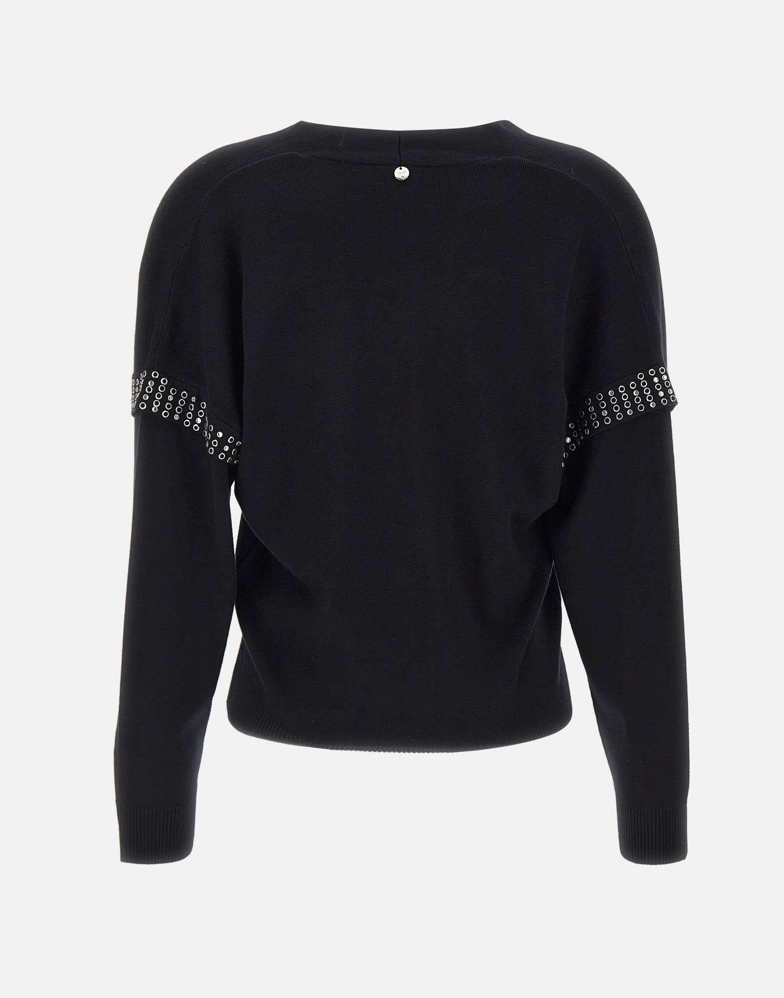 Maglia donna Liu Jo nera in misto viscosa, dal fascino elegante e luminoso. Caratterizzata da scollo a V e applicazioni gioiello sulle maniche, con fondo e polsini a costine che definiscono la silhouette. Un capo femminile e versatile appartenente alla linea sostenibile "Liu Jo Better", perfetto per aggiungere un tocco sofisticato ai look quotidiani. Vestibilità regular.