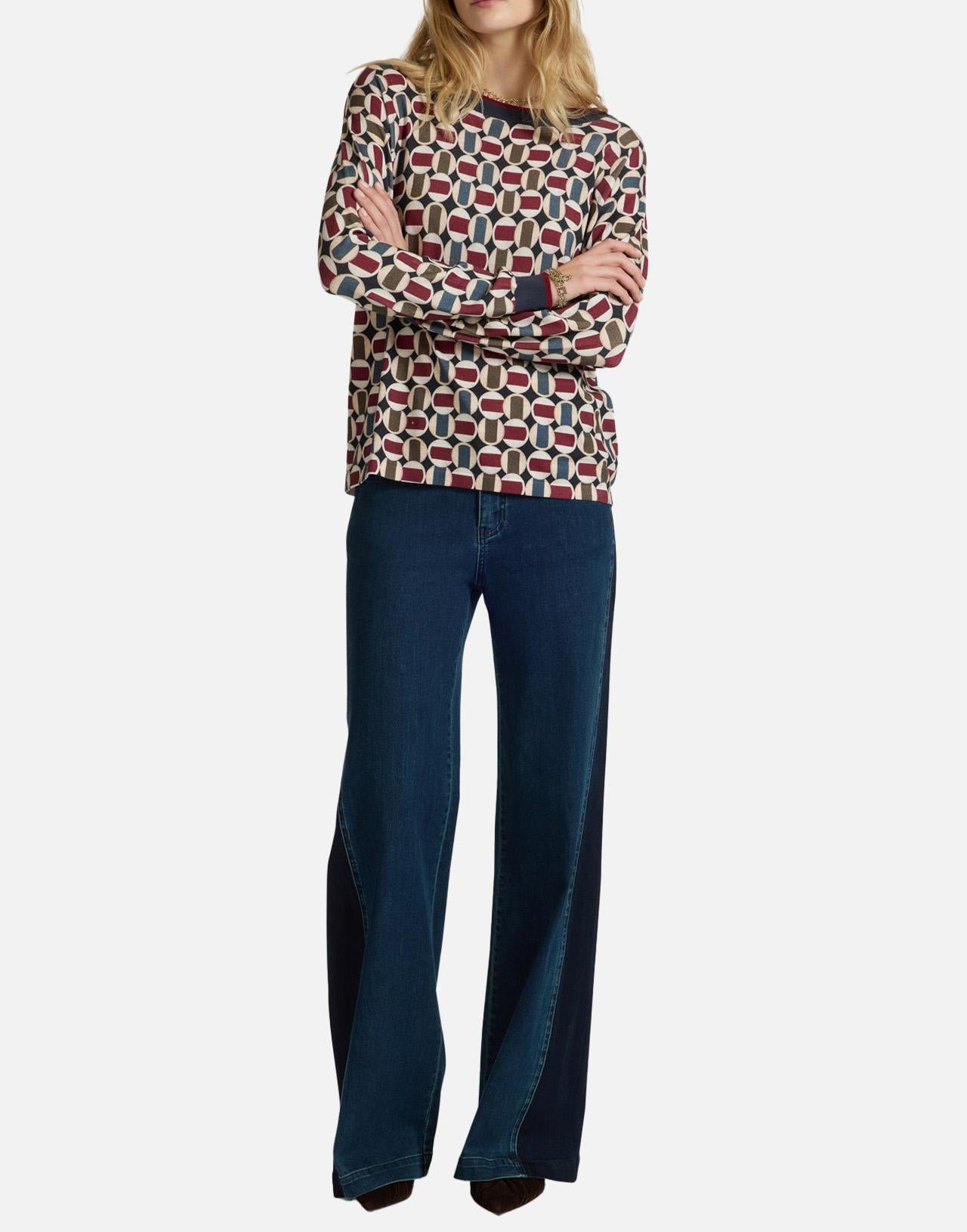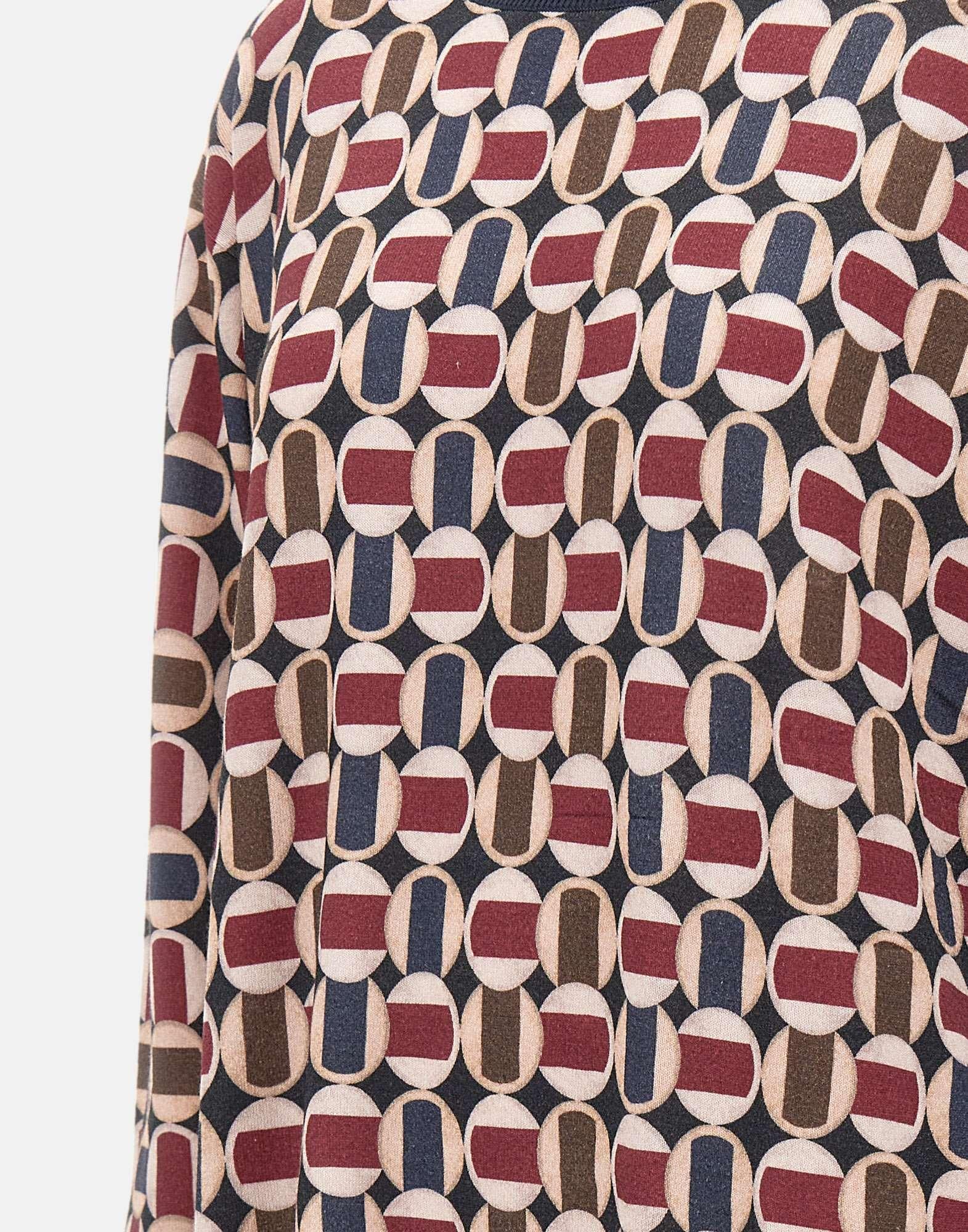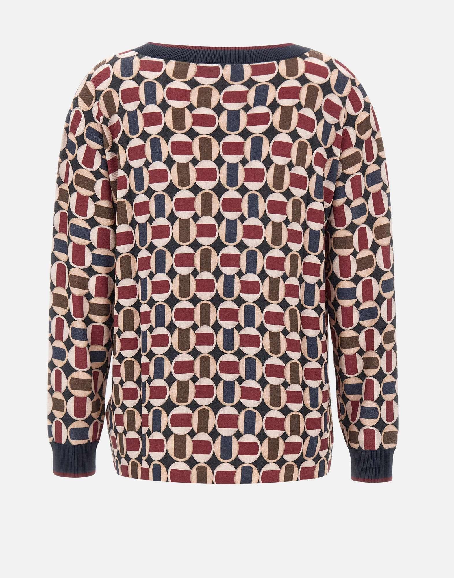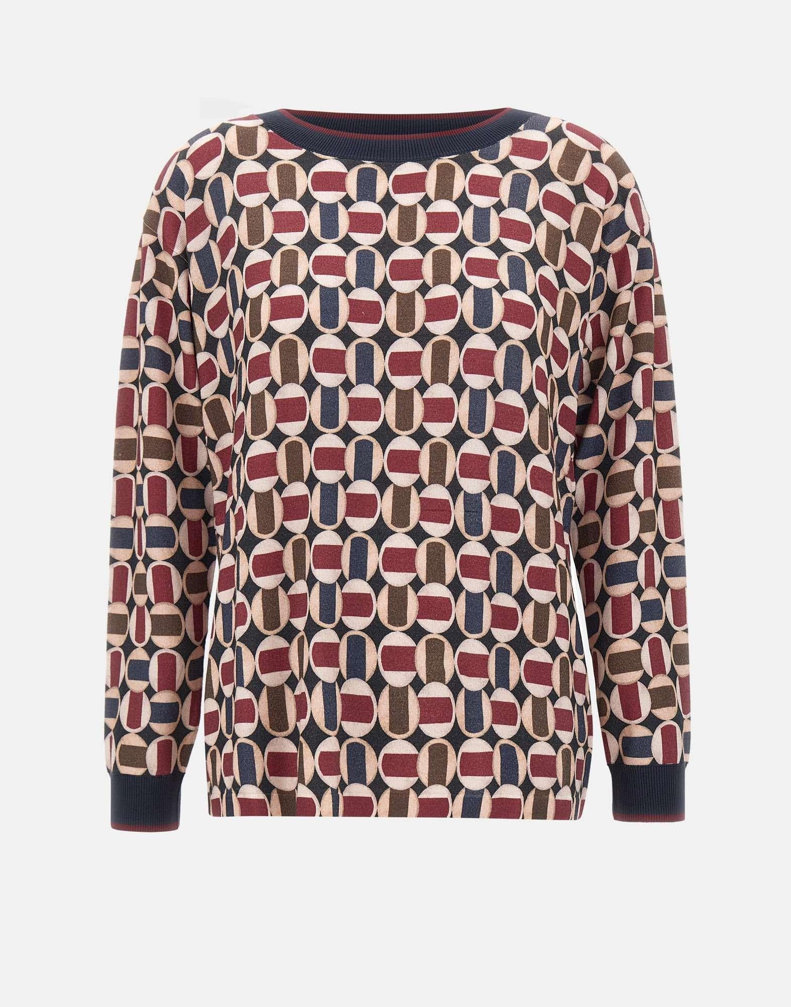Maglia Elena Mirò in misto viscosa fantasia optical multicolor, elegante e versatile. Presenta collo a barca, maniche lunghe, taglio dritto al fondo. I bordi a costine definiscono la silhouette. Vestibilità regular, ideale per look raffinati da giorno o da ufficio.