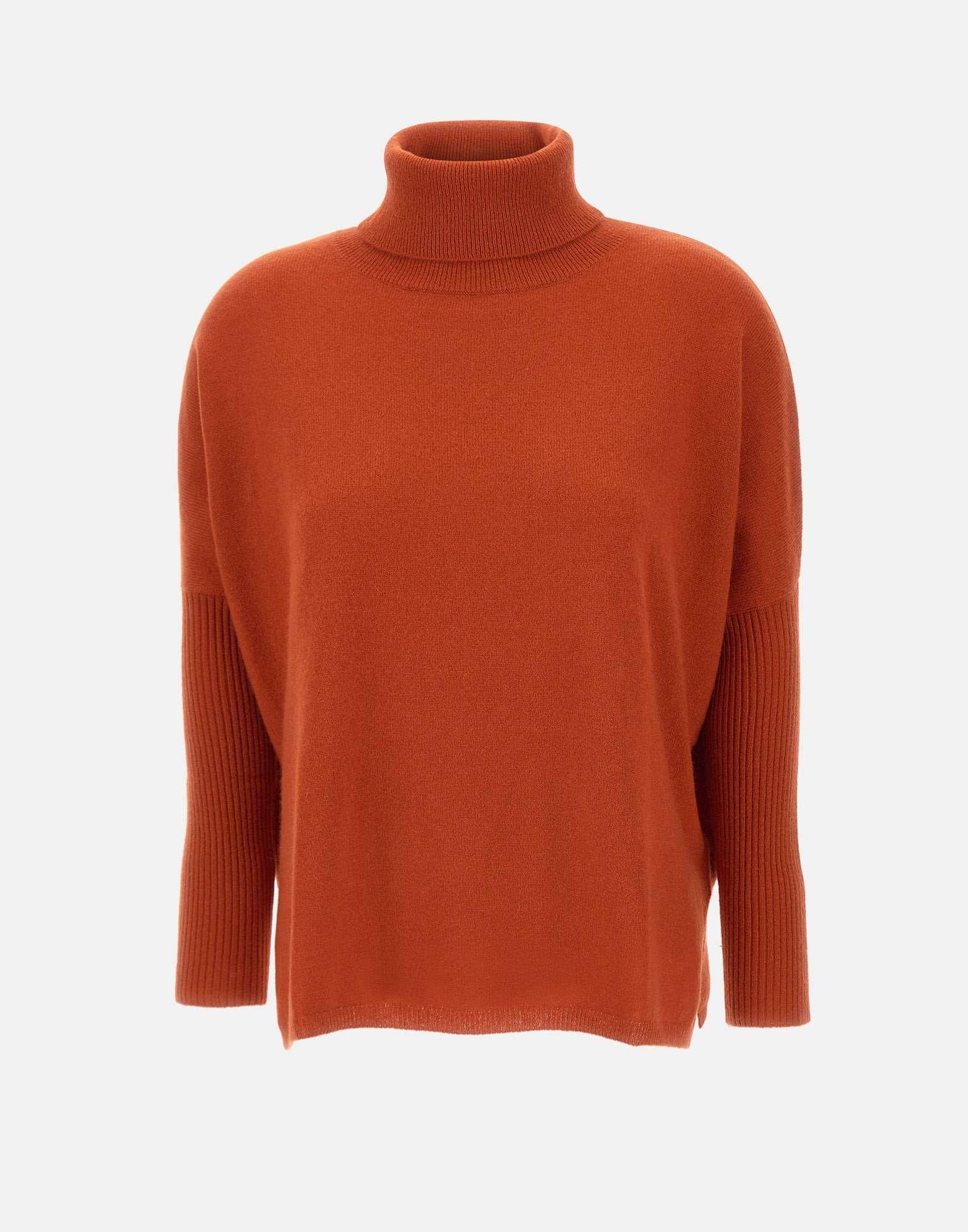 Maglia donna Sweet Cashmere "Margareth" in puro cashmere 100%, arancione. Il design a taglio poncho è valorizzato da collo alto e maniche con lavorazione a costine, finiture a costine e delicati spacchi laterali che conferiscono leggerezza e movimento. Un capo avvolgente e raffinato, perfetto per affrontare la stagione con comfort e stile.