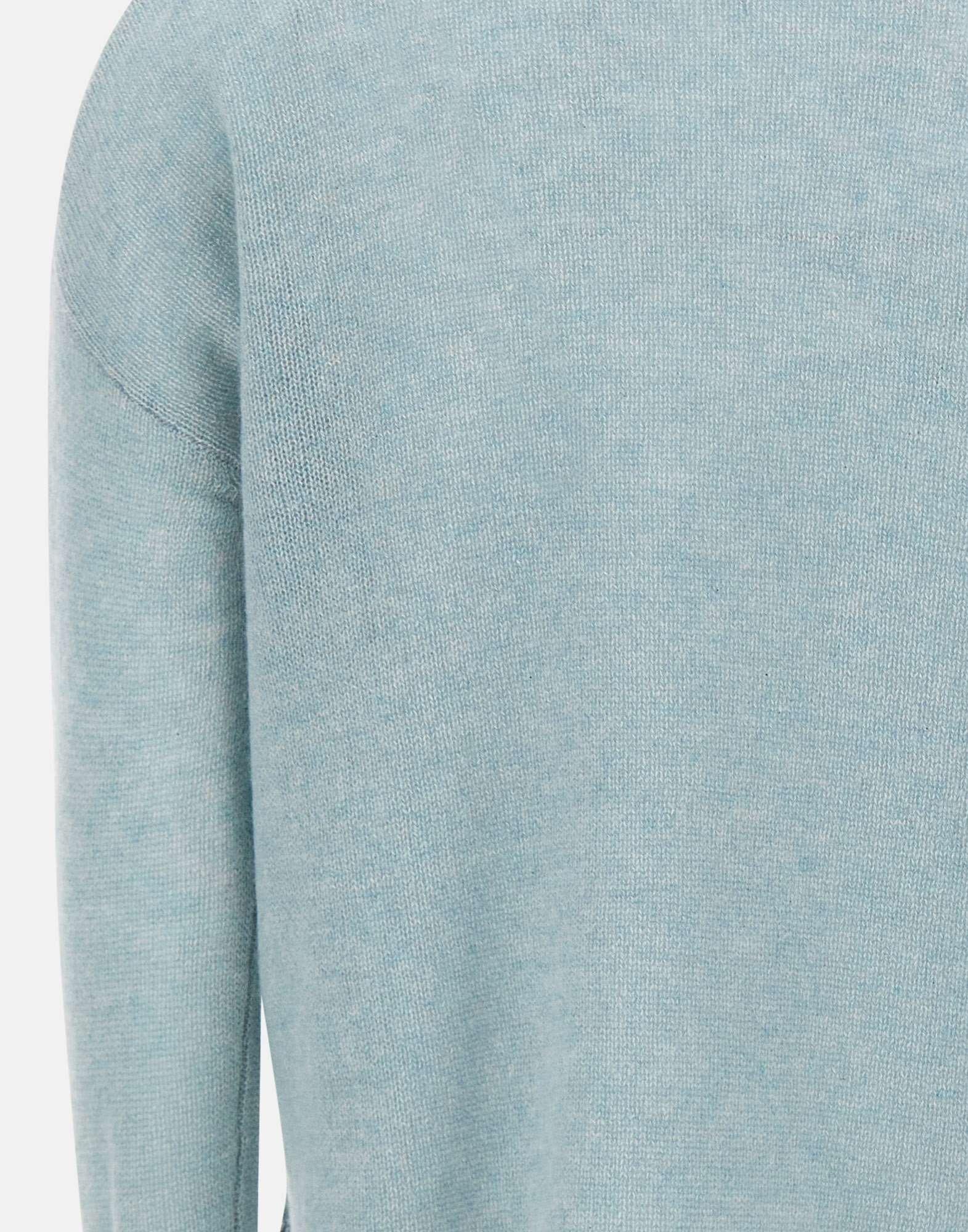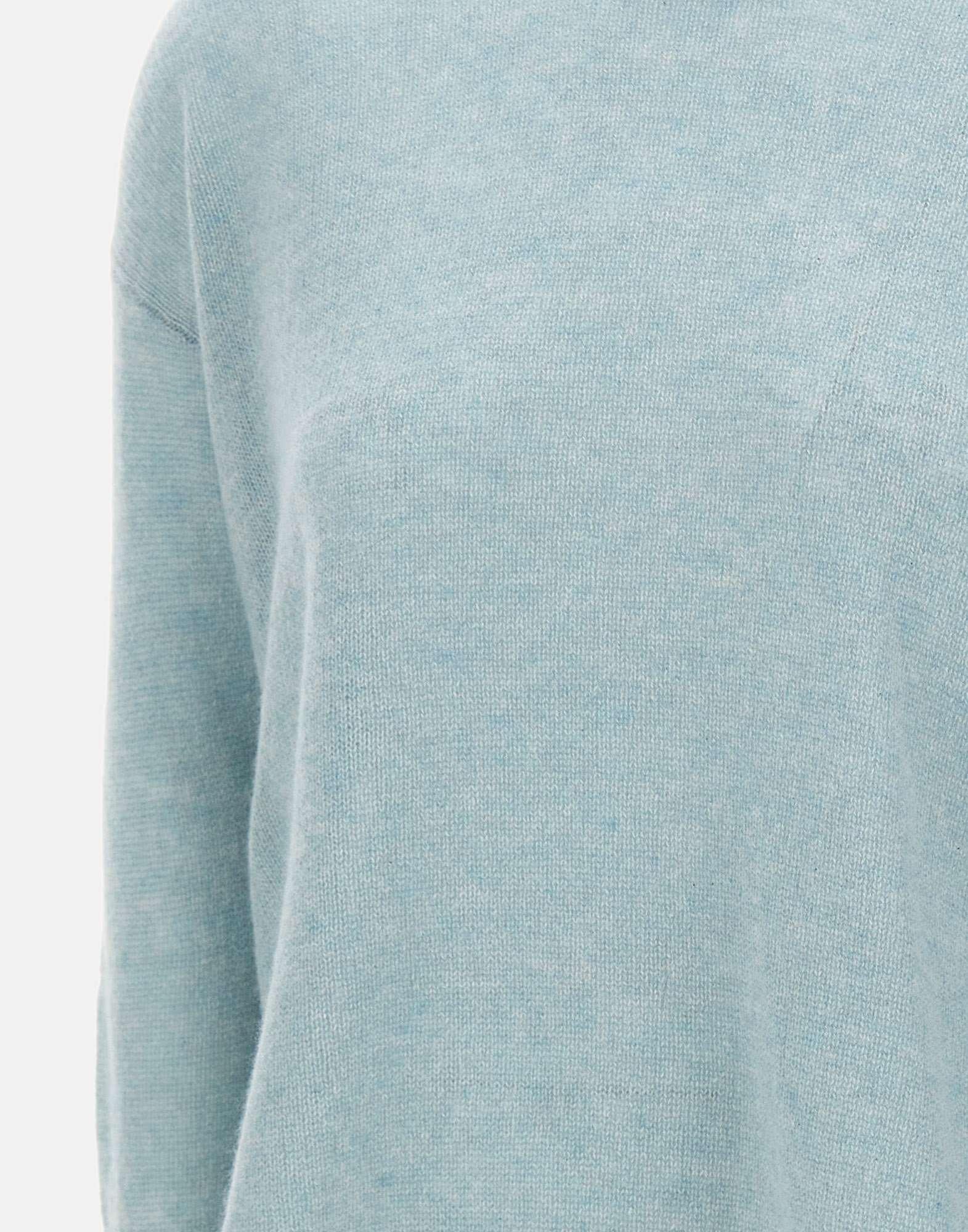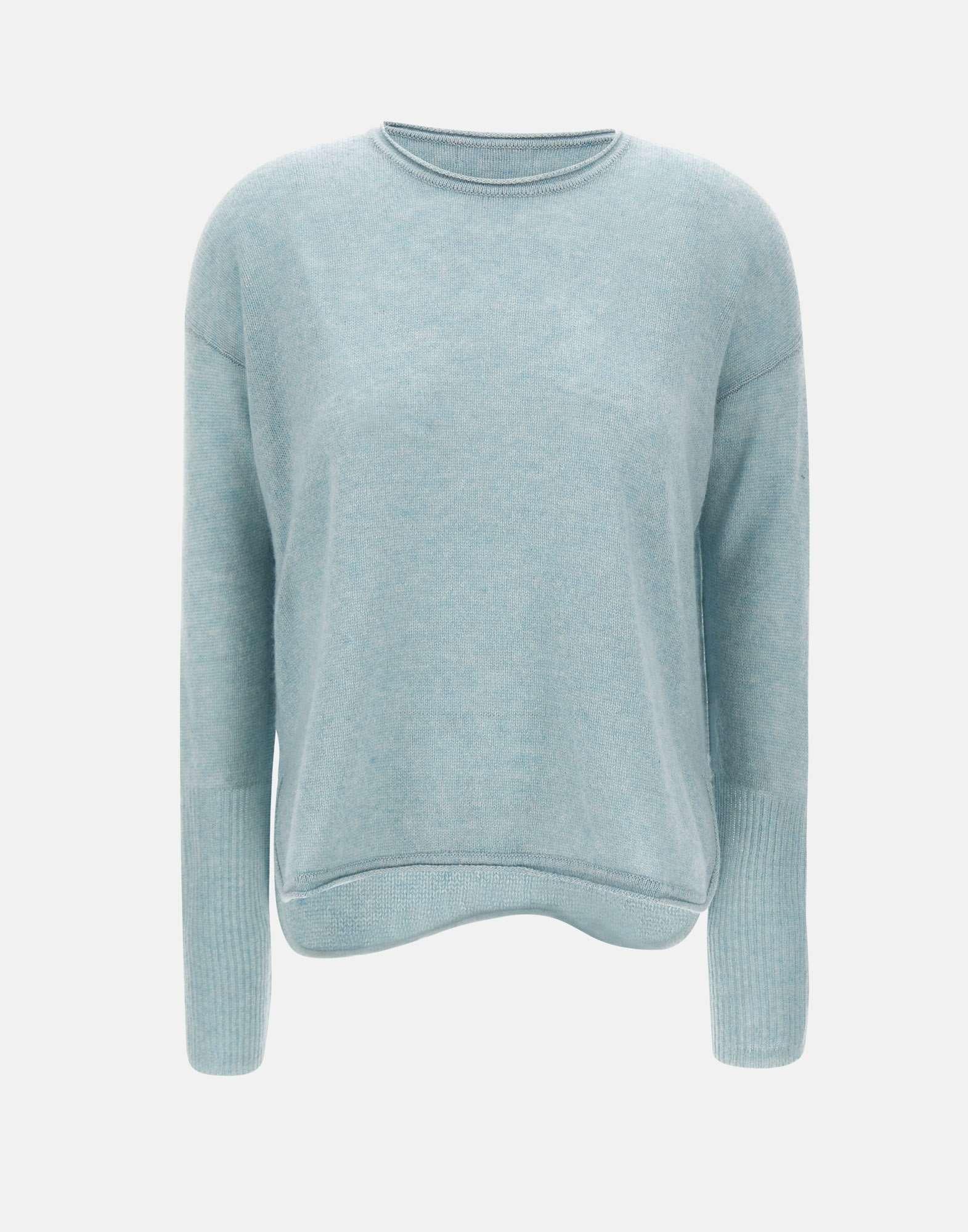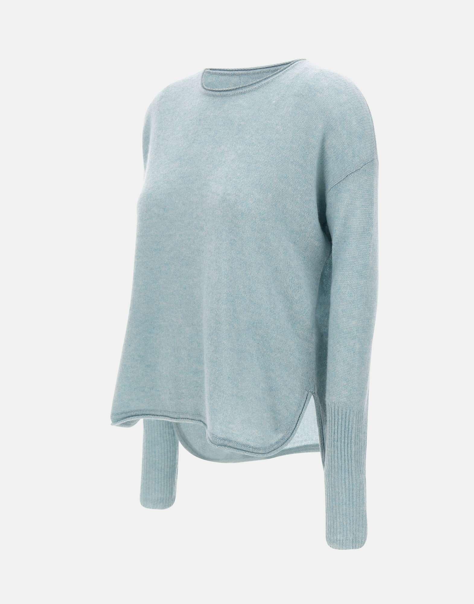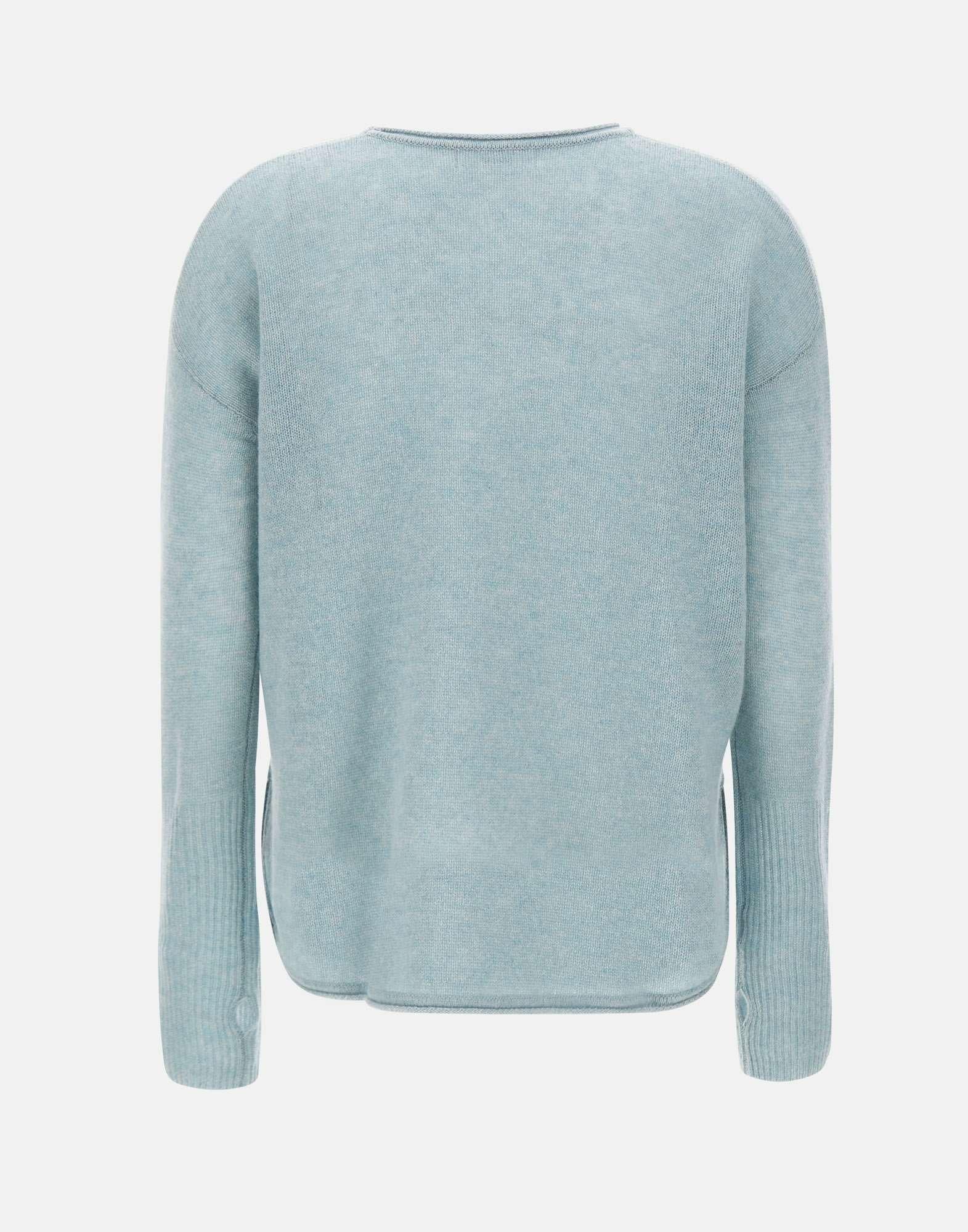 Maglia donna Not Shy Cashmere "Pippa" in 100% puro cashmere leggeri, color celeste chiaro. Il design morbido e avvolgente presenta girocollo, maniche lunghe con dettaglio muffole integrate, polsini a costine e finiture arrotolate. Gli spacchi laterali e la vestibilità ampia donano comfort e movimento, per un capo dallo stile rilassato ma sofisticato.