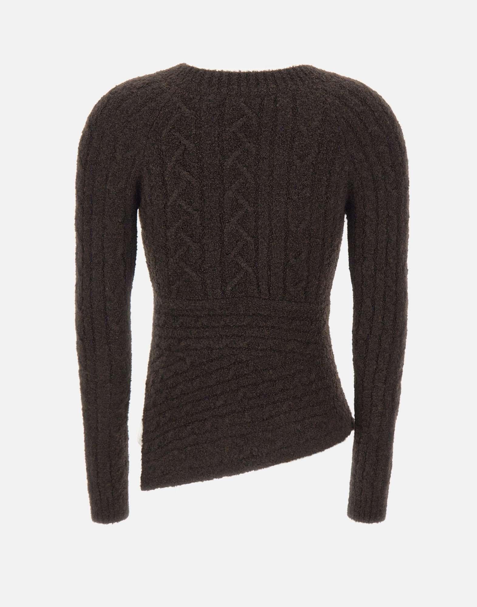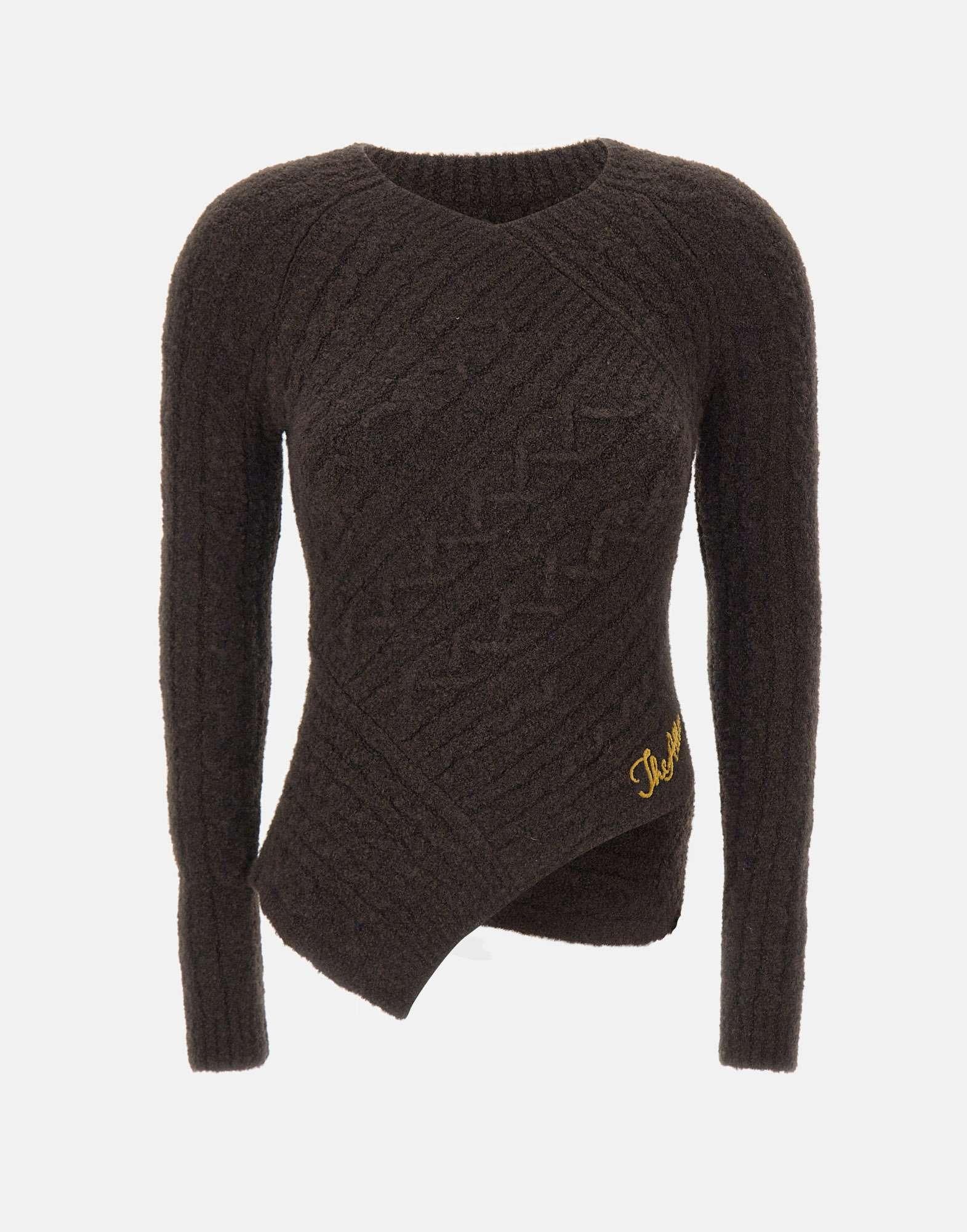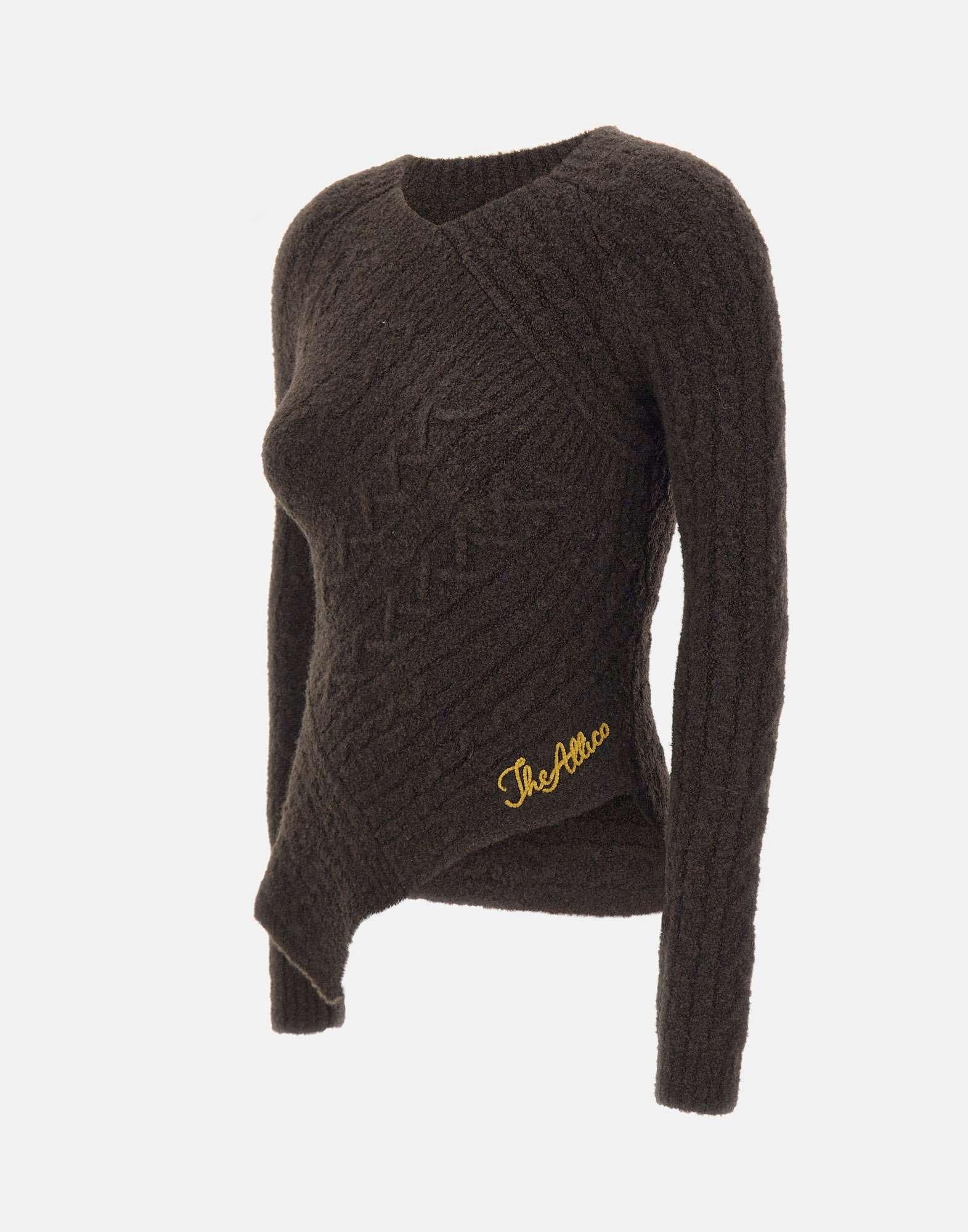 Maglione donna The Attico in maglia di misto lana marrone con lavorazione a trecce, perfetto equilibrio tra eleganza classica e stile contemporaneo. Caratterizzato da un leggero scollo a V e fondo asimmetrico che dona movimento alla silhouette, è completato da un logo ricamato a contrasto in giallo sul bordo inferiore. Vestibilità slim per un look femminile e definito.