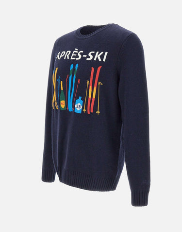Mc2 Saint Barth "Après Ski 61" maglia in morbido filato misto lana colore blu, ispirata allo stile alpino più autentico. Presenta maniche lunghe, girocollo classico e bordi a costine per un comfort ottimale. Sul davanti spicca il maxi logo multicolor a contrasto, emblema dello spirito ironico e riconoscibile del brand. Regular fit.