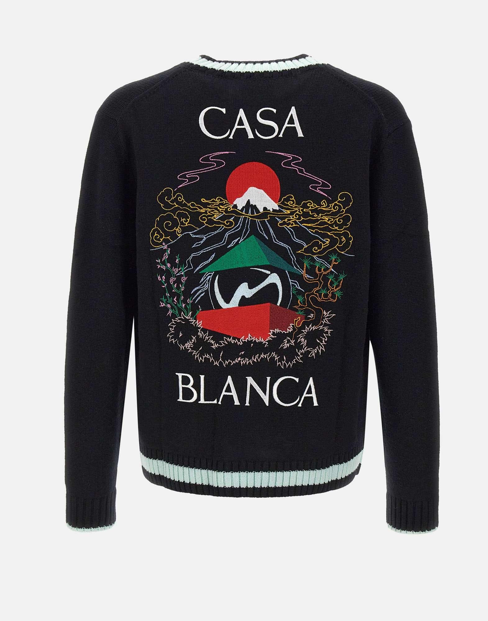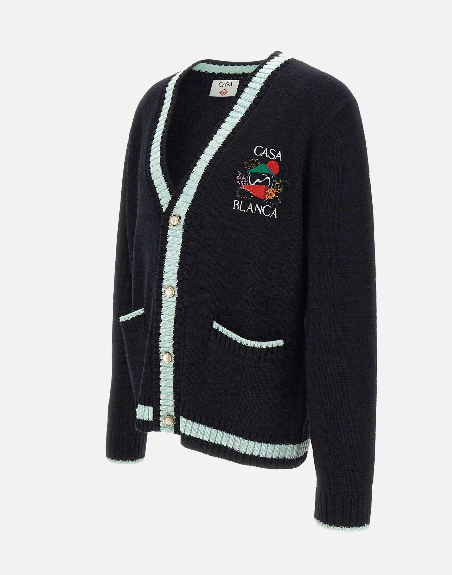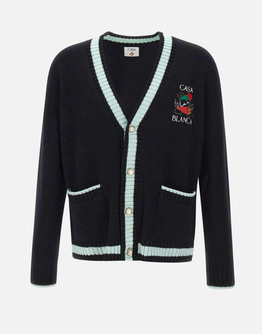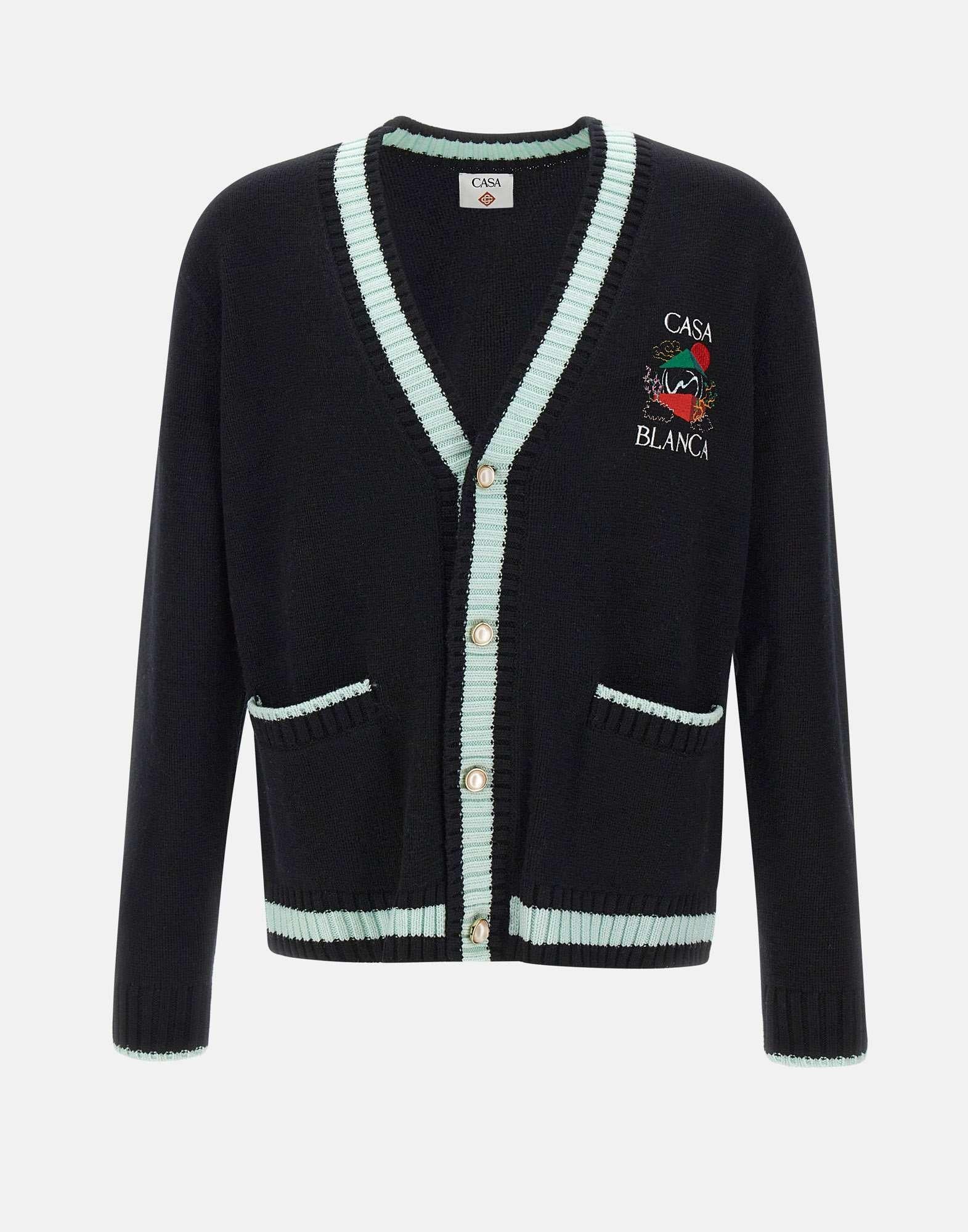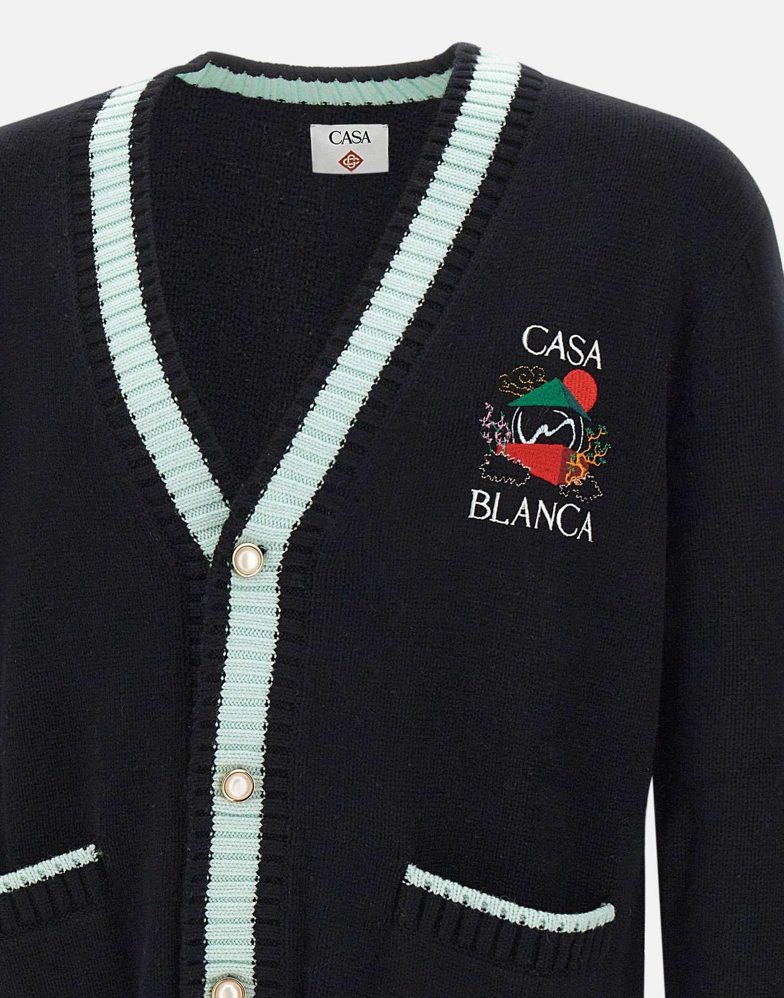 Cardigan uomo Casablanca "Casa mountain temple" in lana merino e cashmere nero, impreziosito da dettagli a contrasto color acquamarina su orlo, polsini e scollo a costine. La chiusura frontale è valorizzata da quattro bottoni con perla, mentre le due tasche anteriori presentano profili in contrasto. Il modello è arricchito da un ricamo stagionale discreto sul petto e da un motivo più ampio sulla schiena. Un capo di pregio che unisce stile contemporaneo e raffinatezza.