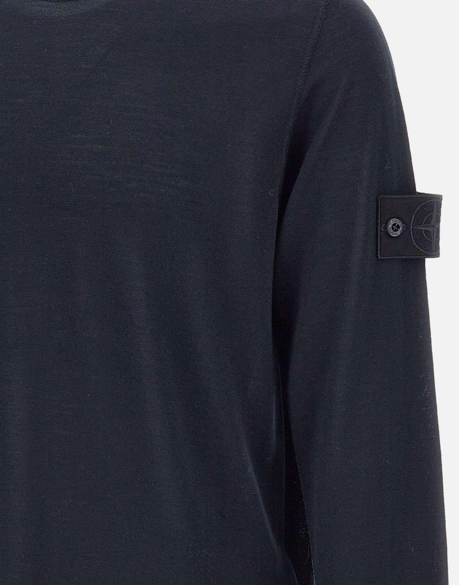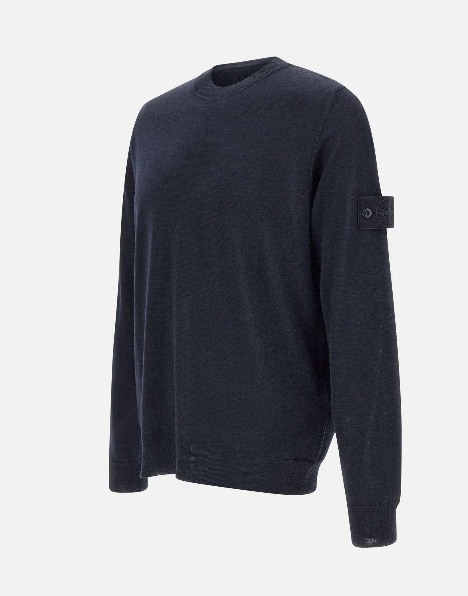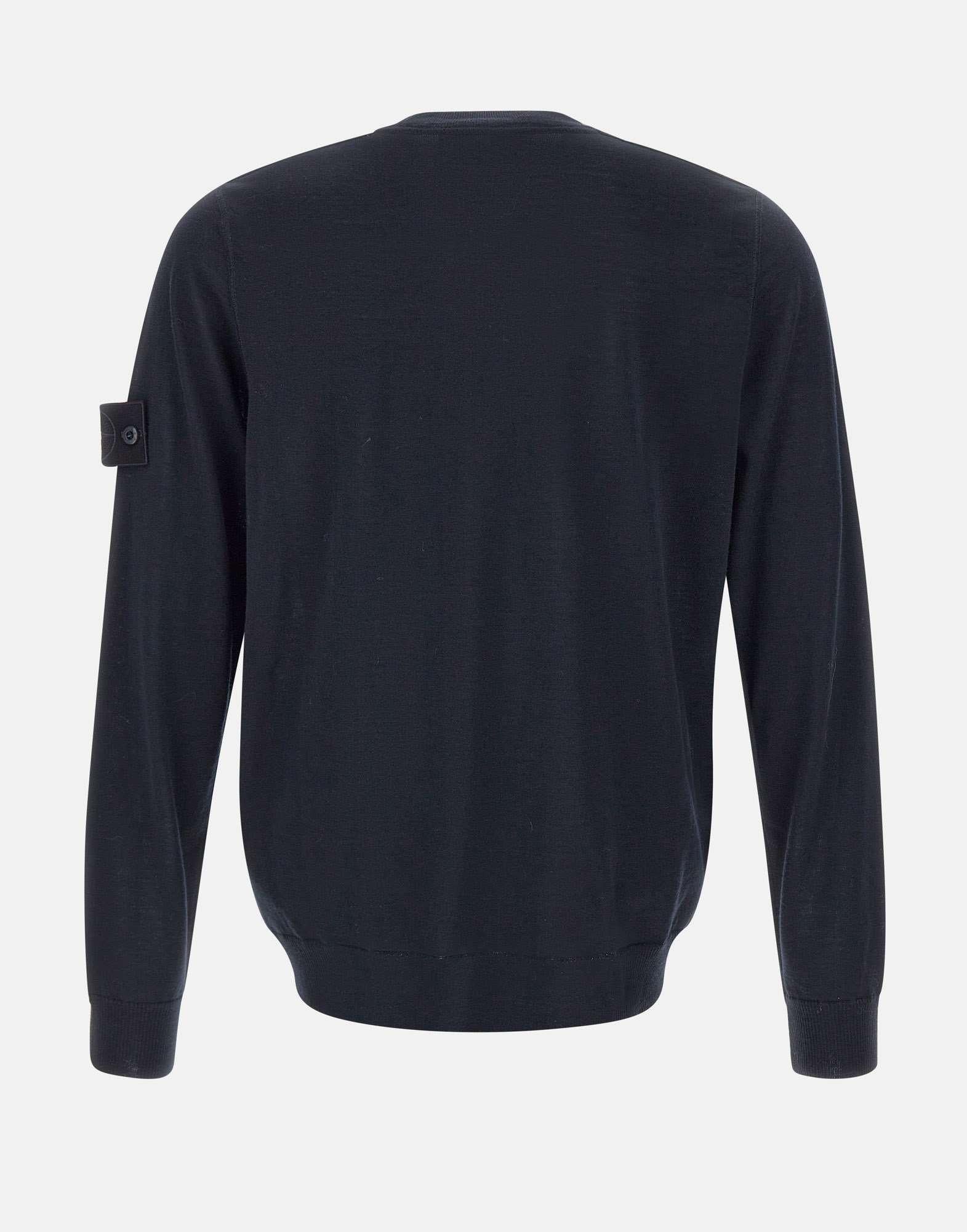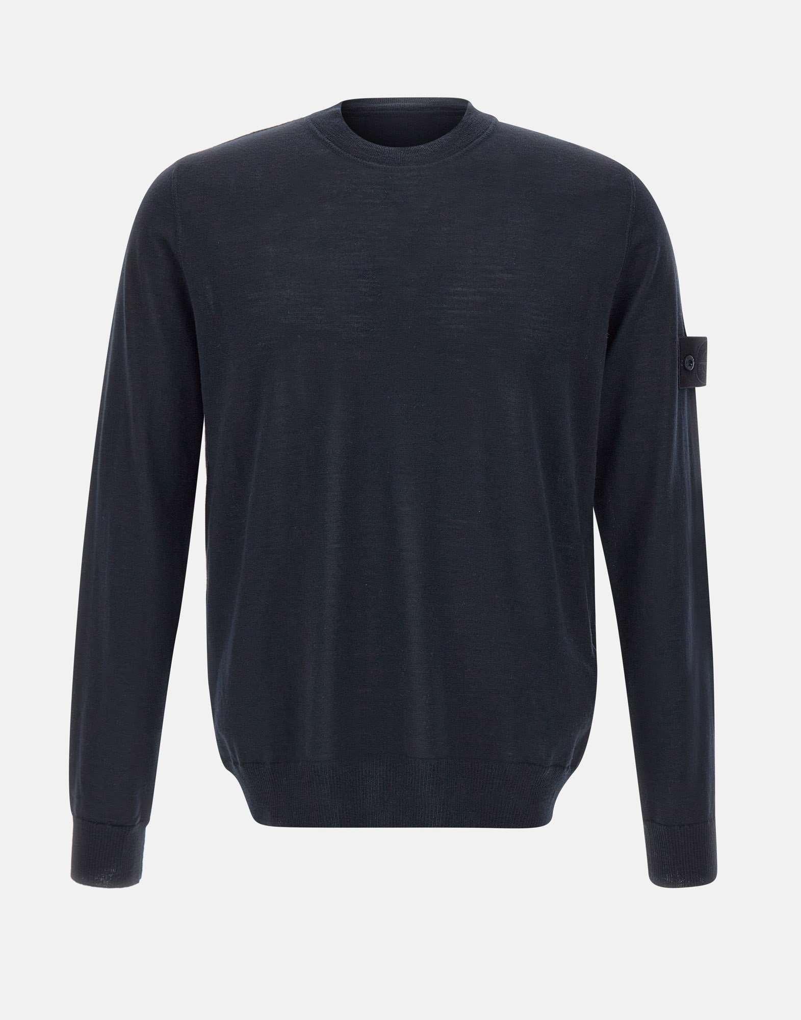 Maglia uomo Stone Island, colore blu, realizzata in pura lana leggera con finezza 14. Maniche lunghe e girocollo, design monocromatico che si fonde perfettamente con il tessuto, creando un look minimalista e raffinato. Il badge Stone Island Ghost sulla manica sinistra aggiunge un tocco distintivo, mentre i bordi a costine assicurano una vestibilità perfetta e un comfort ottimale. Regular fit