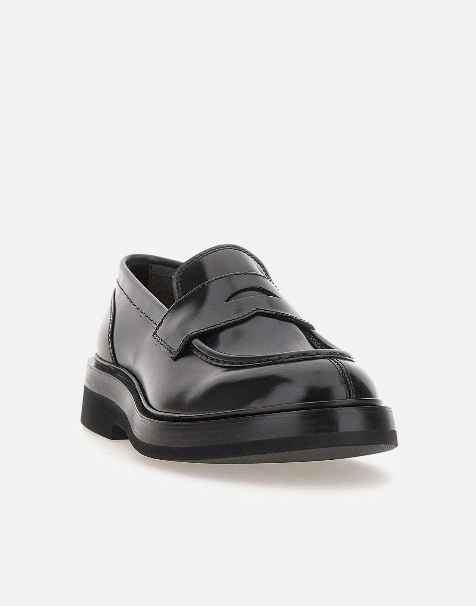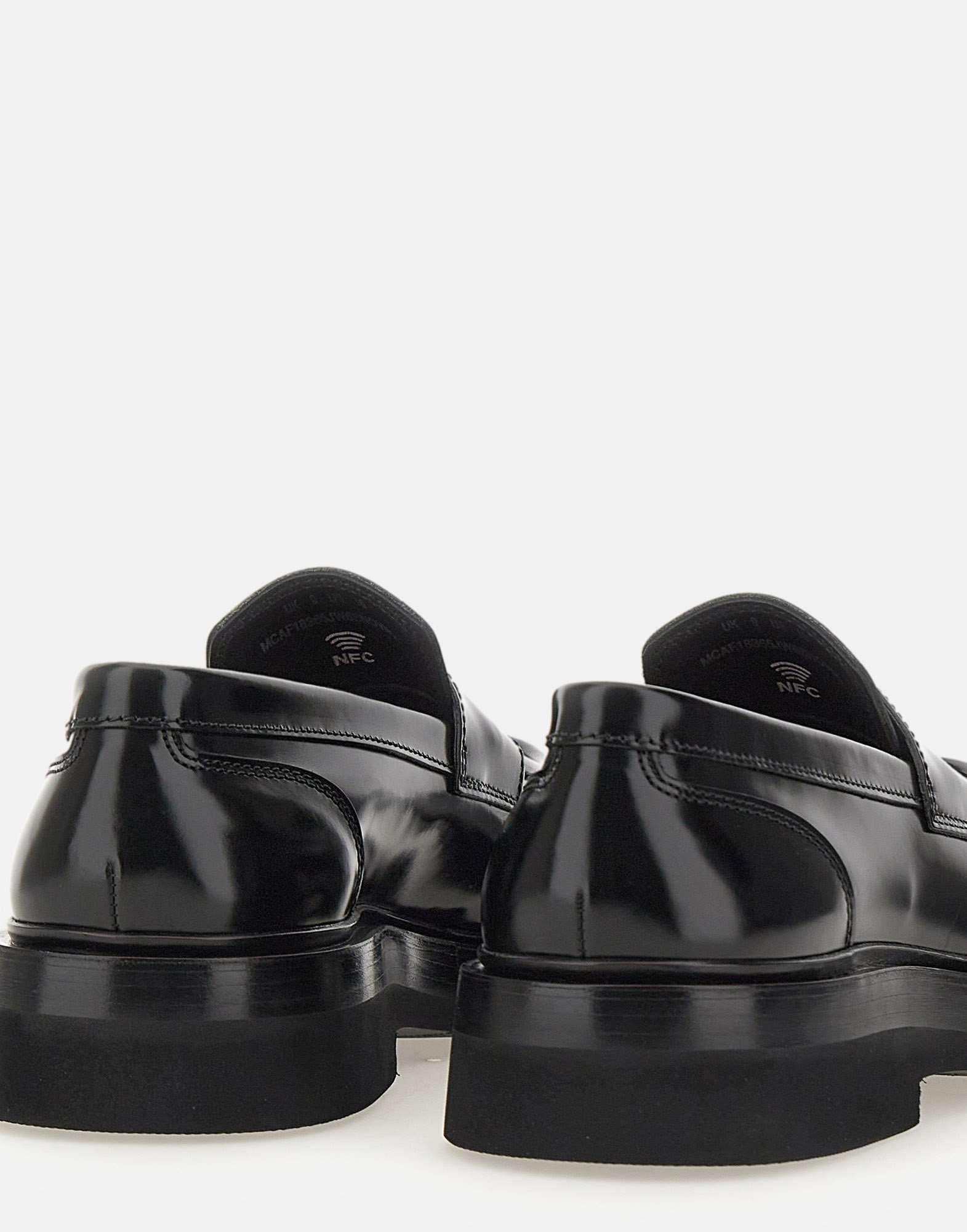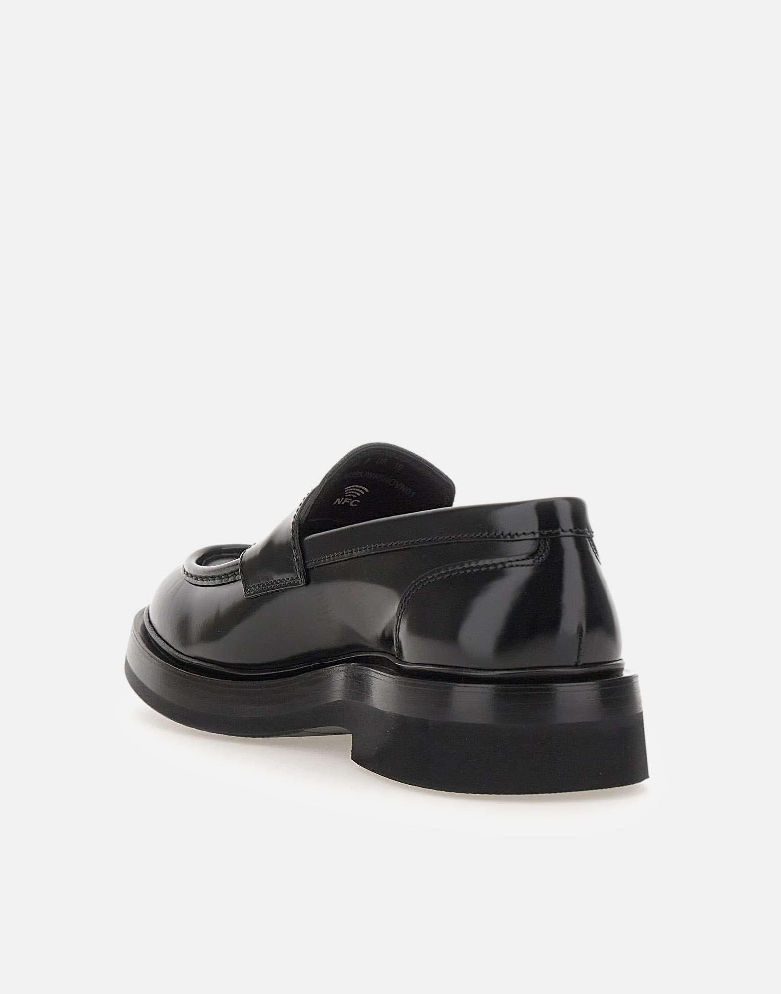 Mocassini "Gunder-A" Santoni, rappresentano l'eccellenza dell'artigianalità italiana in una calzatura dallo stile intramontabile. Realizzati in pelle nera con finish lucido, si distinguono per la classica mascherina con taglio a diamante, la punta smussata e le impunture artigianali a vista, segno distintivo della qualità Santoni. La soletta interna in pelle logata e la calzata regolare assicurano massimo comfort, mentre la suola in gomma con tacco 4cm offre stabilità e aderenza. Inclusa una custodia firmata, ideale per proteggere le scarpe anche in viaggio. Dotati dellinnovativo sistema NCF Icon, permettono di accedere a contenuti digitali esclusivi: basta seguire le istruzioni fornite nella scheda dedicata allinterno della confezione.