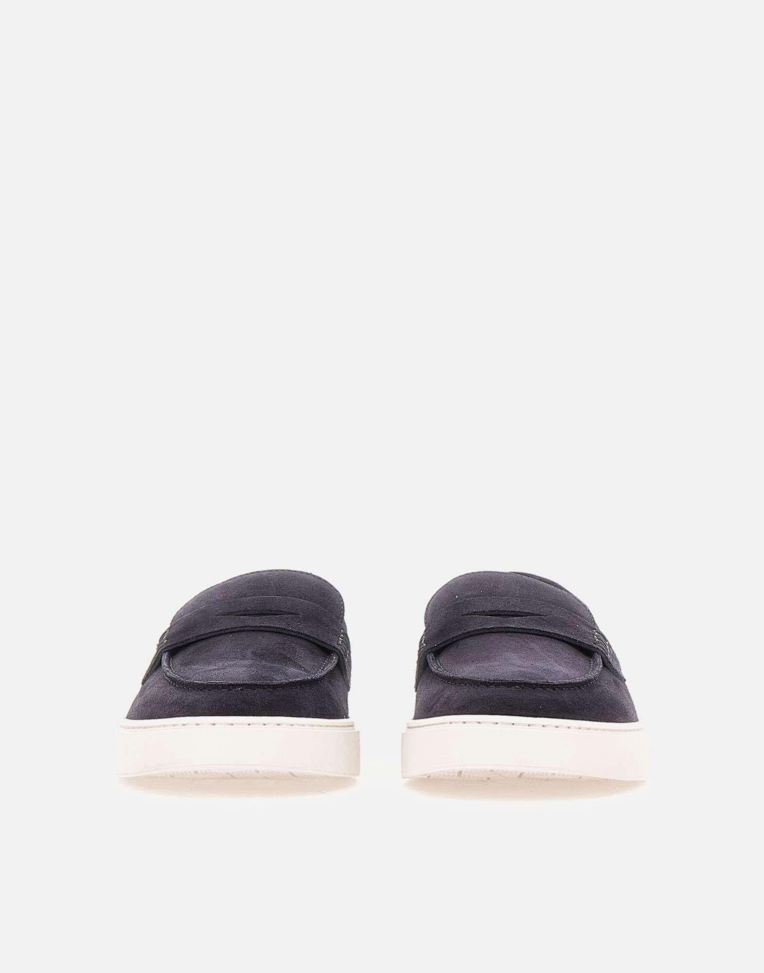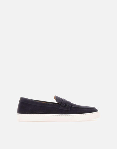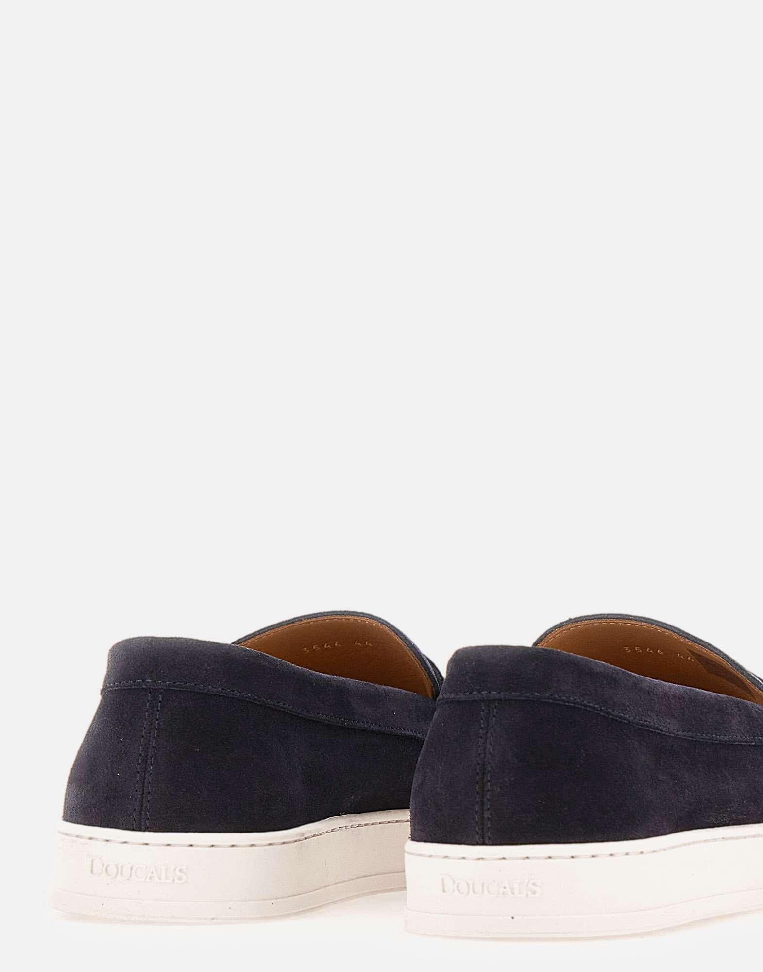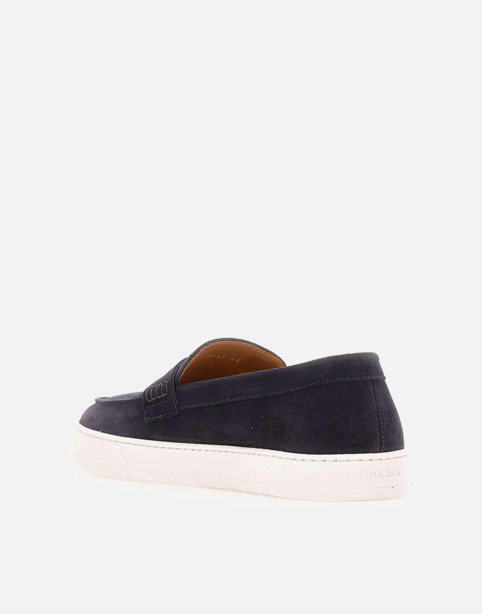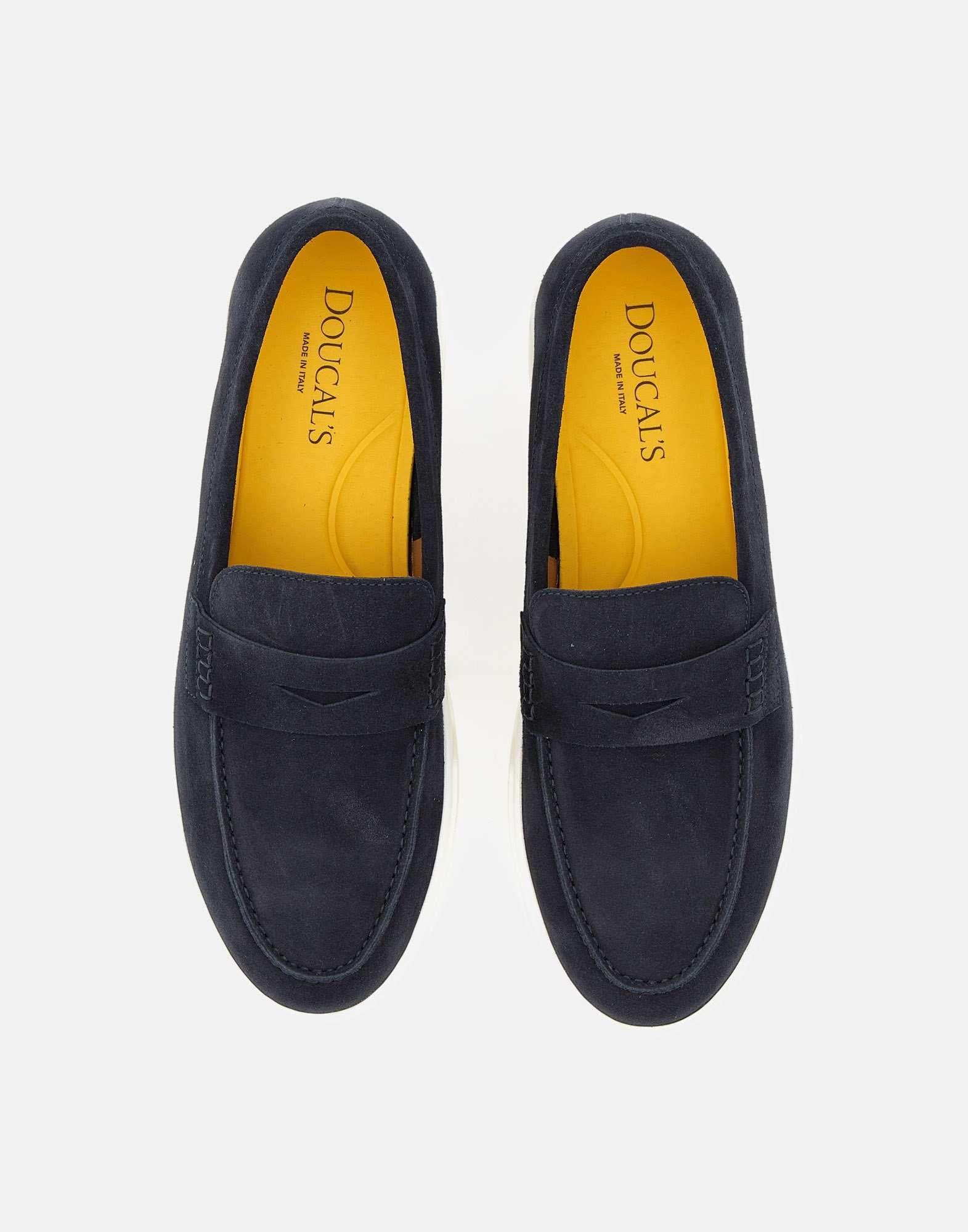 Mocassini uomo Doucal's realizzati in pelle scamosciata color blu scuro, modello Penny reinterpretato in chiave contemporanea. La suola a cassetta in gomma bianca alta 2,5 cm dona un profilo attuale e una maggiore praticità, mantenendo l'eleganza della forma. La costruzione a sacchetto e la cucitura a vaschetta valorizzano la lavorazione artigianale e assicurano una calzata confortevole. Logo impresso sul tallone in gomma. Include dust bag. Made in Italy.