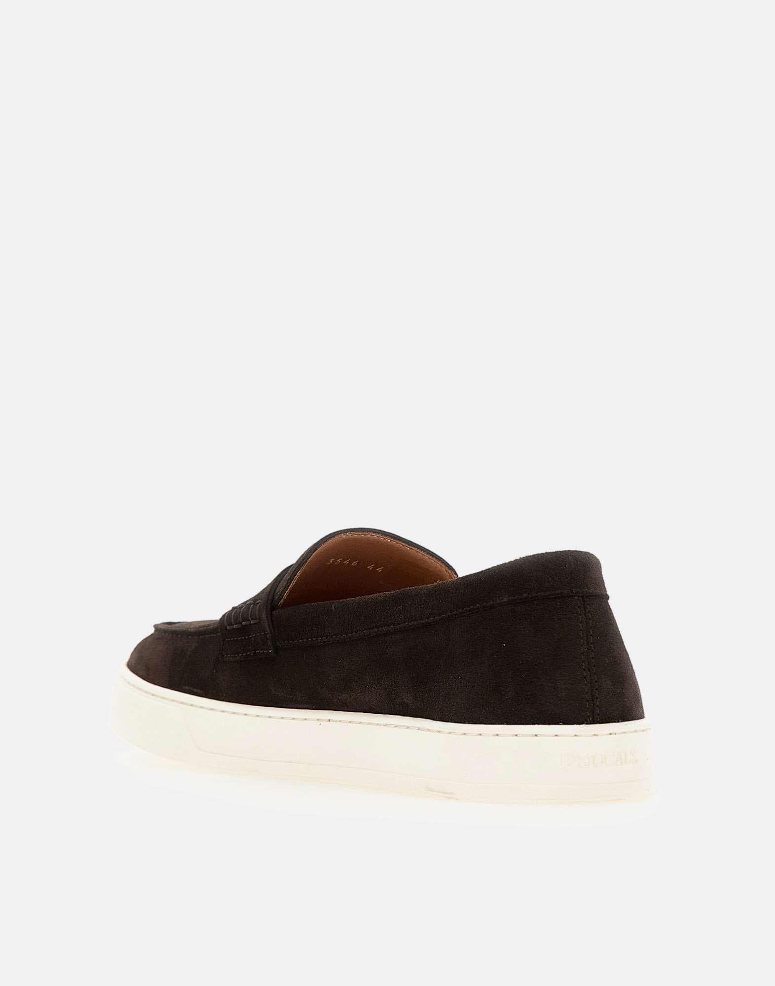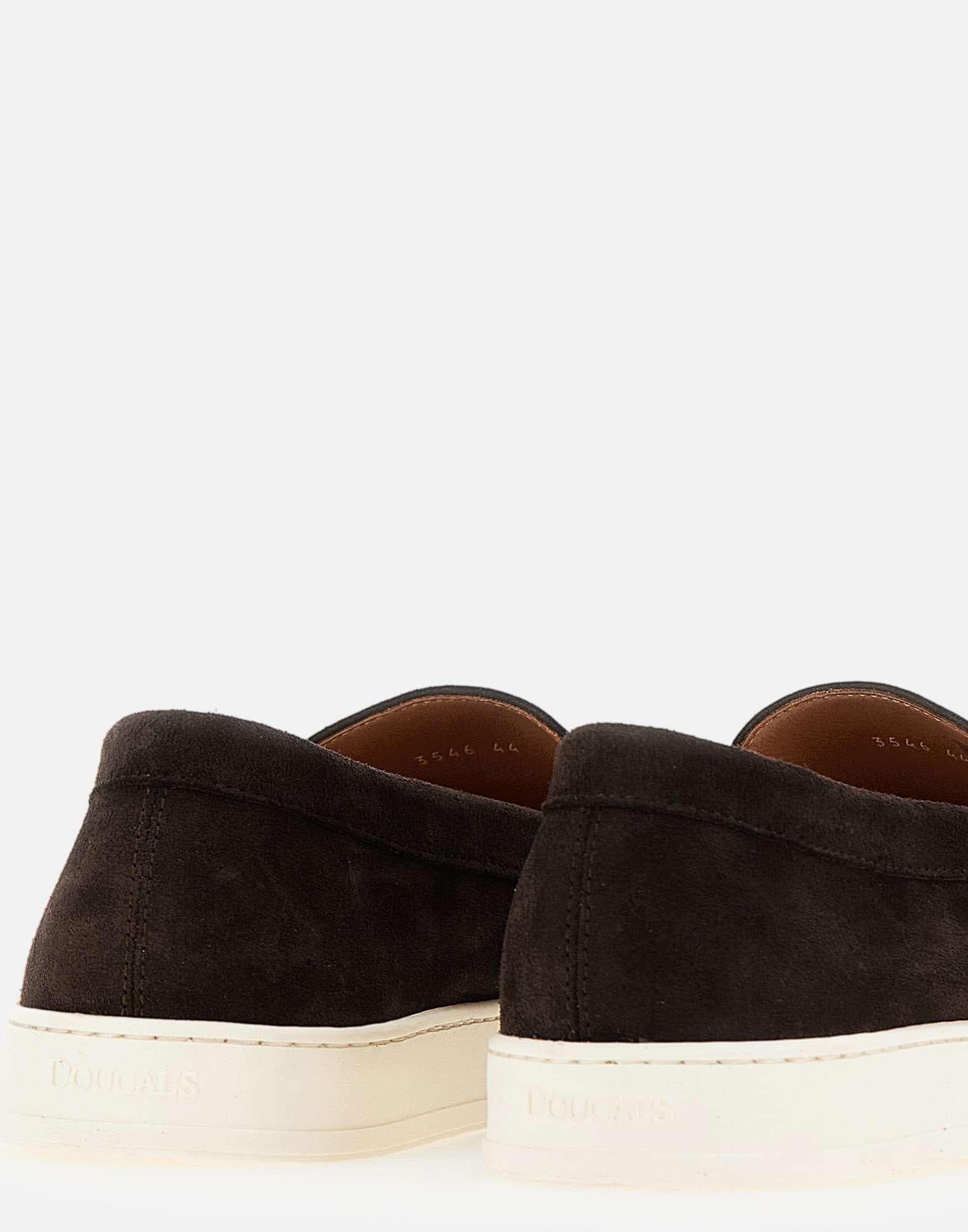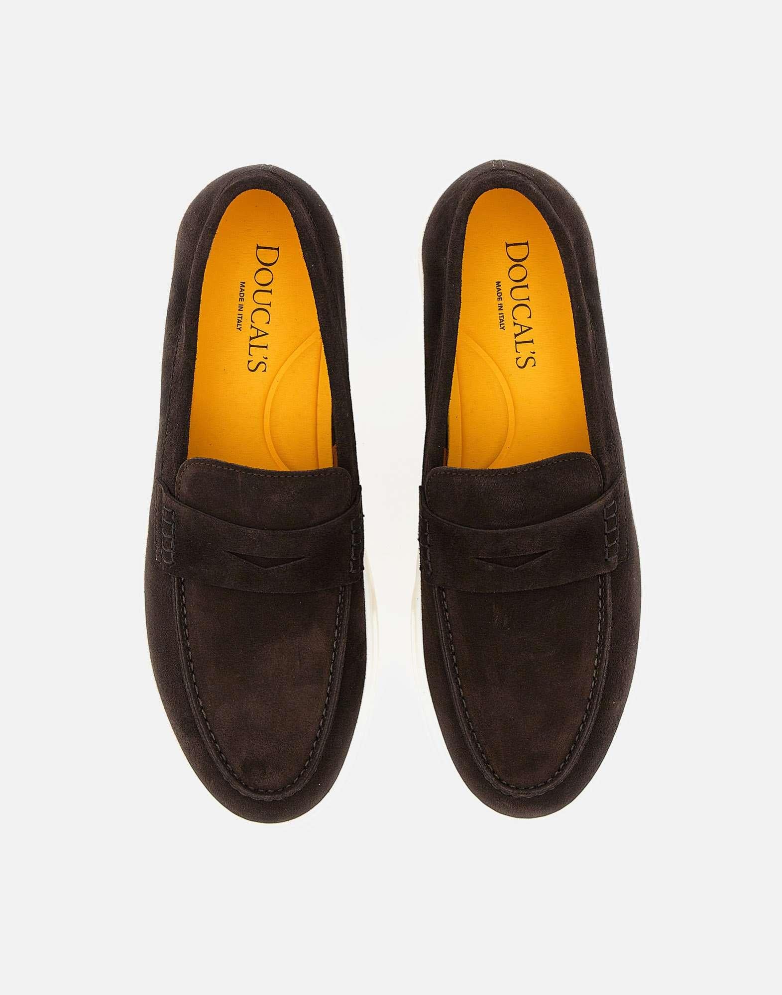 Mocassini uomo Doucal's realizzati in pelle scamosciata color testa di moro, modello Penny reinterpretato in chiave contemporanea. La suola a cassetta in gomma bianca alta 2,5 cm dona un profilo attuale e una maggiore praticità, mantenendo l'eleganza della forma. La costruzione a sacchetto e la cucitura a vaschetta valorizzano la lavorazione artigianale e assicurano una calzata confortevole. Logo impresso sul tallone in gomma. Include dust bag. Made in Italy.