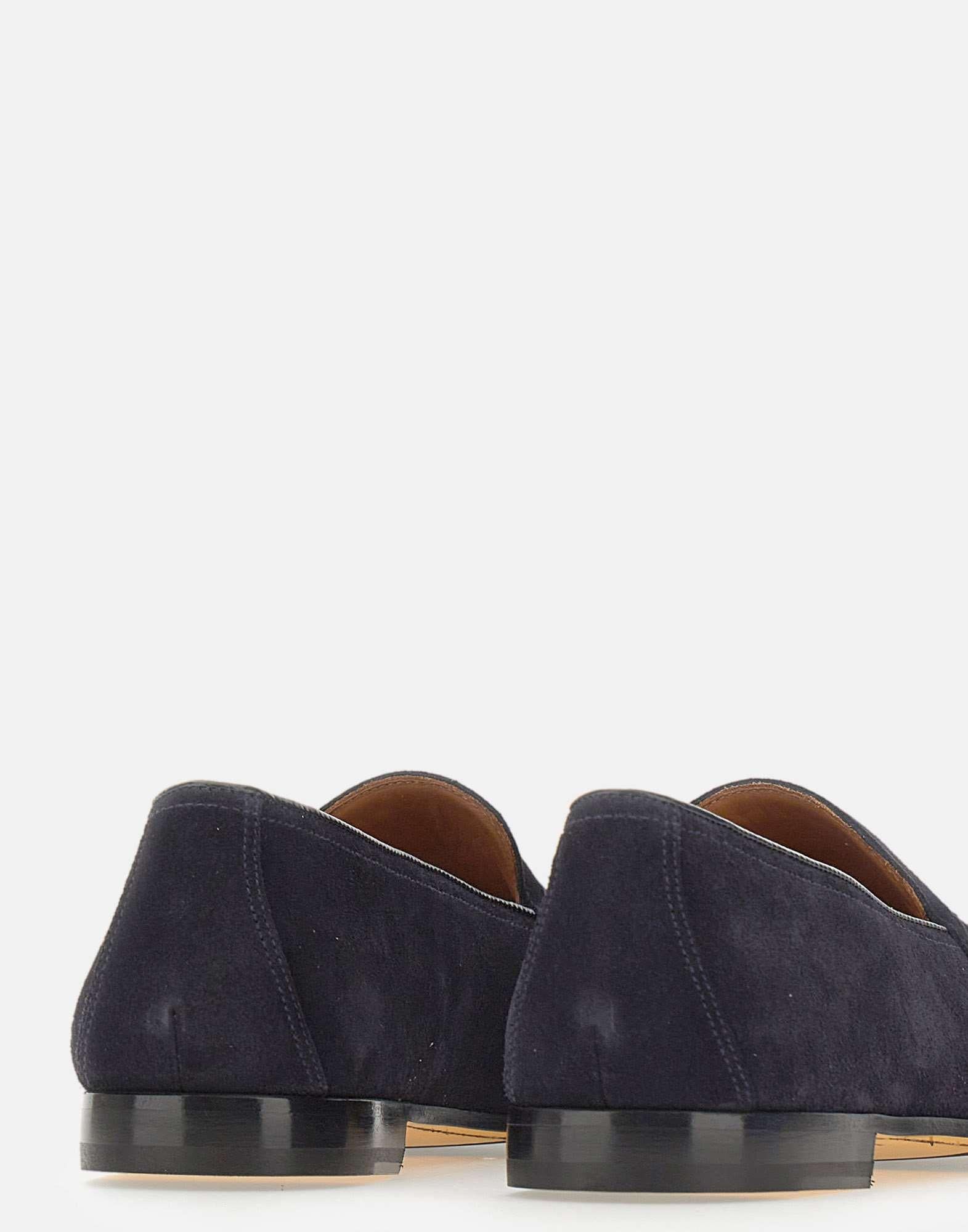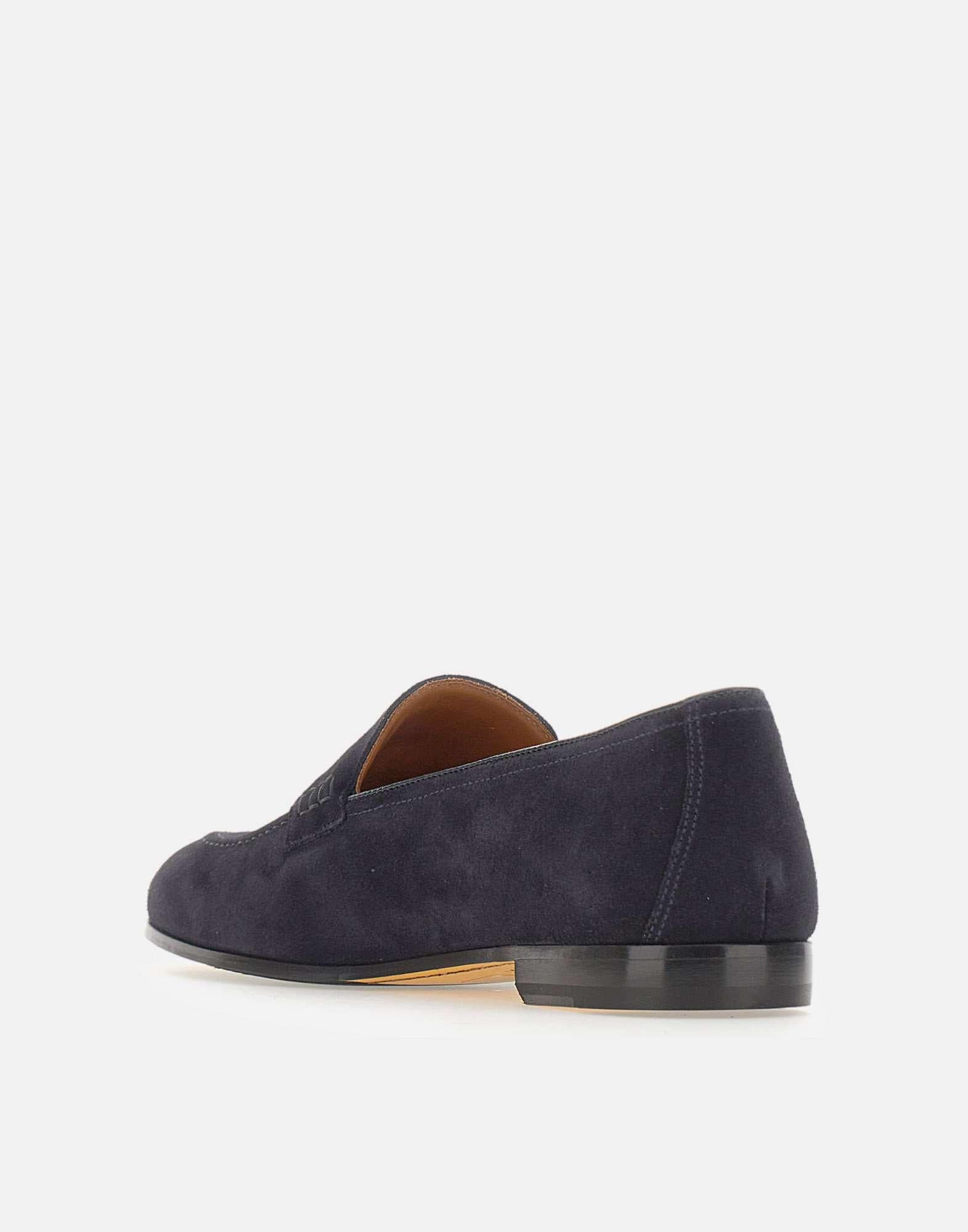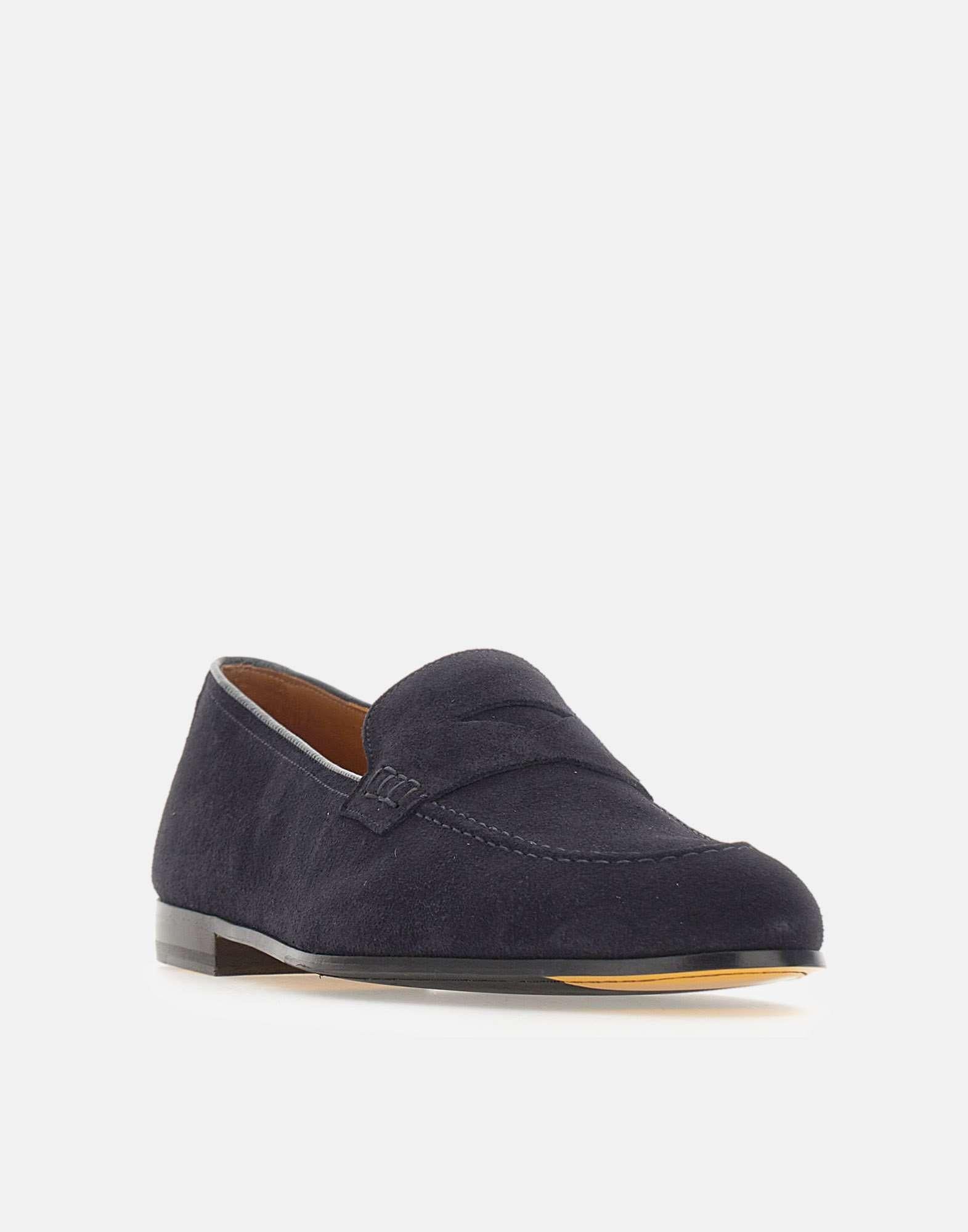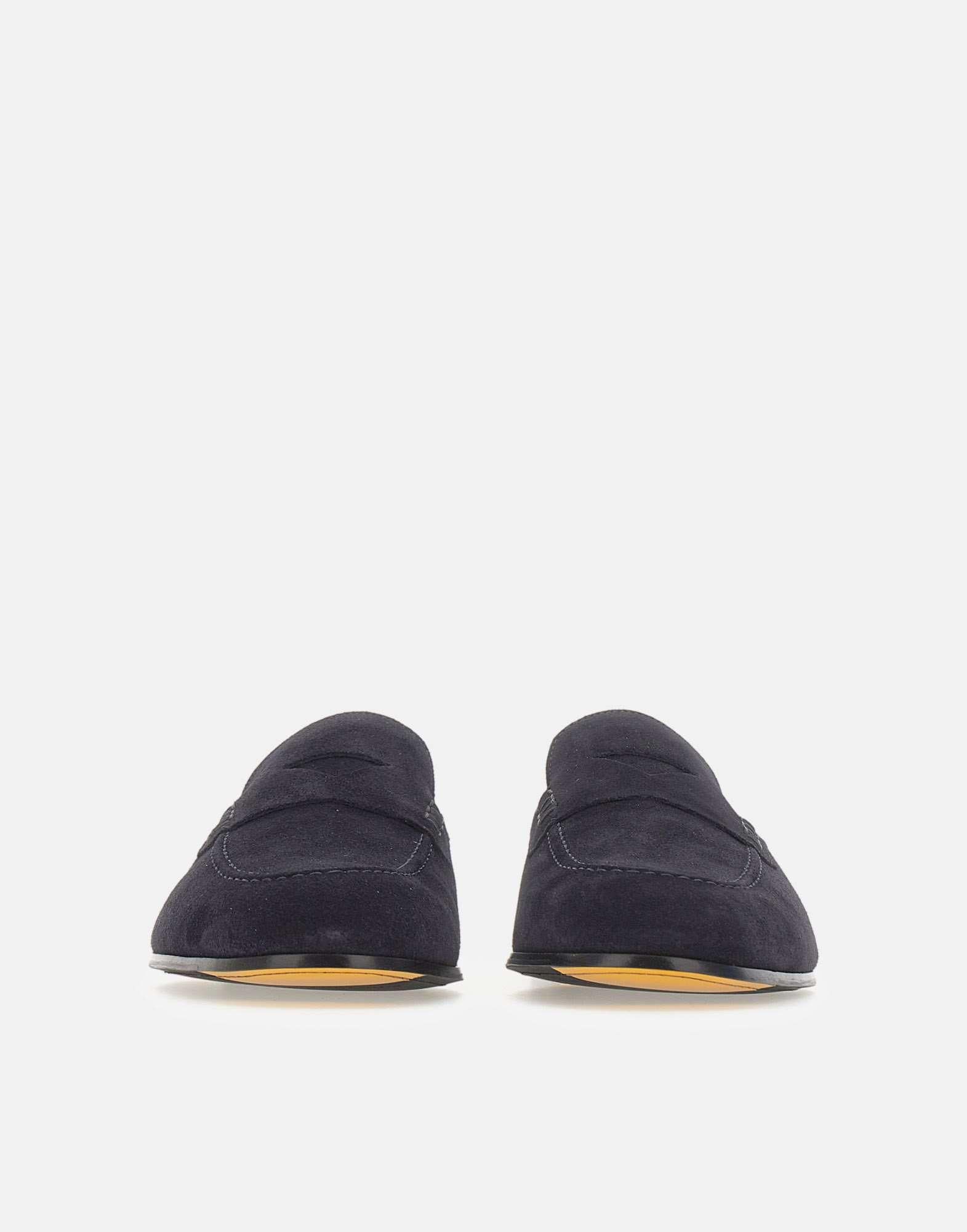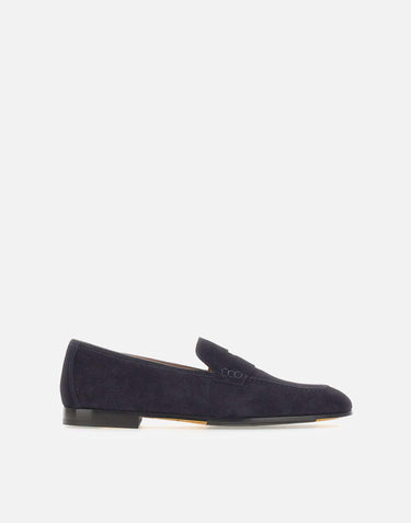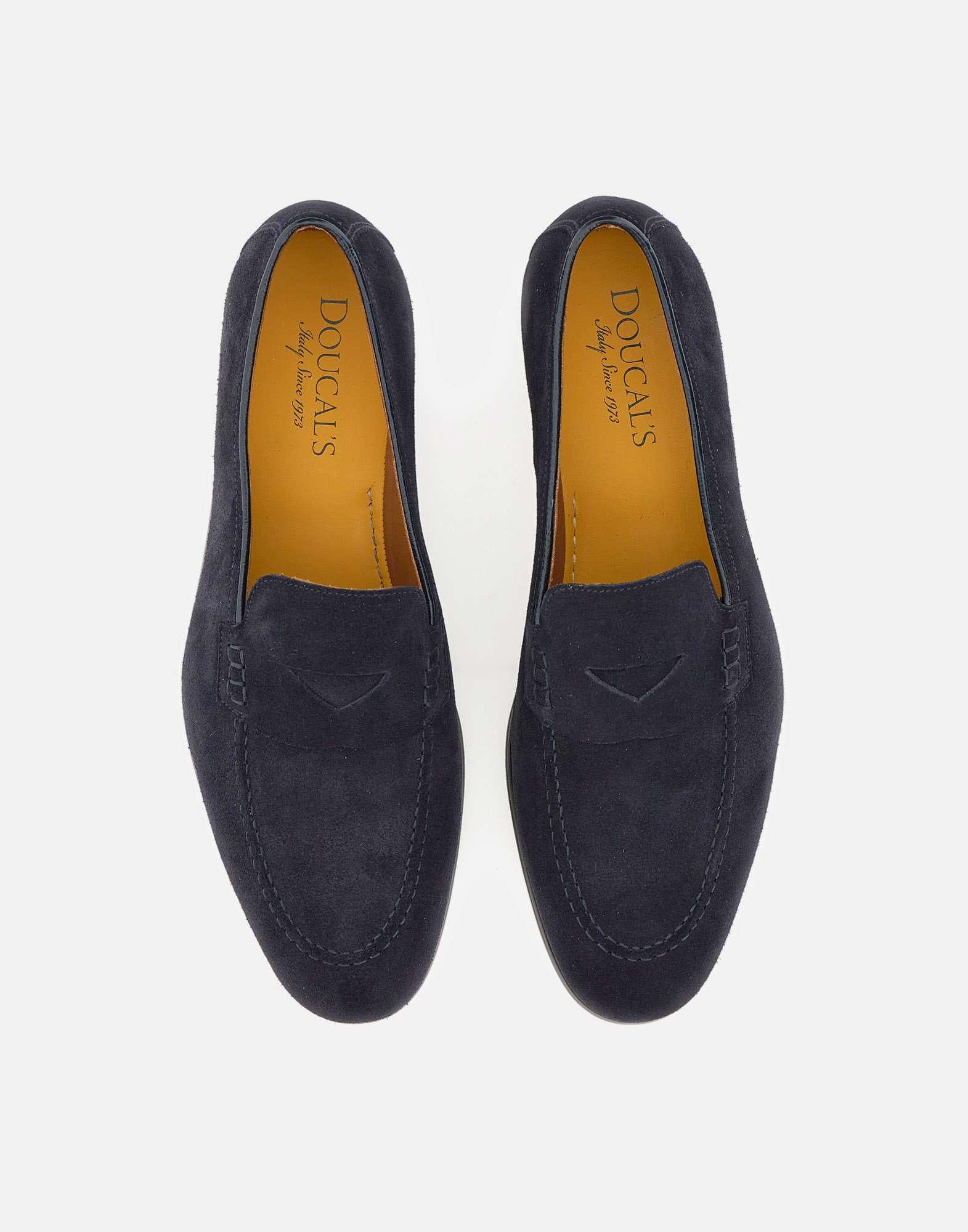 Mocassini Penny uomo Doucal's realizzati in pelle scamosciato color blu scuro, con forma affusolata dal carattere elegante. La costruzione a sacchetto e la cucitura a vaschetta definiscono un design classico e raffinato, mentre la lavorazione Blake rende la scarpa resistente e morbida nella calzata. Completa il modello la suola in cuoio nell'iconico giallo Golden Cream con mezza piantina in gomma. Altezza suola 2 cm. Made in Italy.