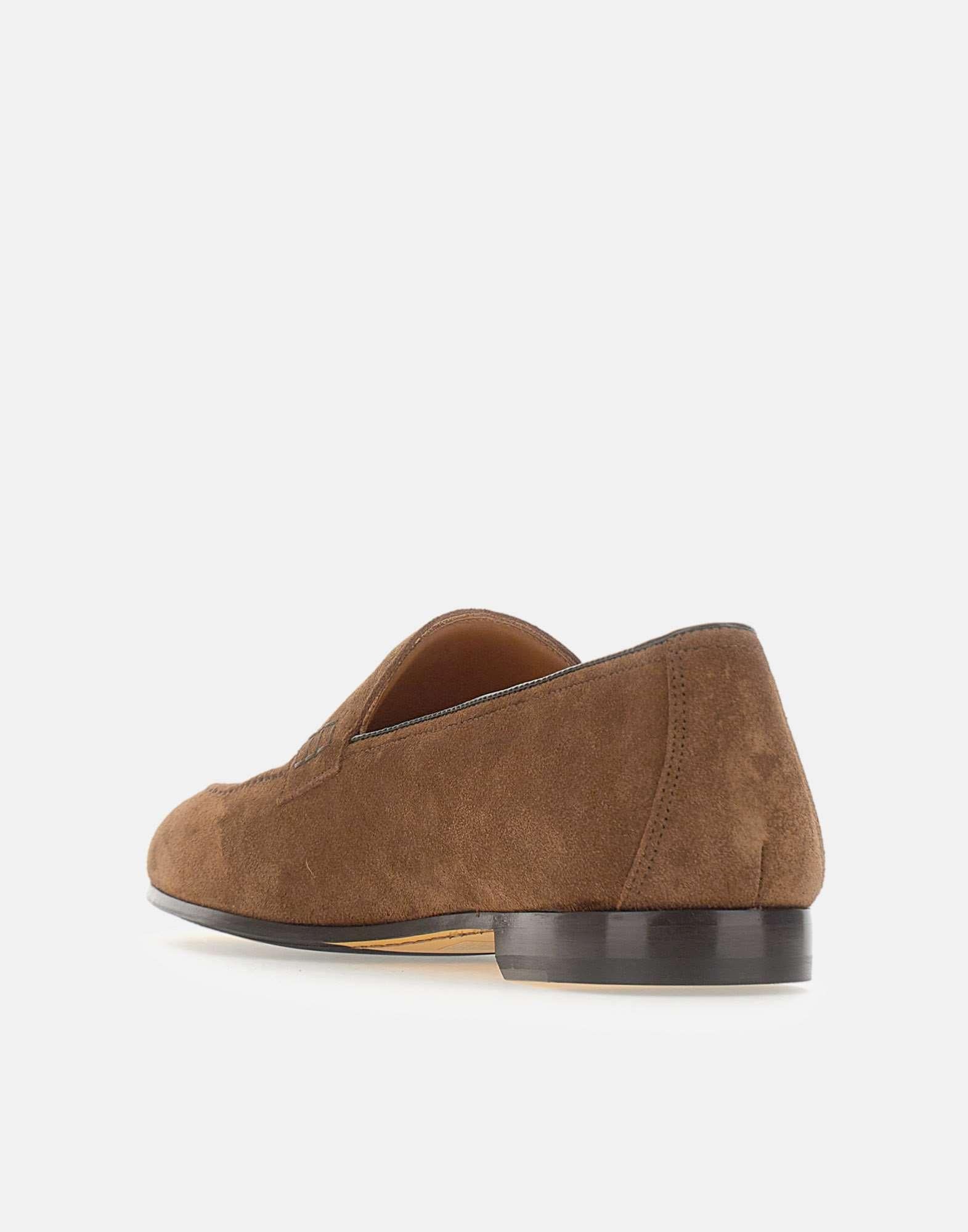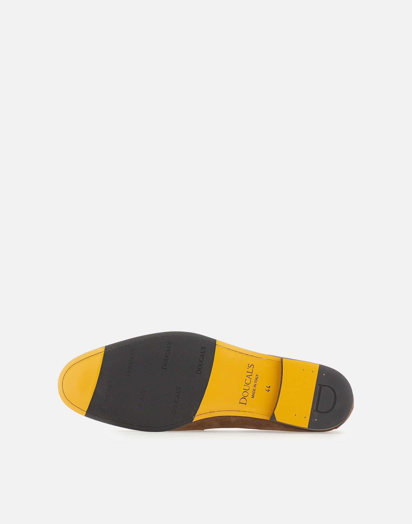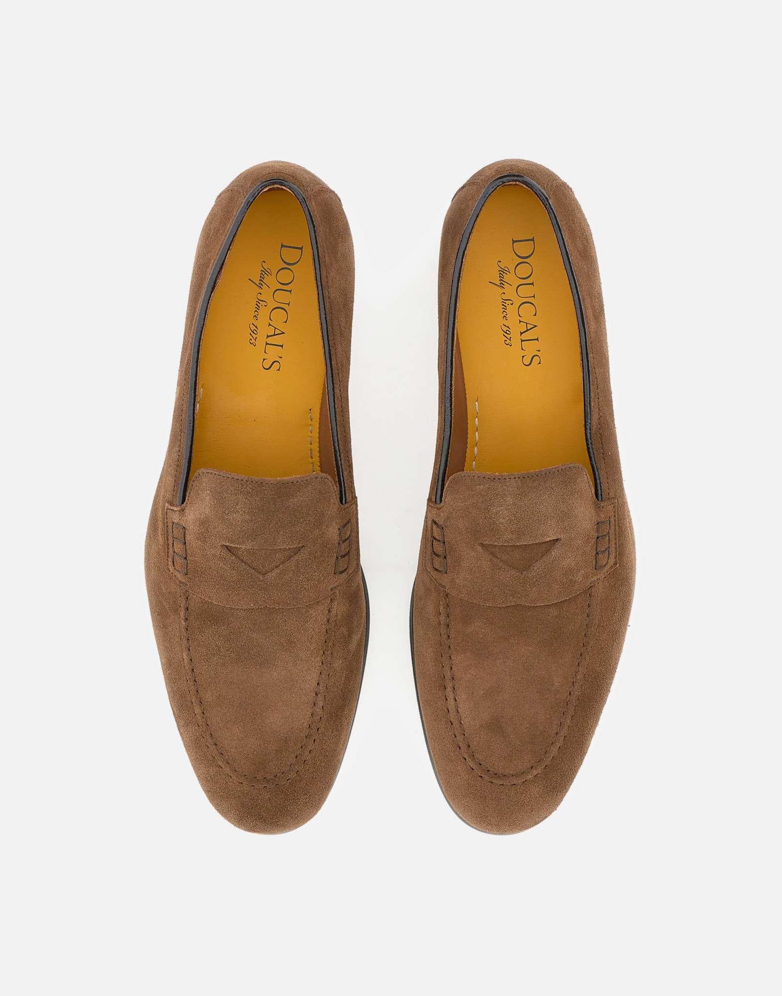 Mocassini Penny uomo Doucal's realizzati in pelle scamosciato color testa di moro, con forma affusolata dal carattere elegante. La costruzione a sacchetto e la cucitura a vaschetta definiscono un design classico e raffinato, mentre la lavorazione Blake rende la scarpa resistente e morbida nella calzata. Completa il modello la suola in cuoio nell'iconico giallo Golden Cream con mezza piantina in gomma. Altezza suola 2 cm. Made in Italy.